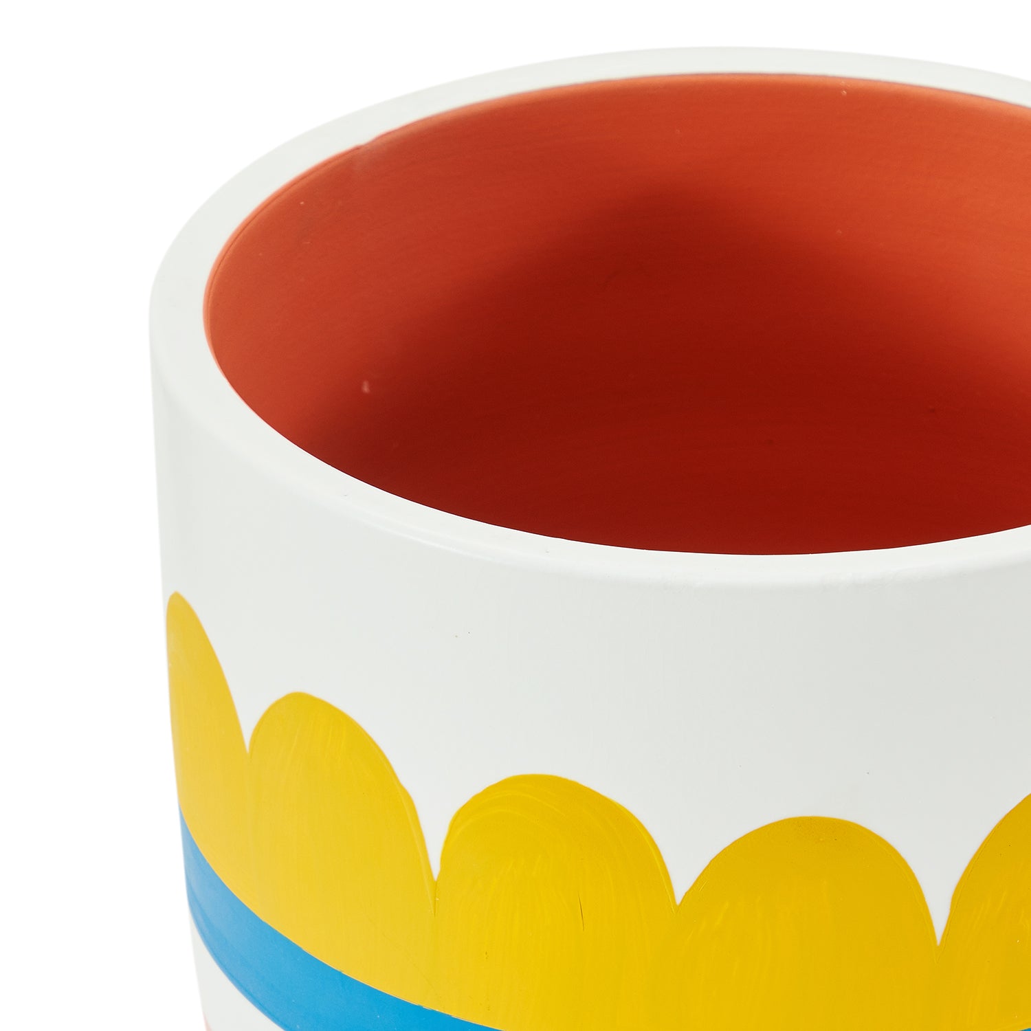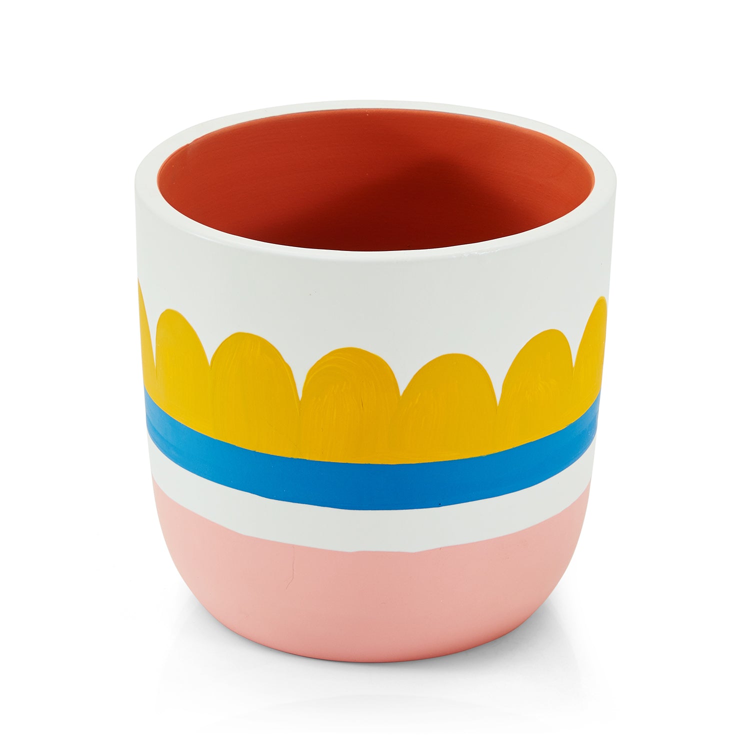 Details: Ceramic planter with yellow, white, blue, and pink detailing and a red interior Dimensions: 8" H x 9" W x 9" D Quantity: 1