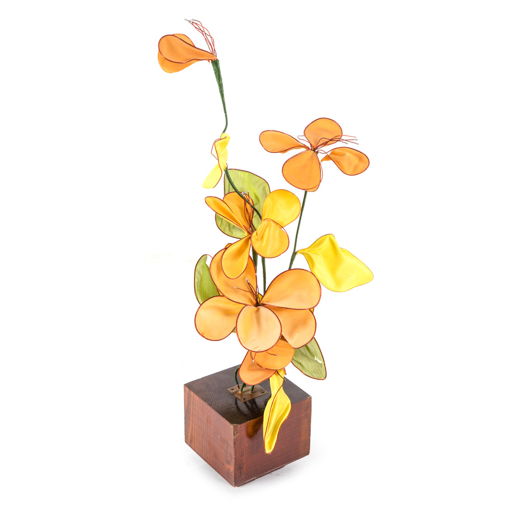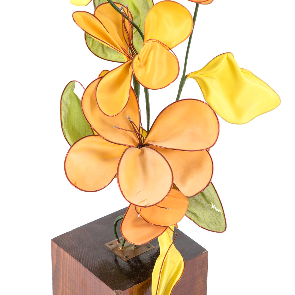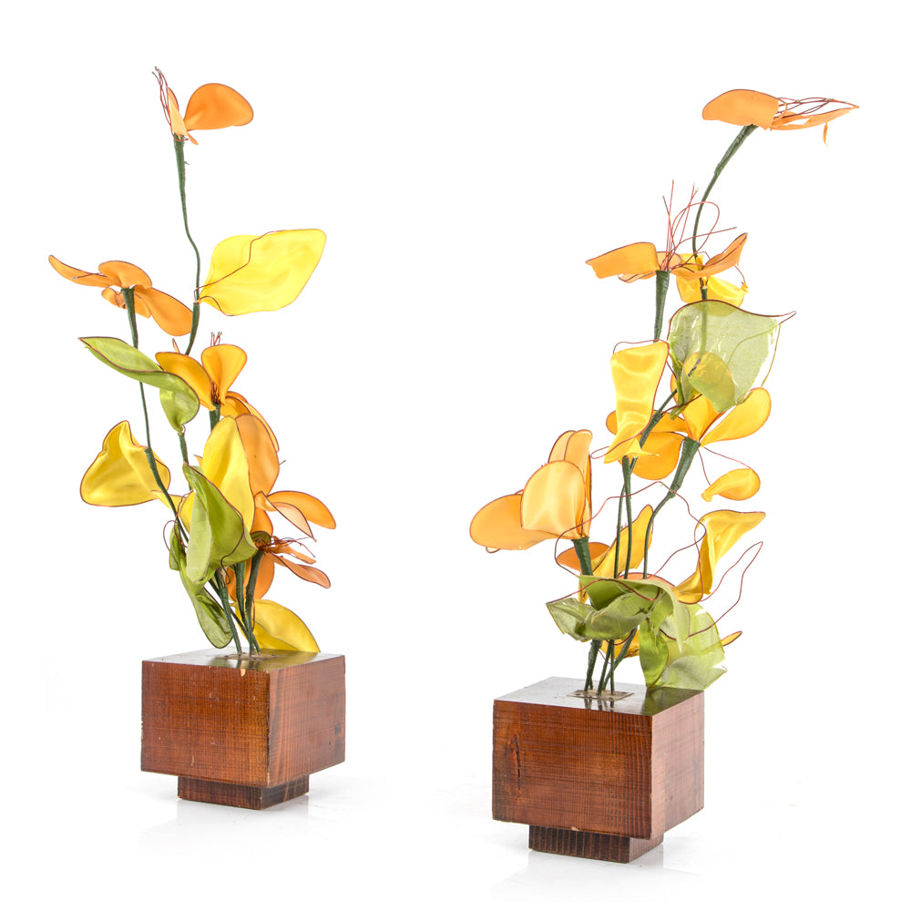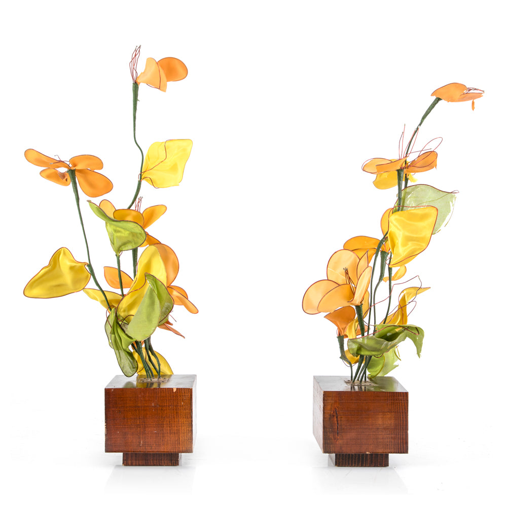 Details: Pair of wood cube planters with tall yellow stylized plants Dimensions: 24.5" H x 10.5" W x 11" D Quantity: 2