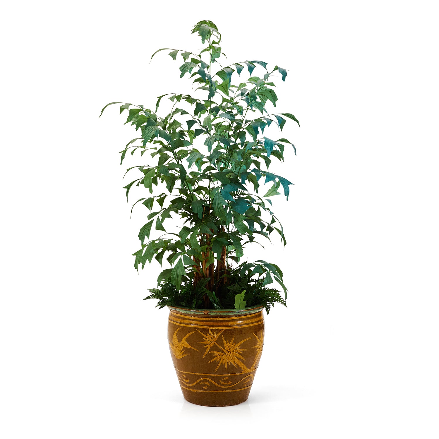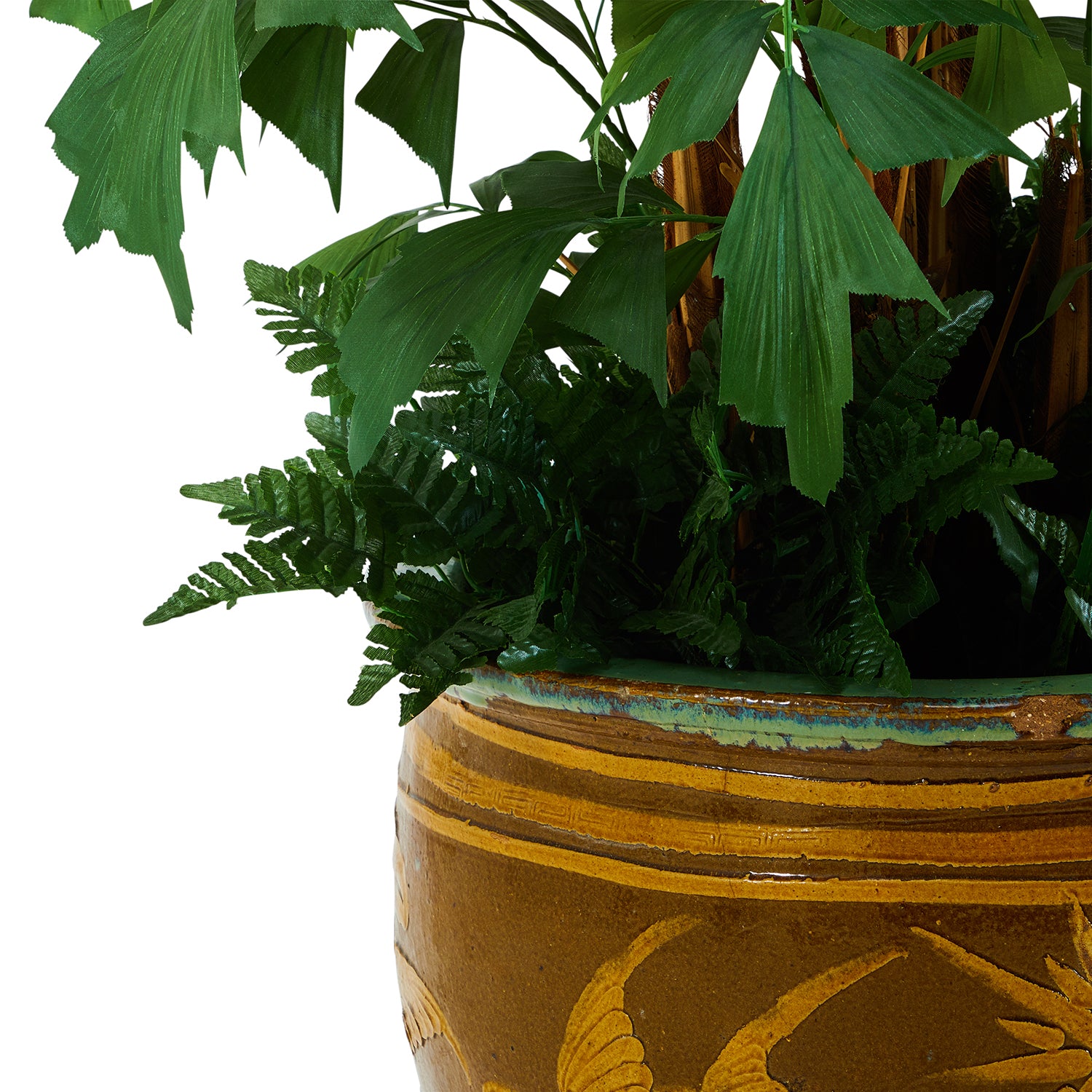 Details: Tall plastic plant with lush flora and ferns lining the base planted in a tasteful ceramic planter pot Dimensions: 75" H x 20" W...