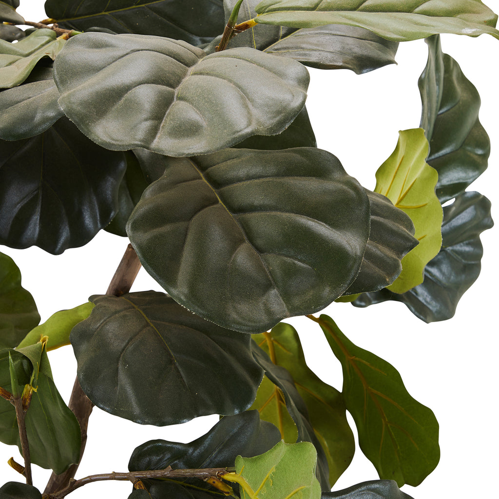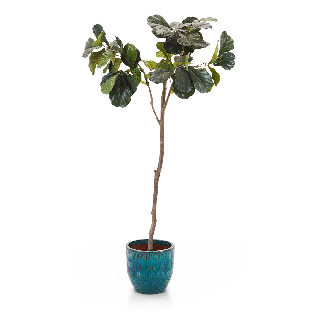 Details: Plastic fiddle leaf fig sapling in a blue ceramic planter pot Dimensions: 80" H x 35" W x 35" D Quantity: 1