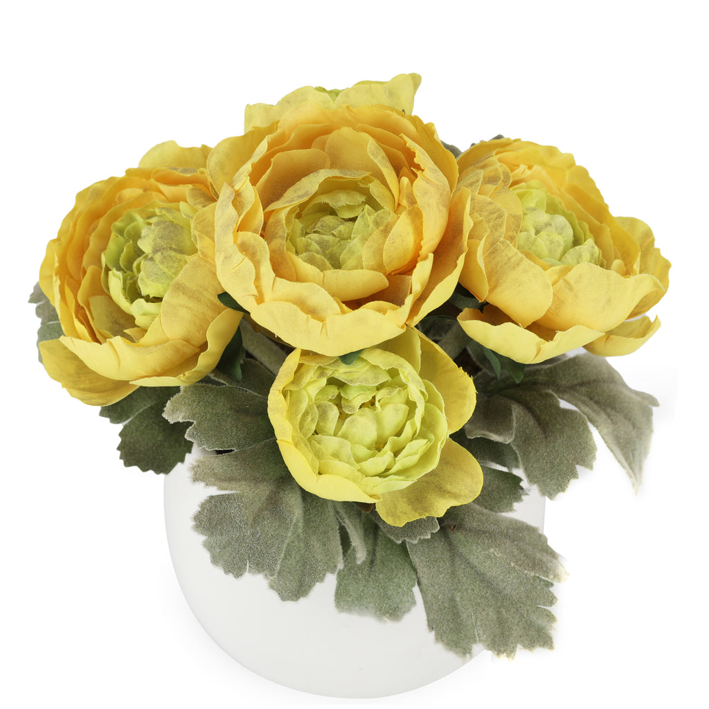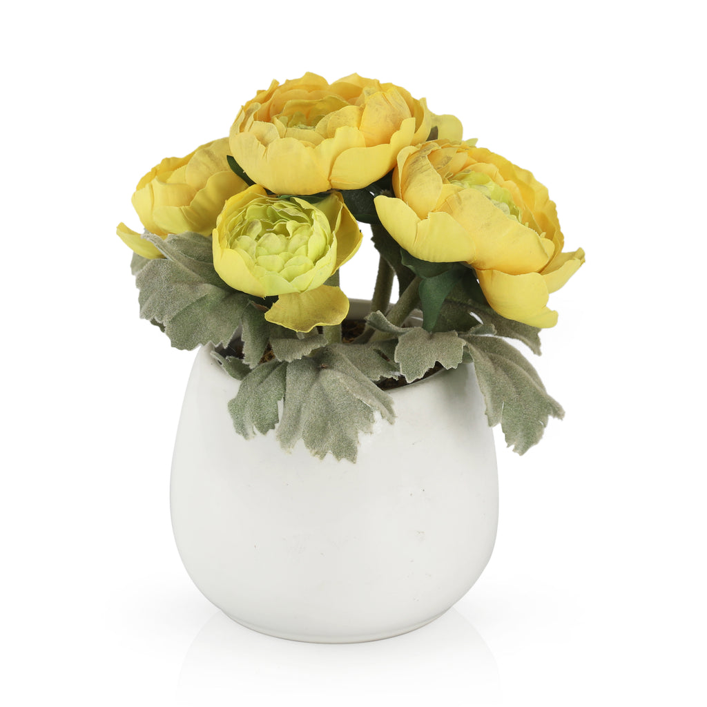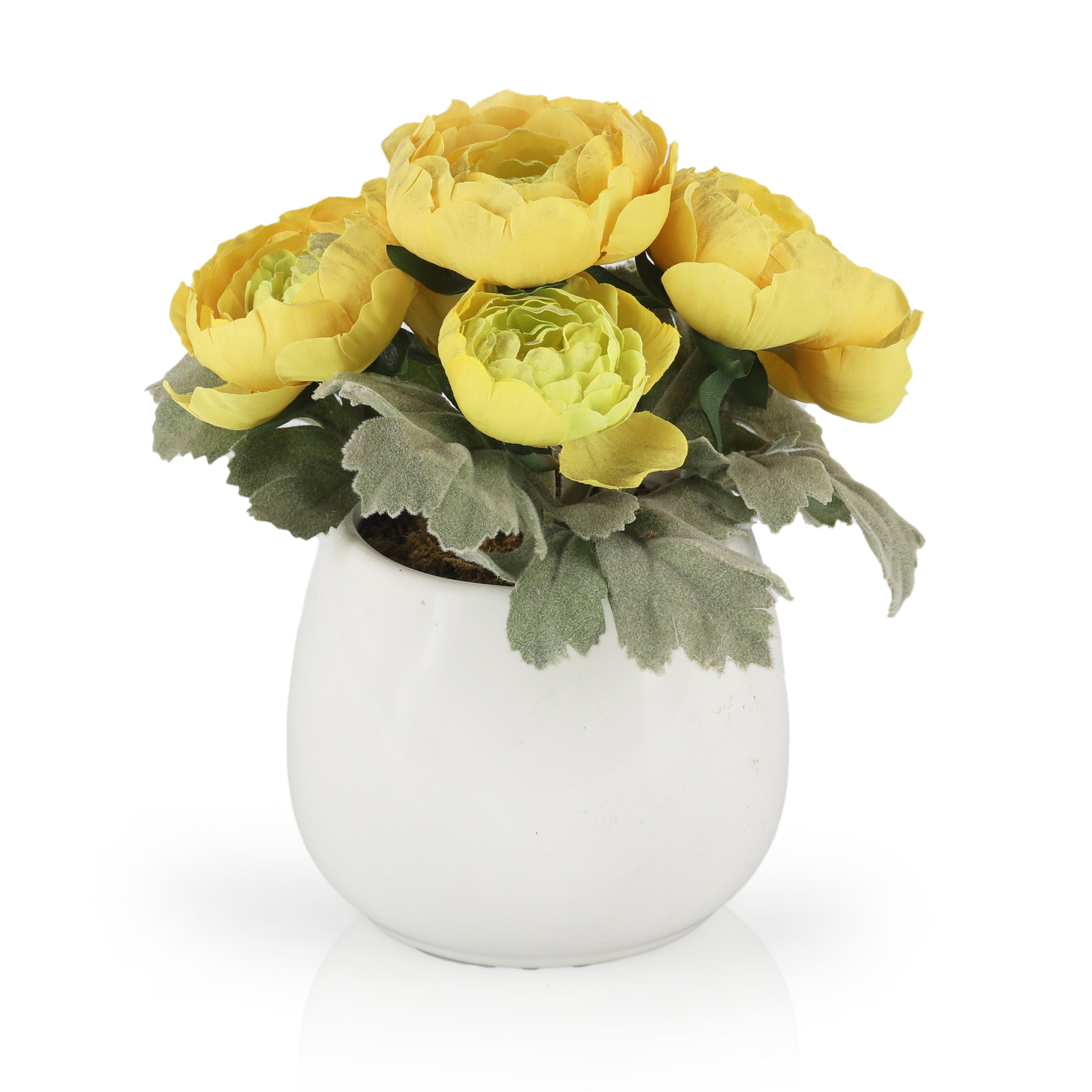 Details: Small faux flower in white pot. Dimensions: 7.5" H x 5" W x 5" D