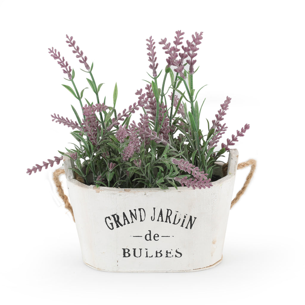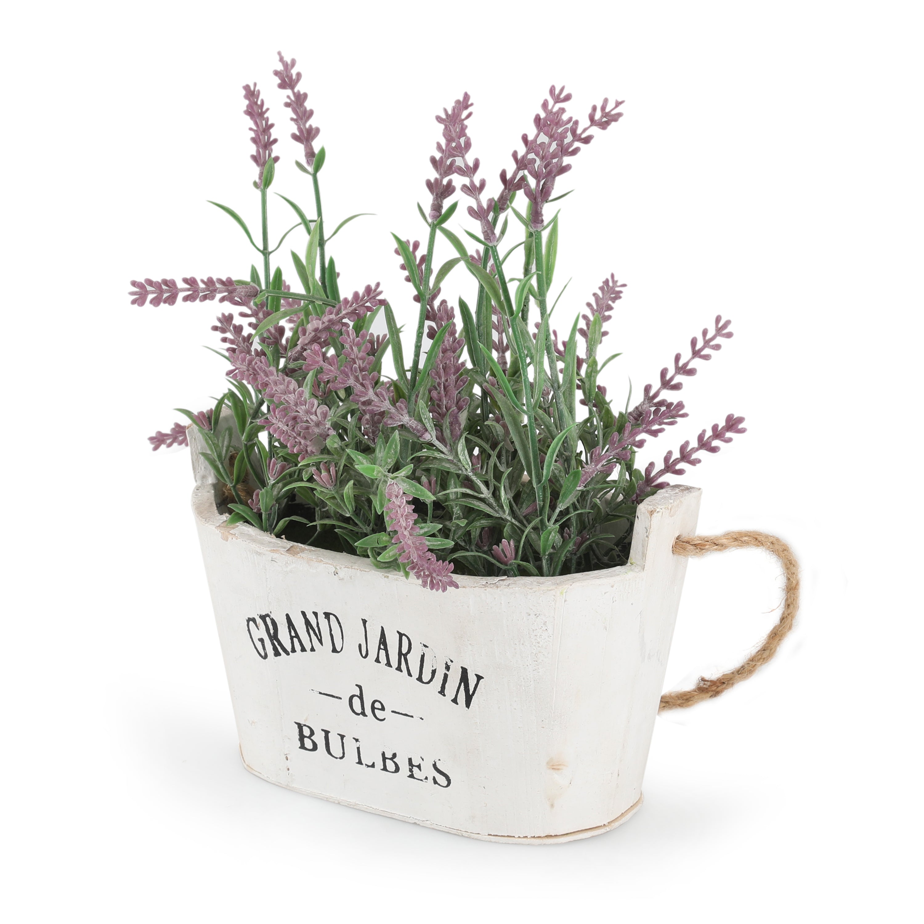 Details: Small faux lavender plant with hanging wooden pot. Grand Jardin de Bulbes print on front. Dimensions: 9" H x 7" W x 7" D ...