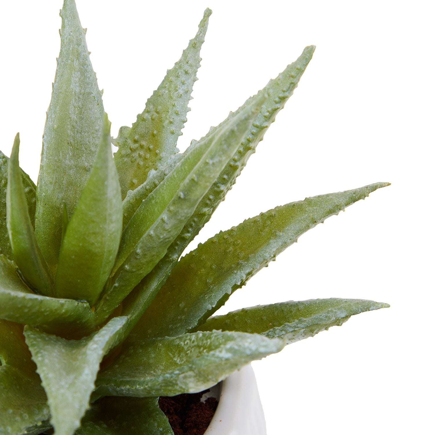 Details: Faux succulent aloe plant in a minimalist white pot Dimensions: 9" H x 7" W x 7" D Quantity: 1