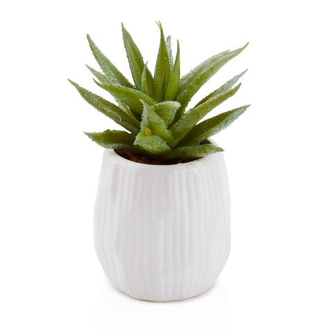 Details: Modern white pot with ridges and faux plant Dimensions: 8" H x 4.5" W x 4.5" D