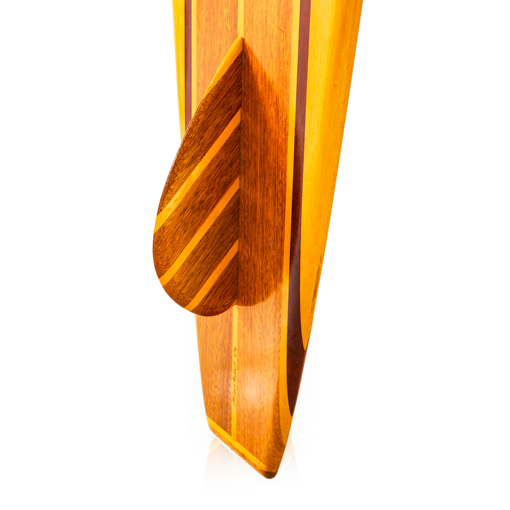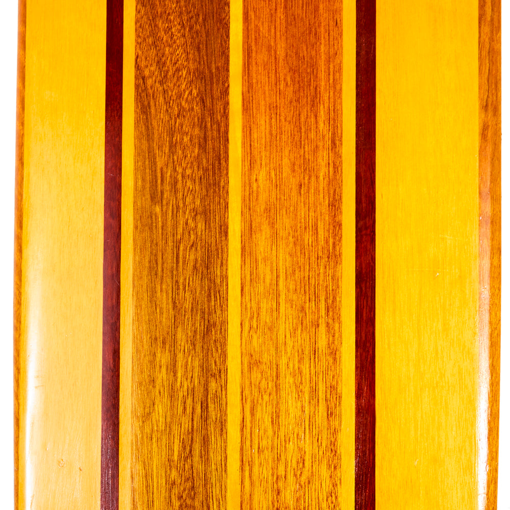Details: Smooth light wood surfboard with brown stripes