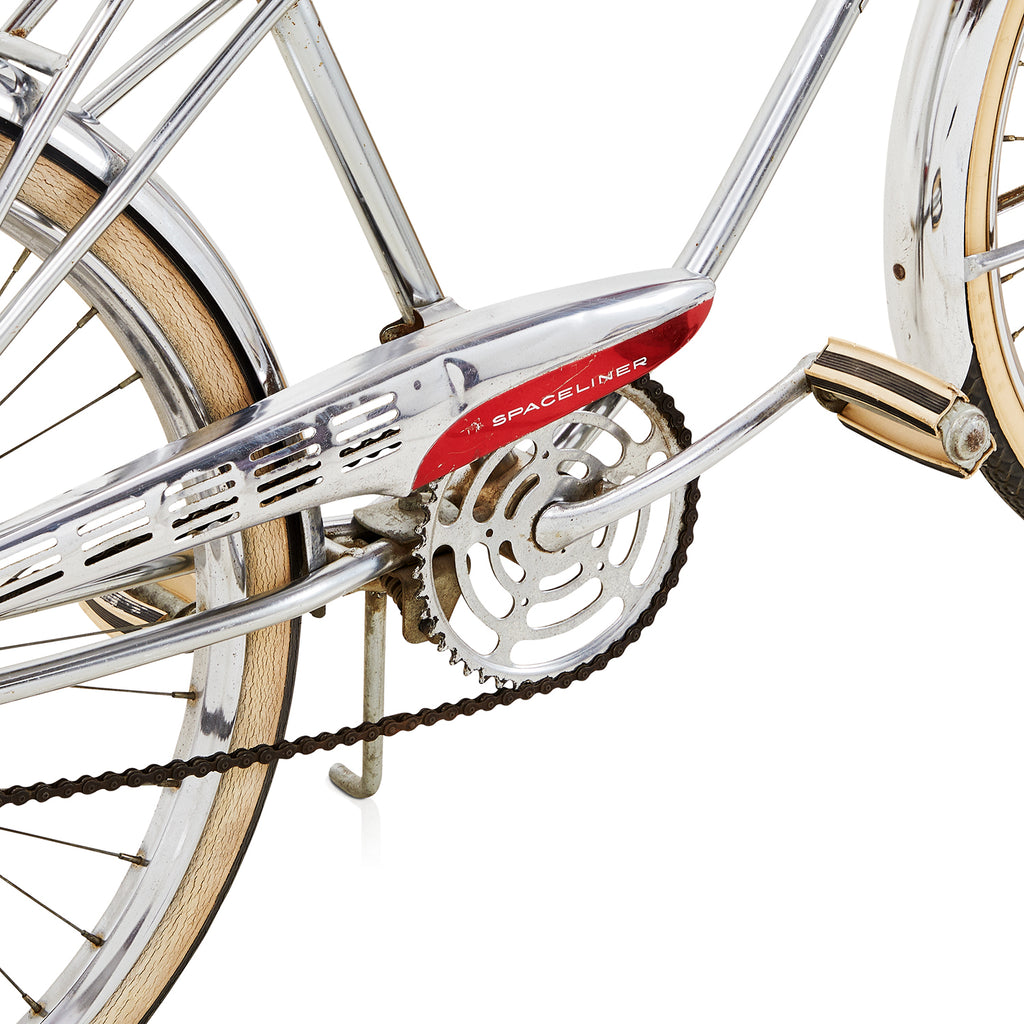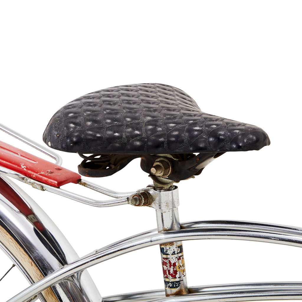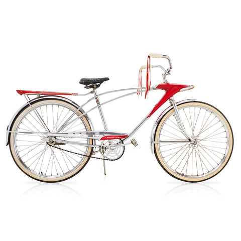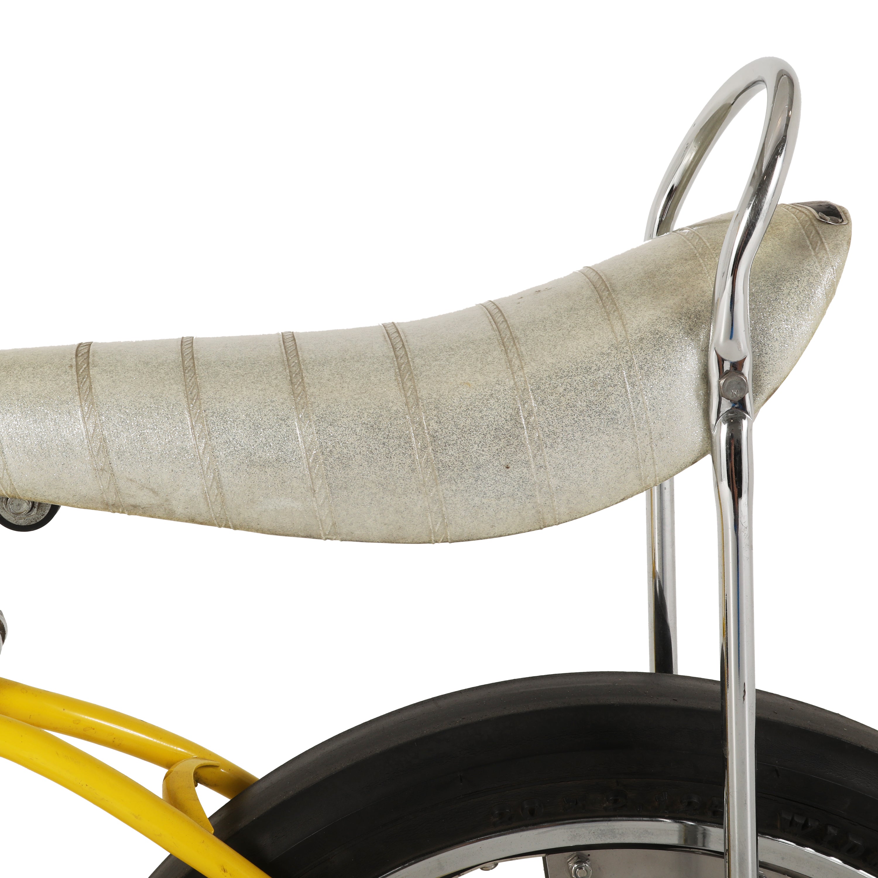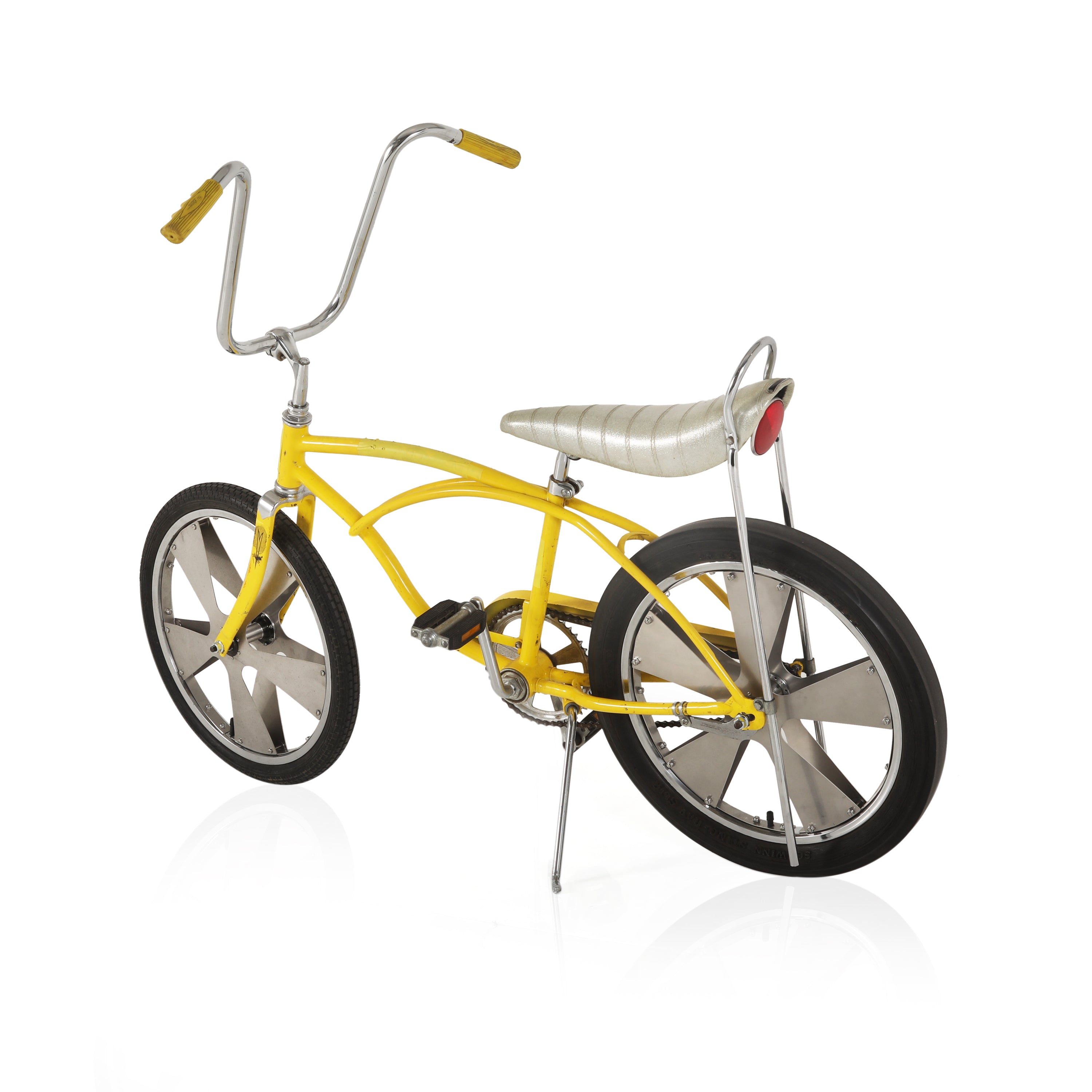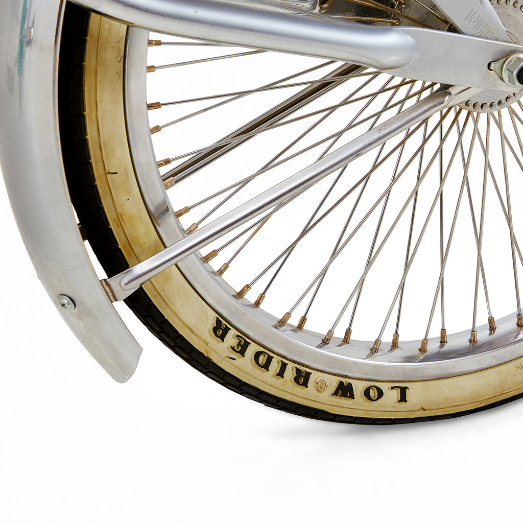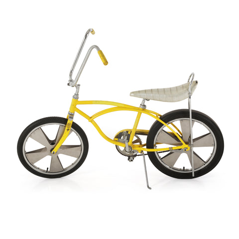 Details: Chrome low rider bicycle with a banana seat with a flame design, high ape-hanger handlebars, and an oversized gear shift on the crossbar Dimensions:...