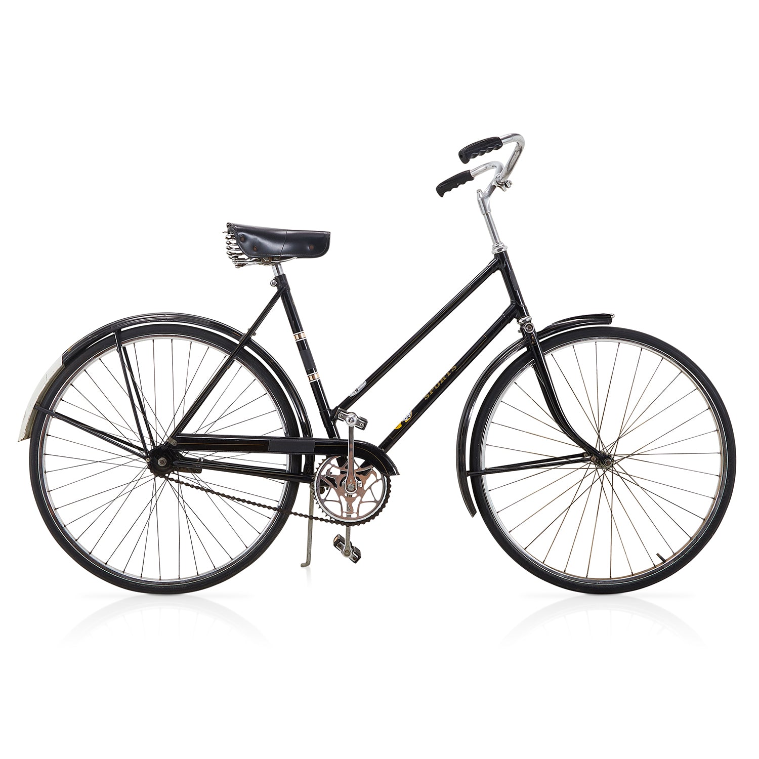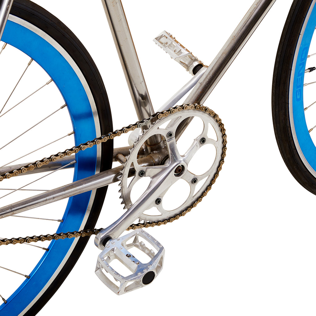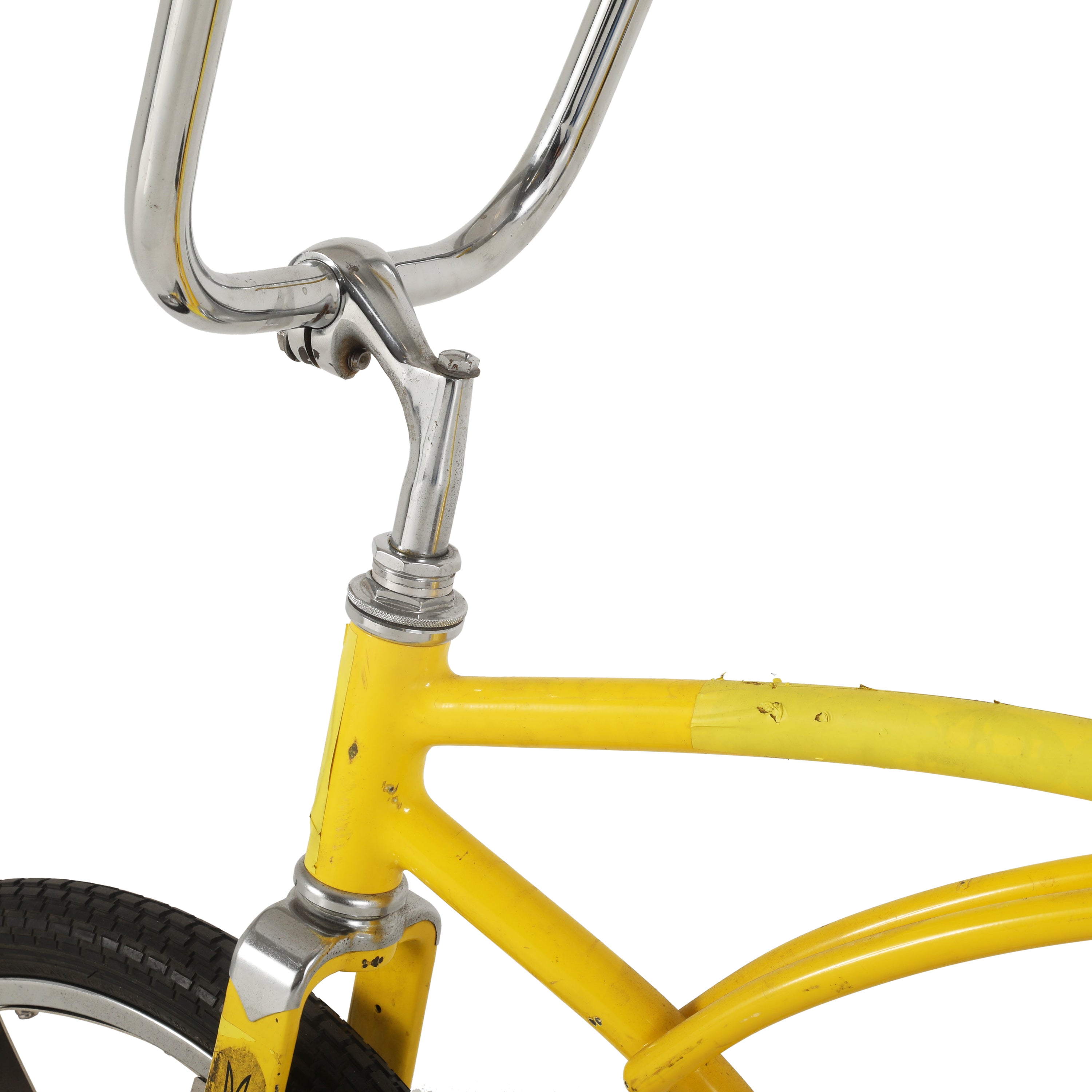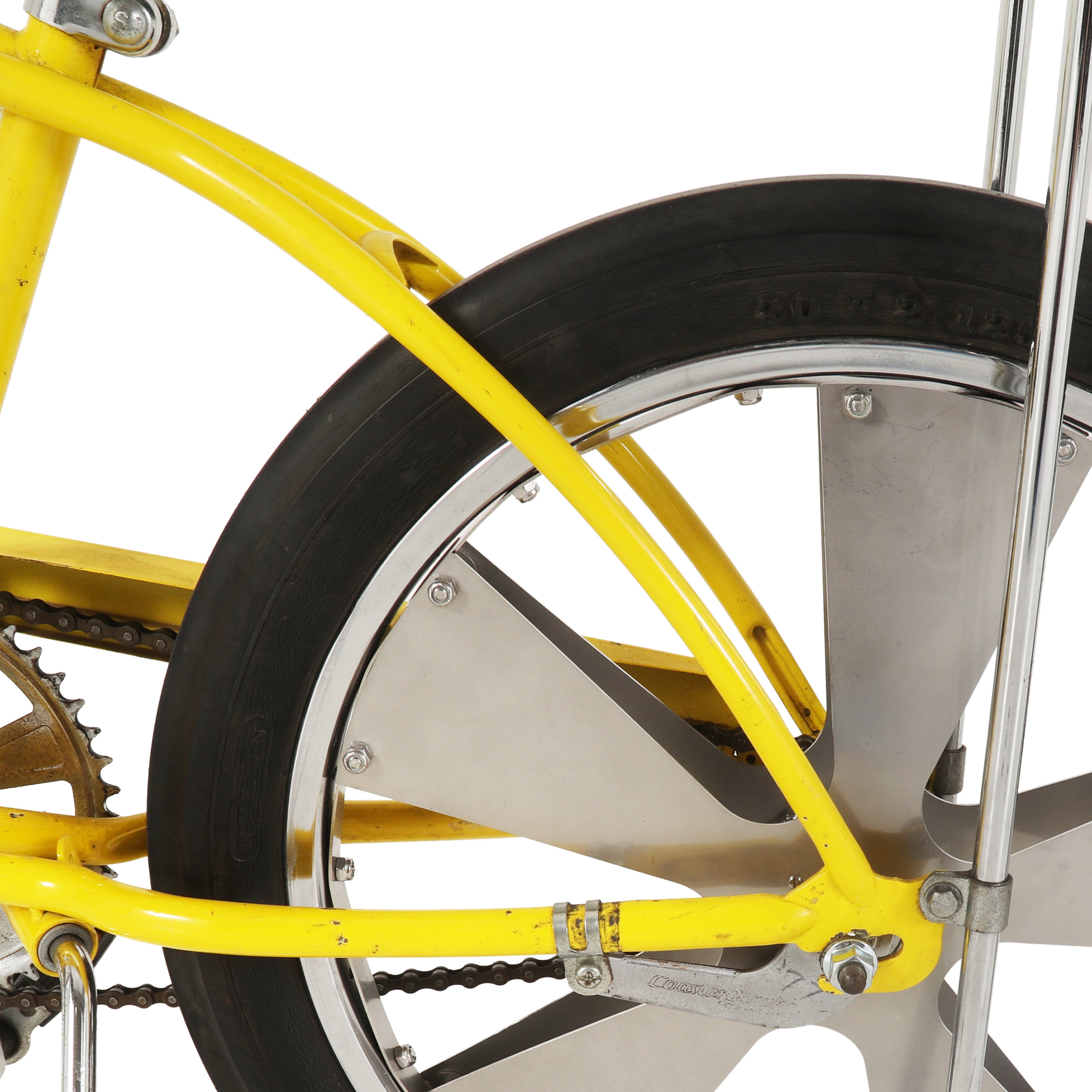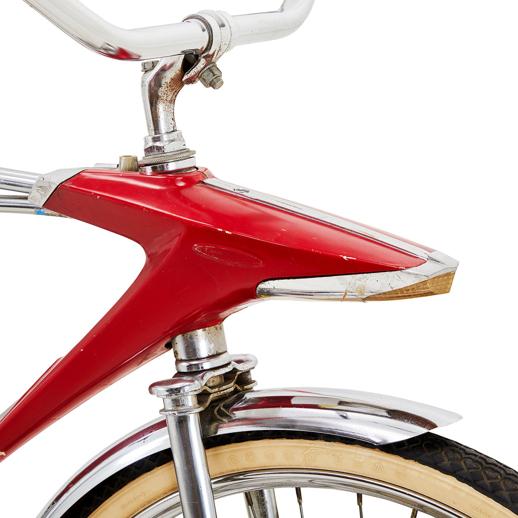 Details: Chrome low rider bicycle with a banana seat with a flame design, high ape-hanger handlebars, and an oversized gear shift on the crossbar Dimensions:...