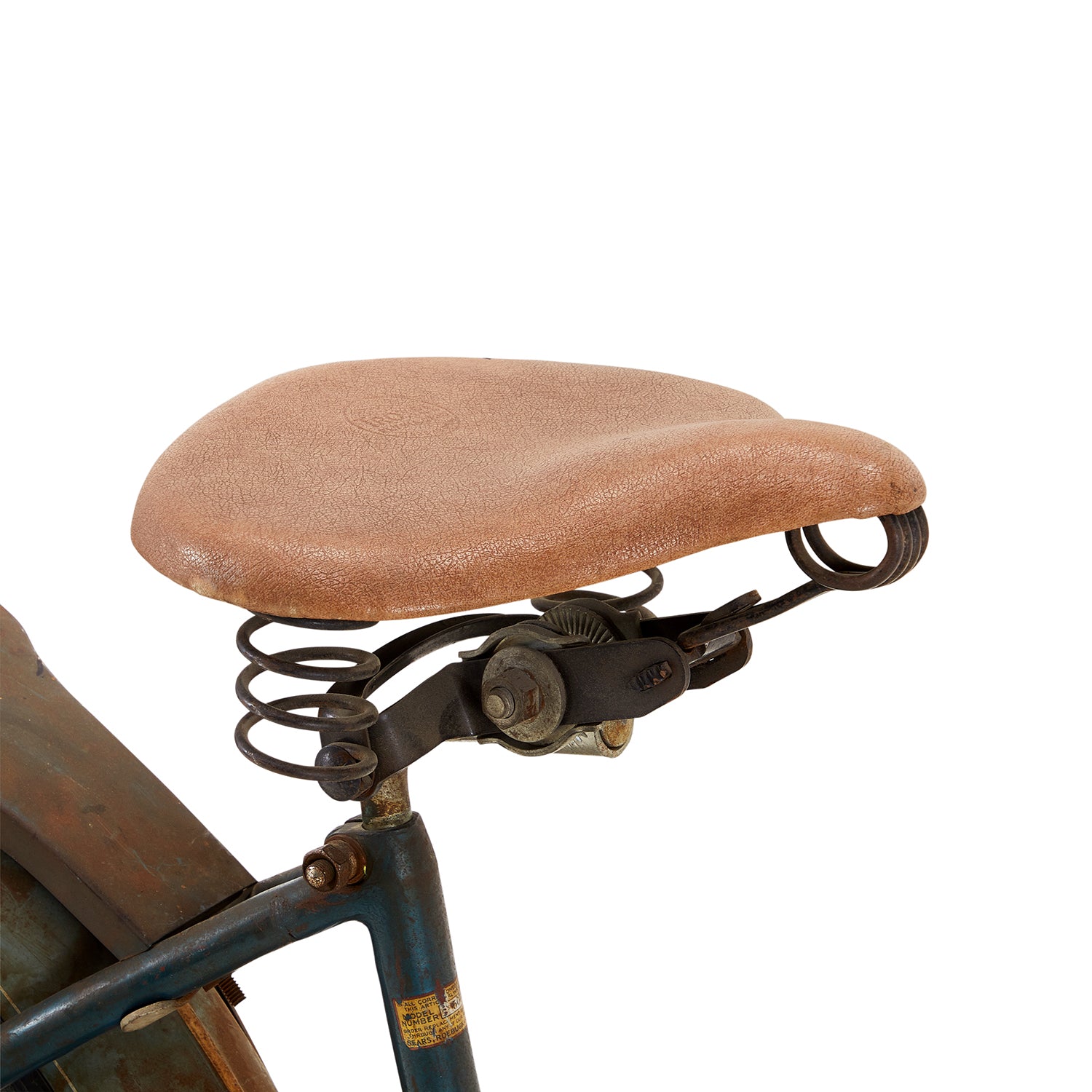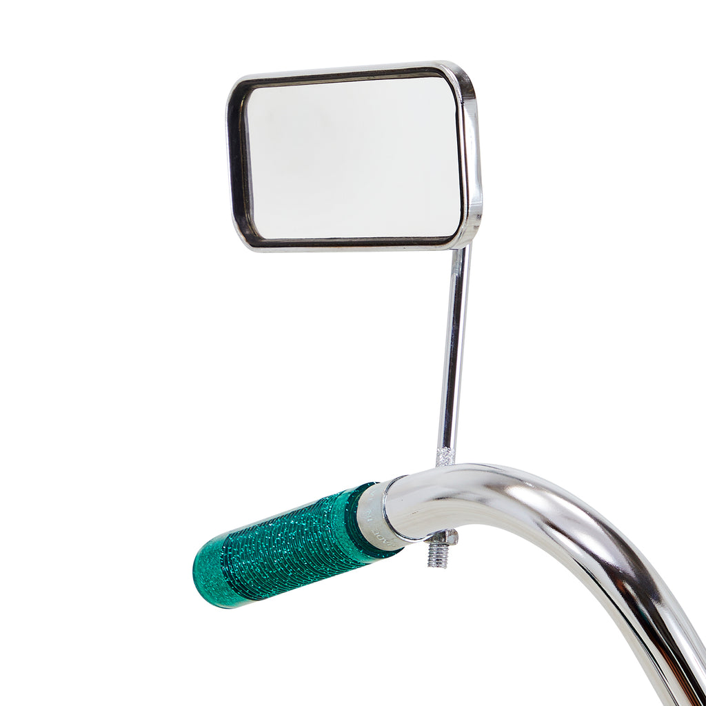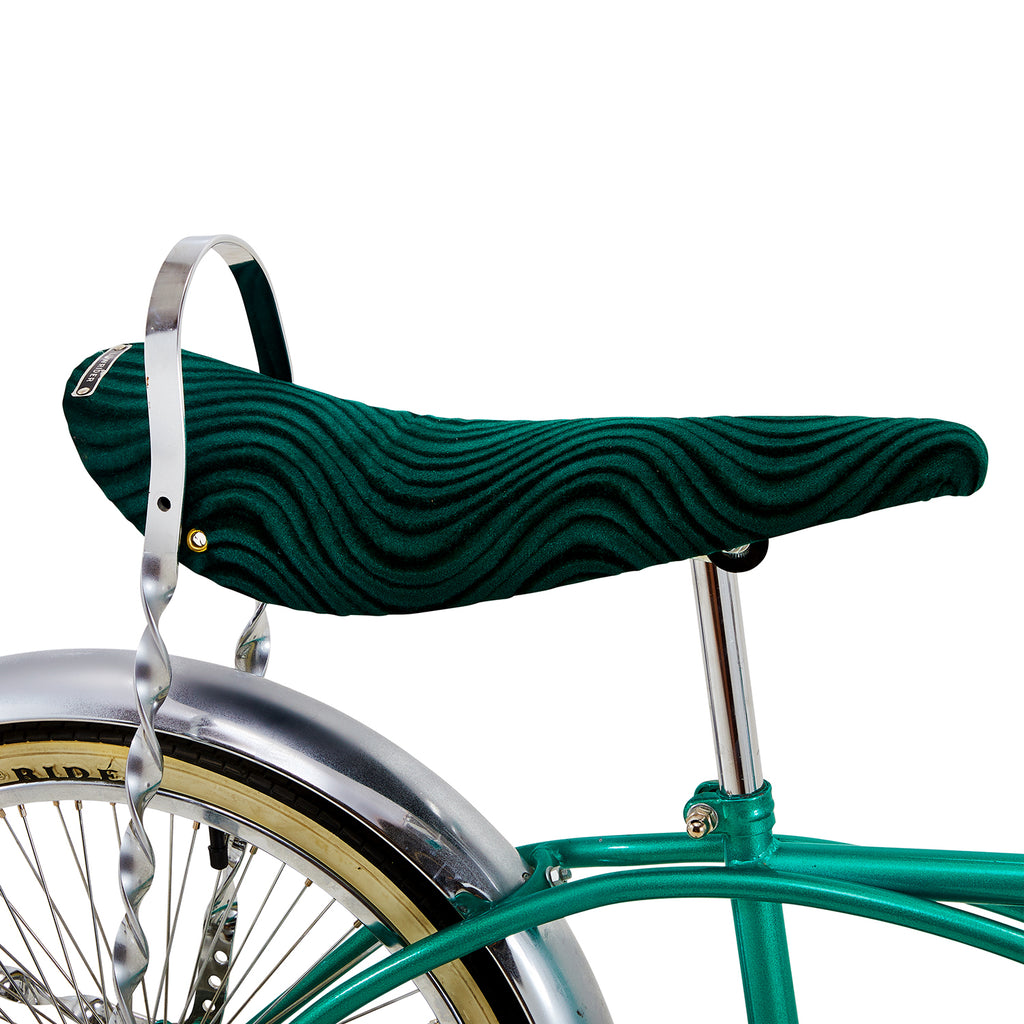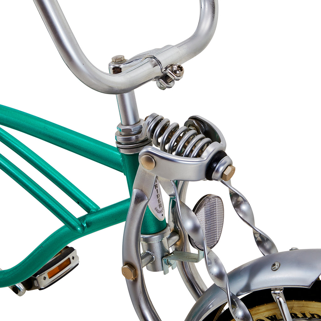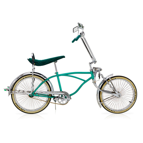 Details: Stylish teal low rider bicycle with high ape-hanger handlebars, banana seat, and twisted metal ribbon embellishments