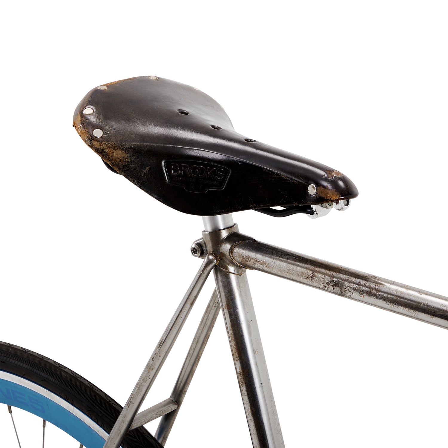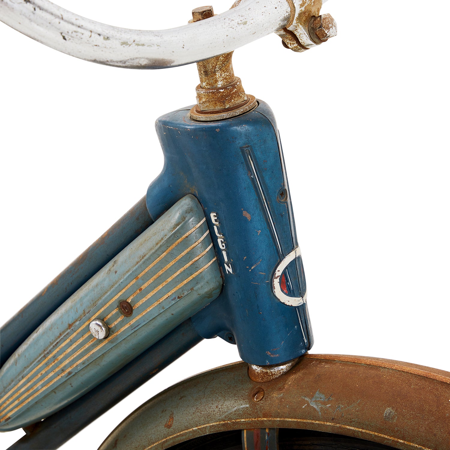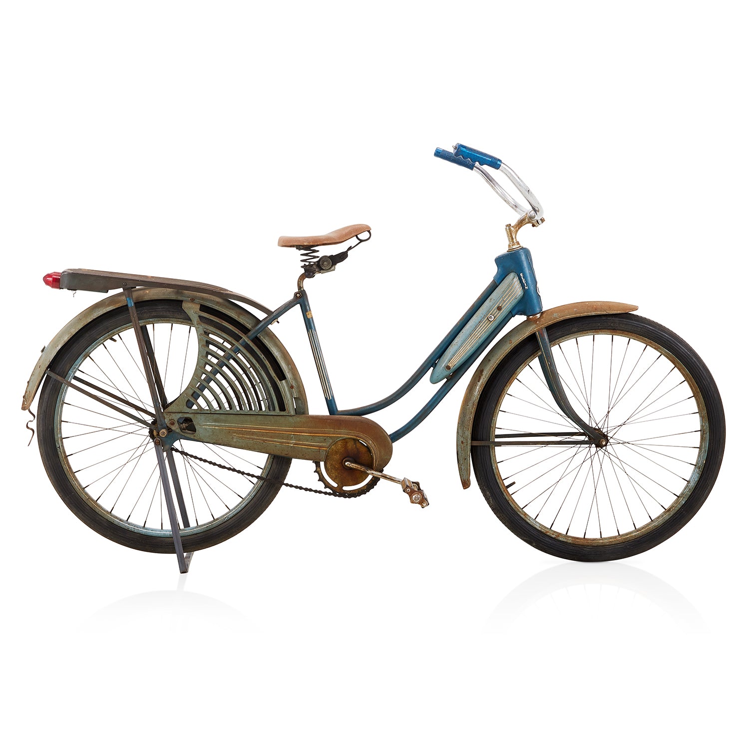 Details: Stylish teal low rider bicycle with high ape-hanger handlebars, banana seat, and twisted metal ribbon embellishments