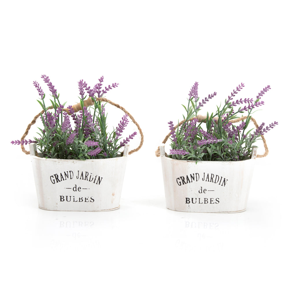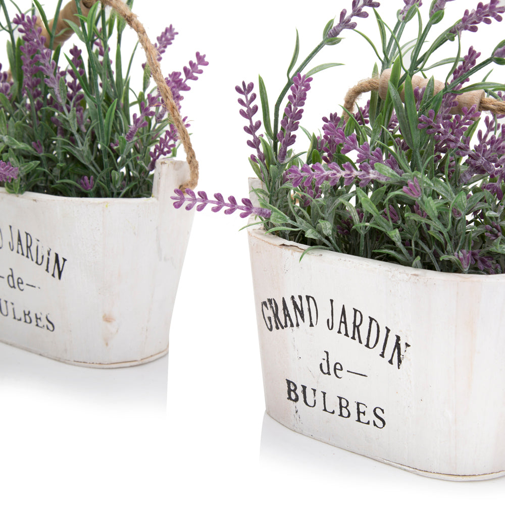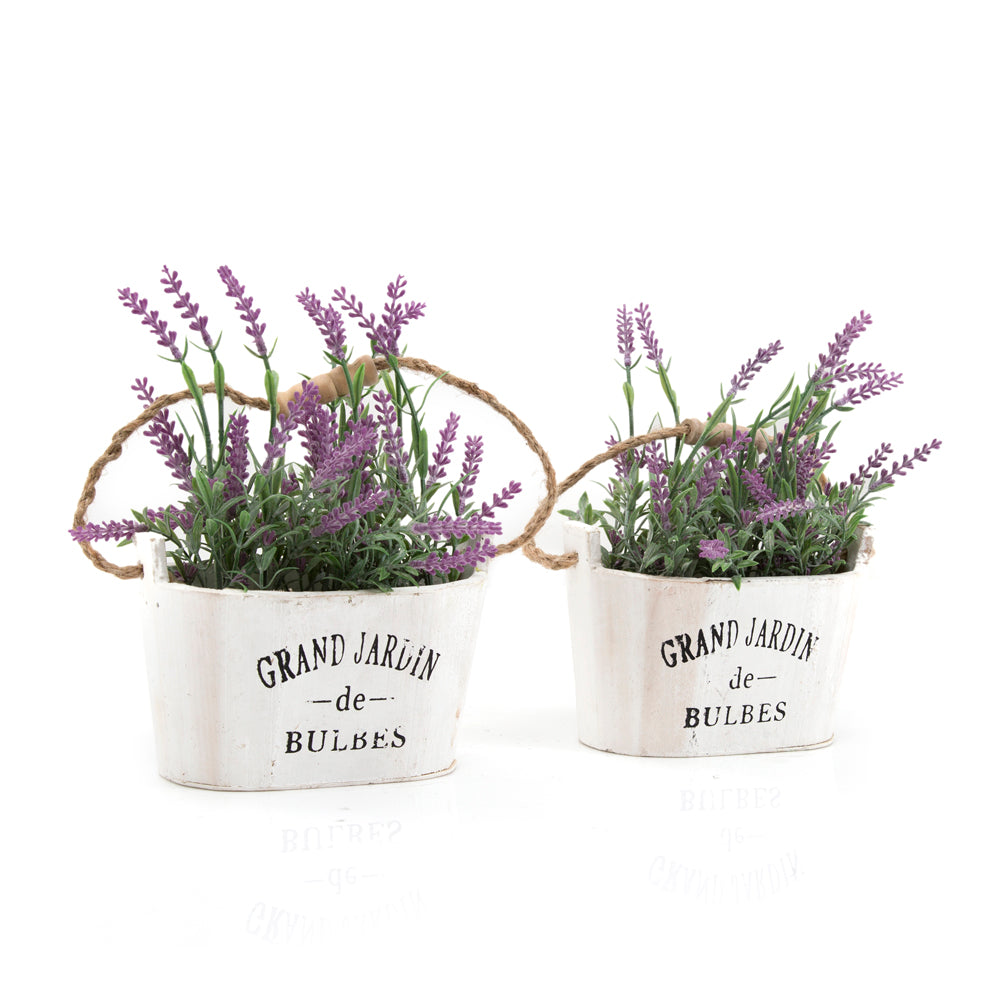 Details: Pair of wood hanging planters with faux lavender plants Dimensions: 9" H x 7" W x 4" D Quantity: 2