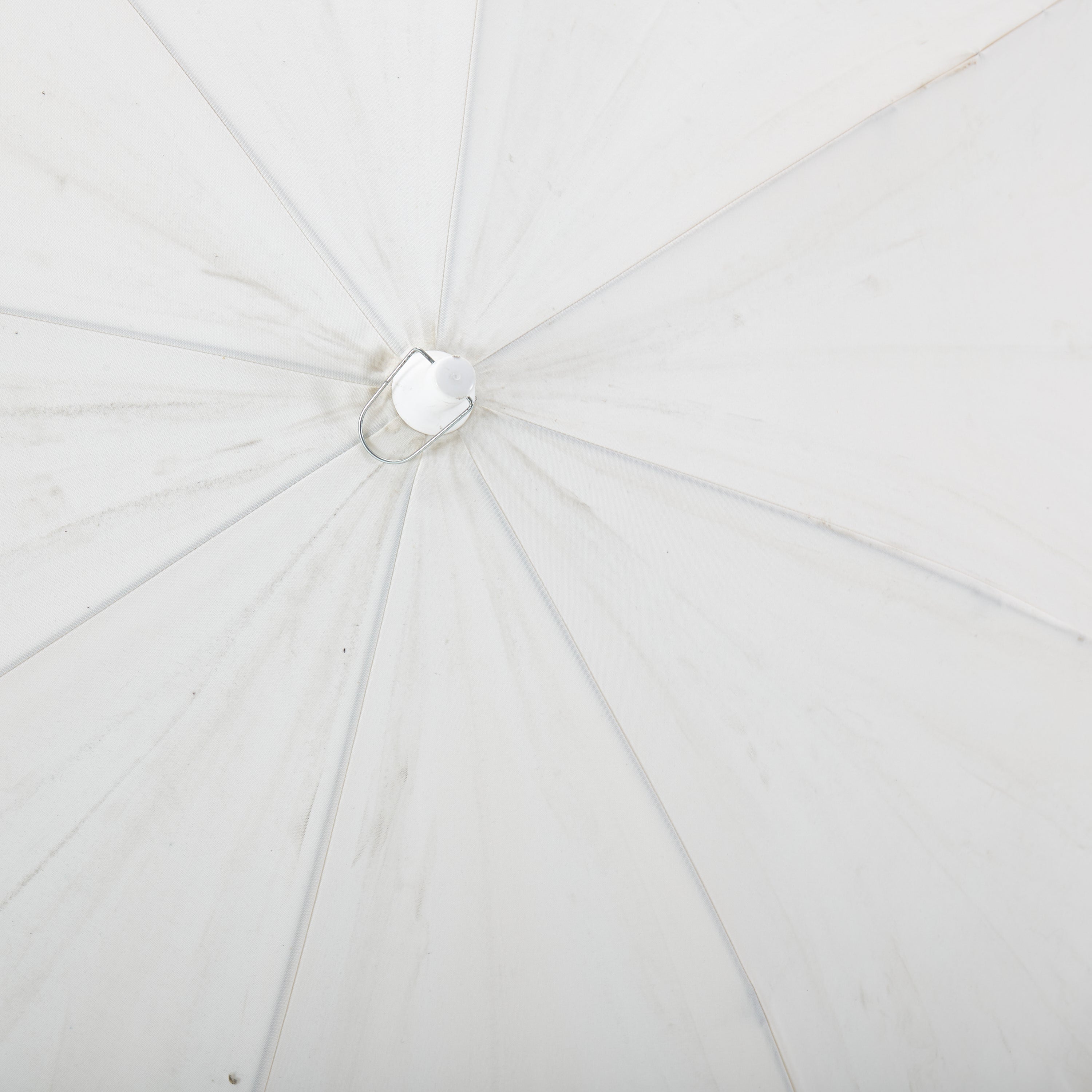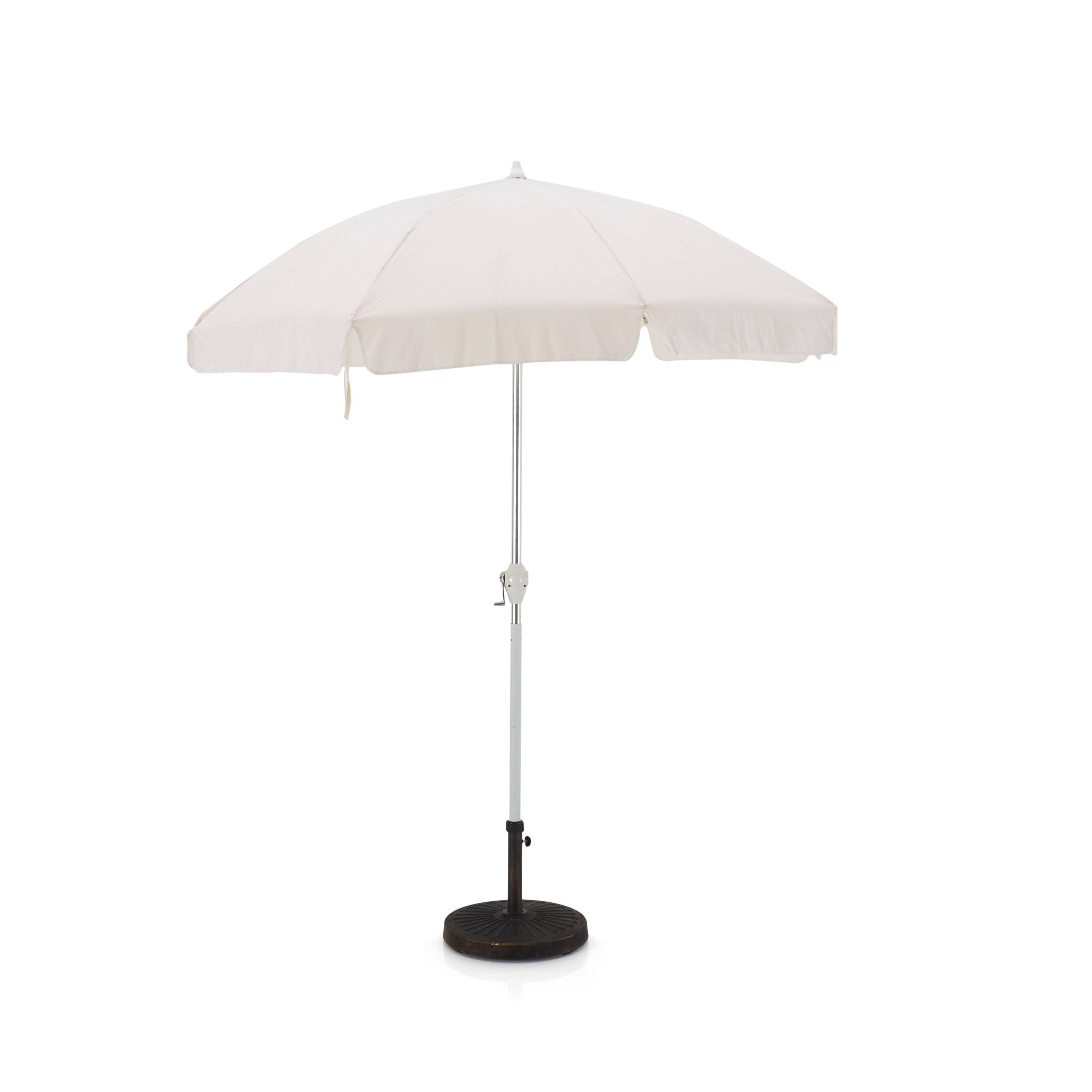 Description: Solid white patio umbrella with black metal base. Umbrella is constructed of durable fabric, metal and plastic. Dimensions: 93" H x 72" W x...