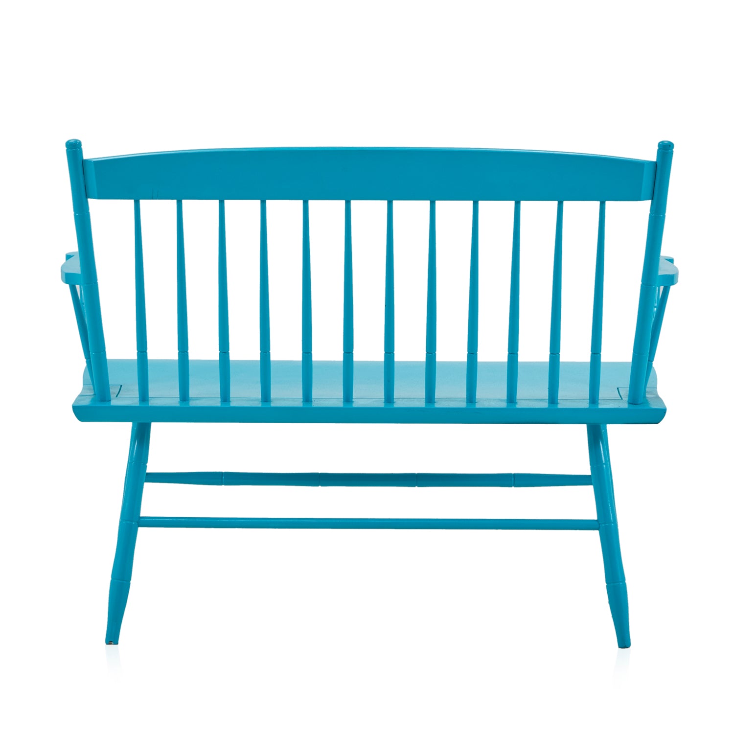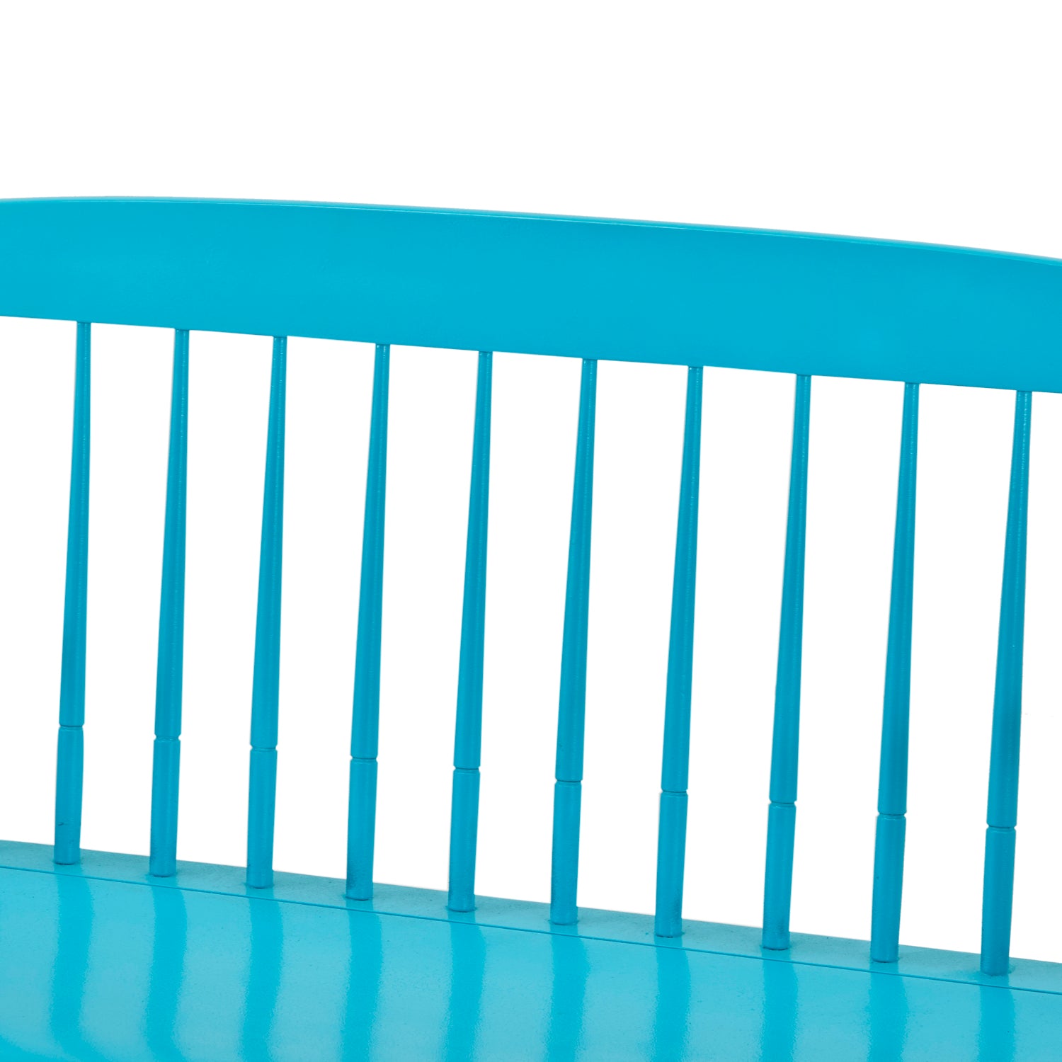 Details: Turquoise painted outdoor wooden bench with spindle back and arms