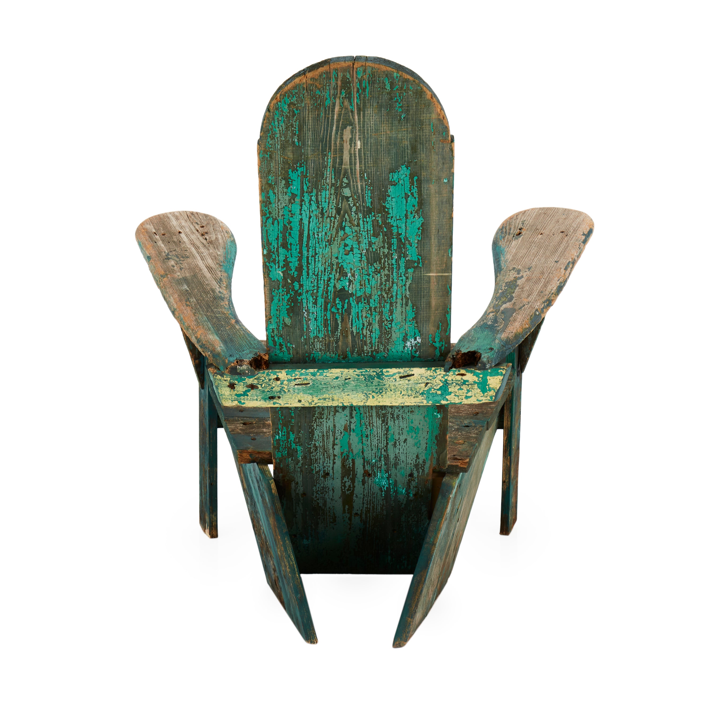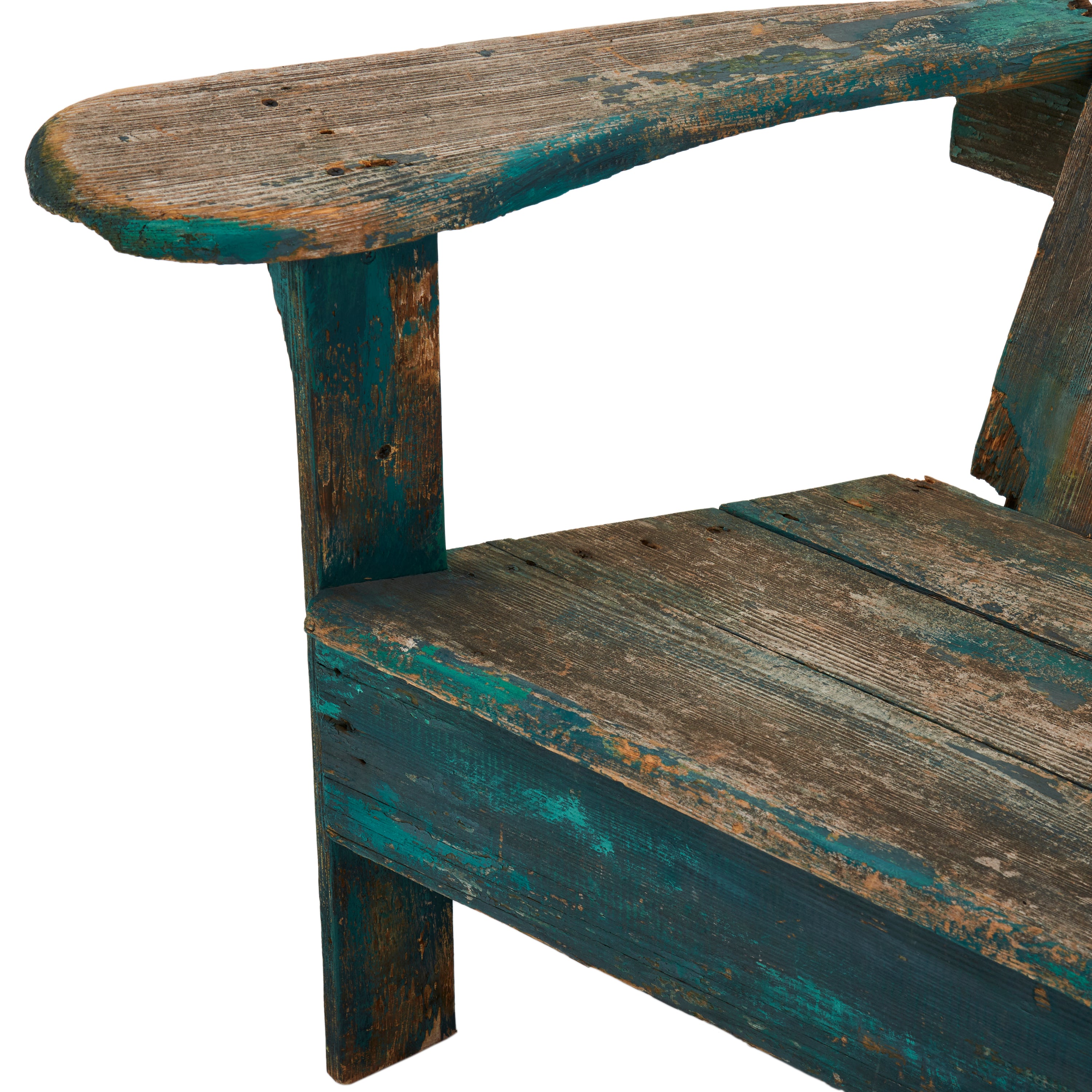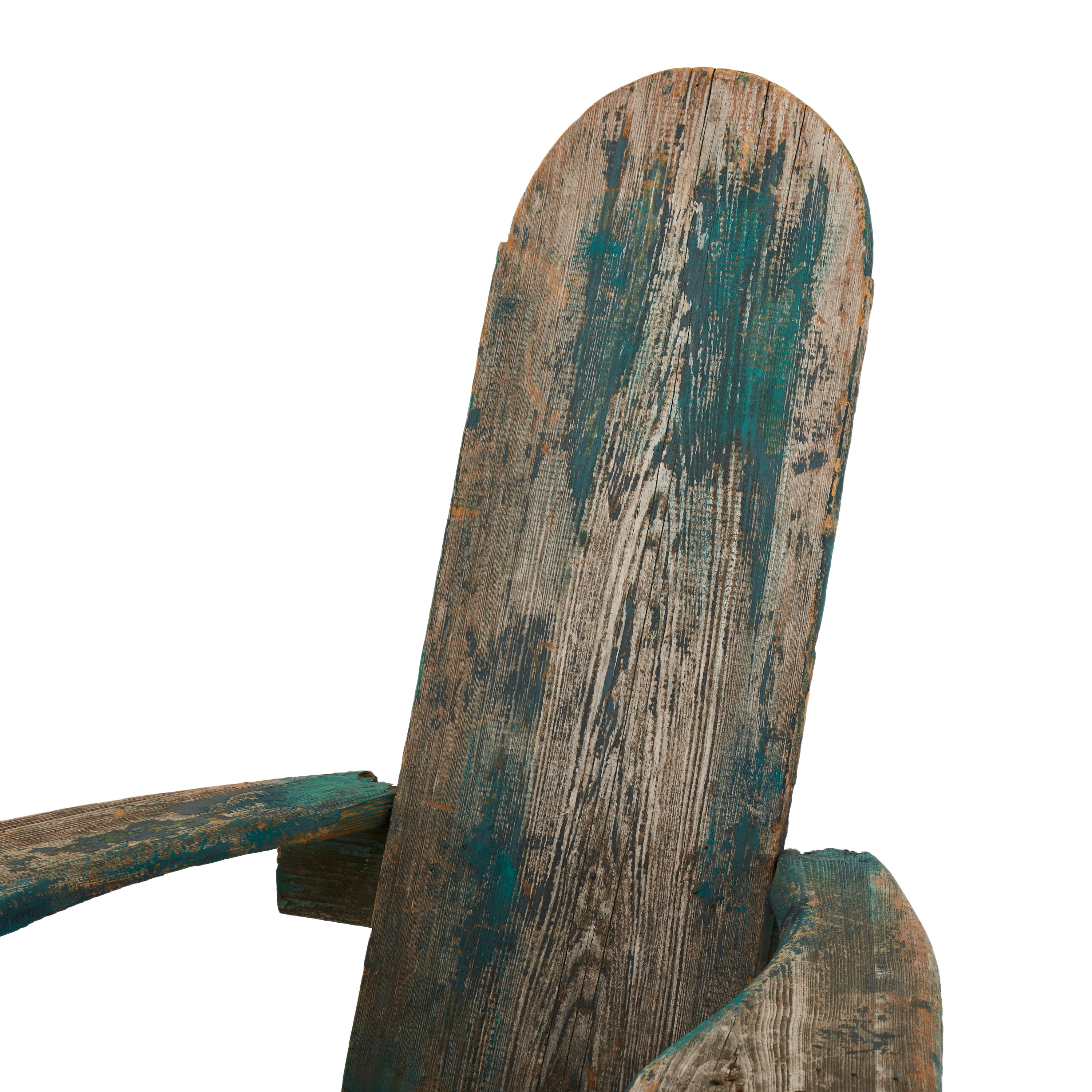 Details: Rustic adirondack chair with light wood and chipped away blue paint Dimensions: 35" H x 37" W x 33" D