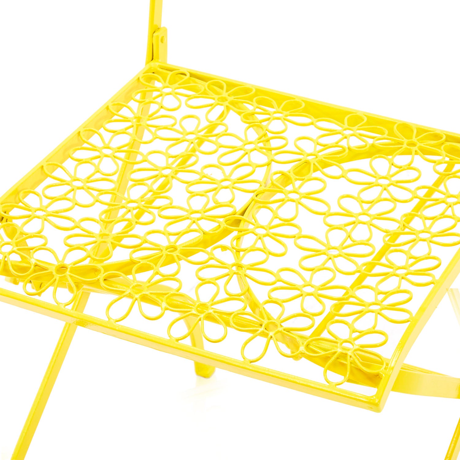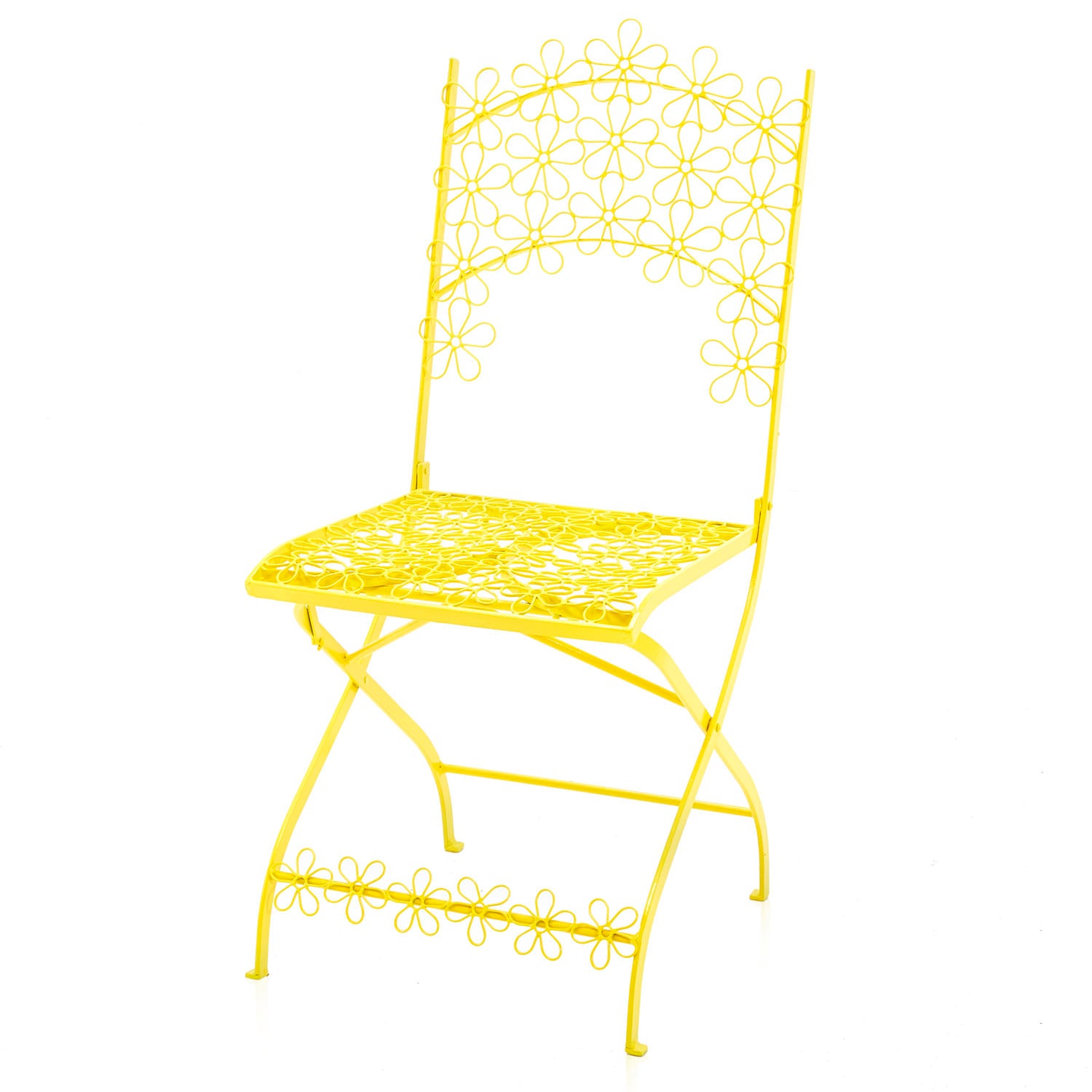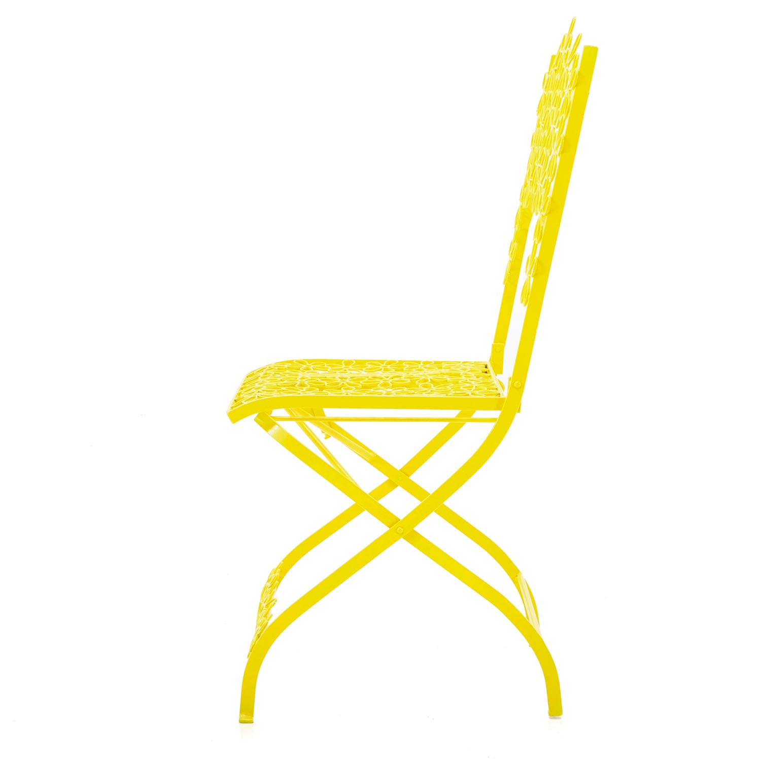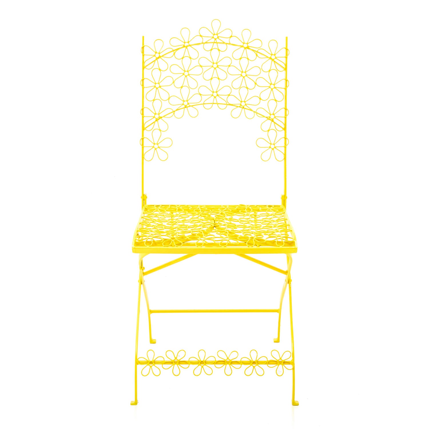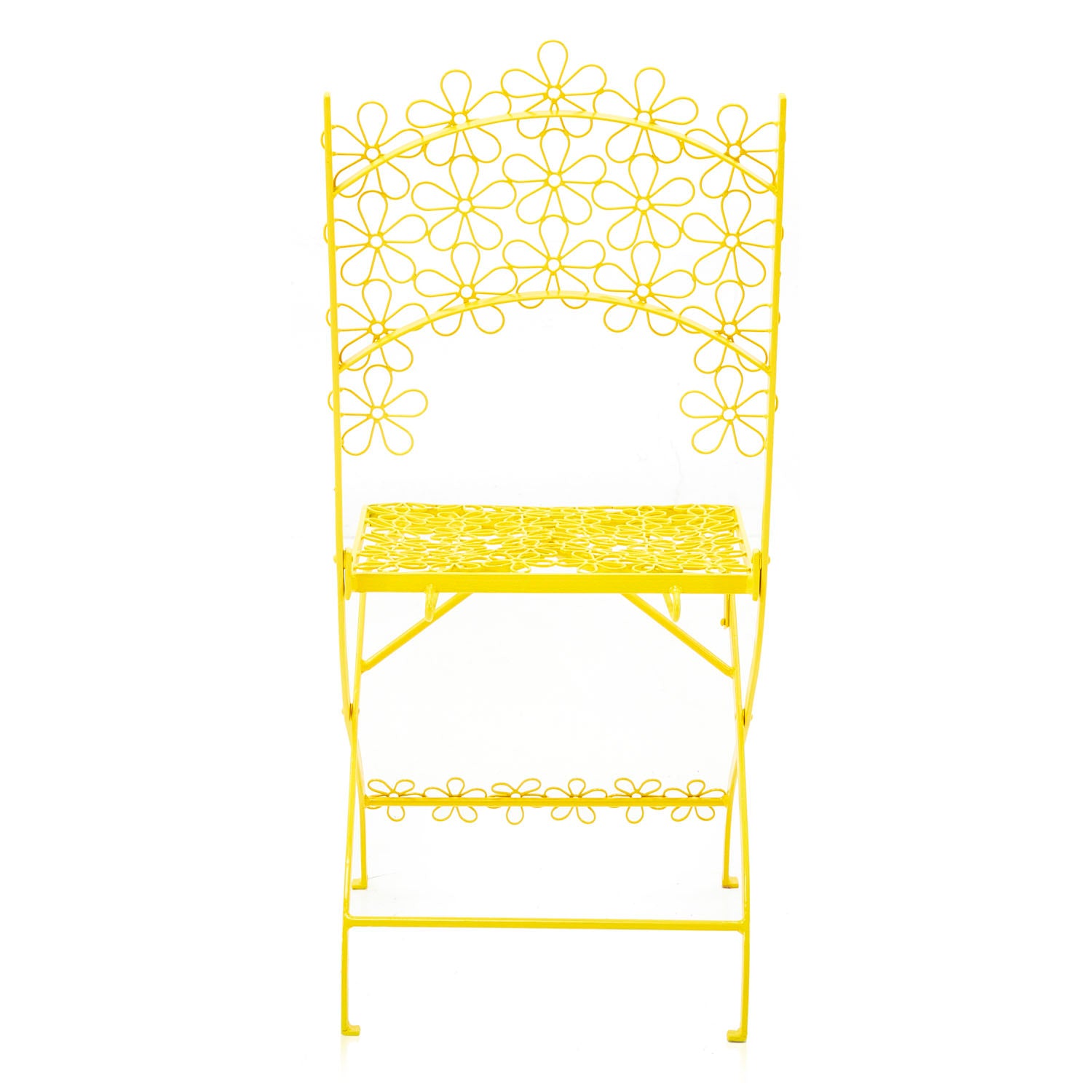 Details: Yellow metal outdoor chair with flower pattern metal mesh seat Dimensions: 38" H x 16" W x 18" D Quantity: 2