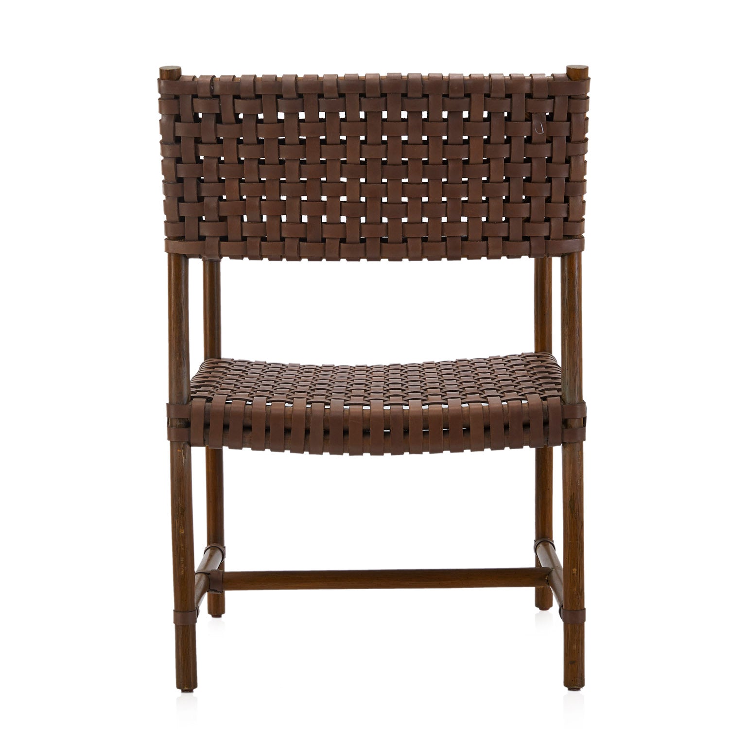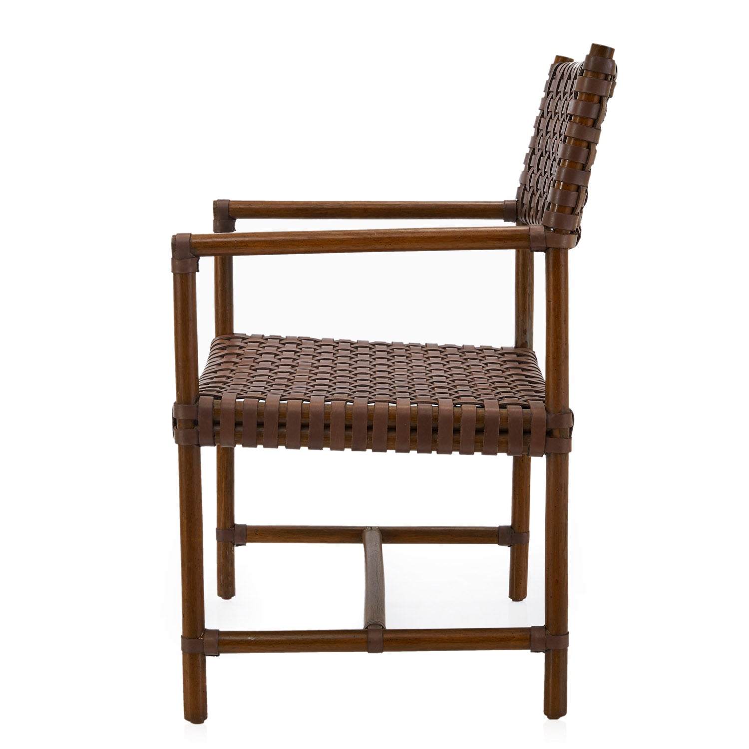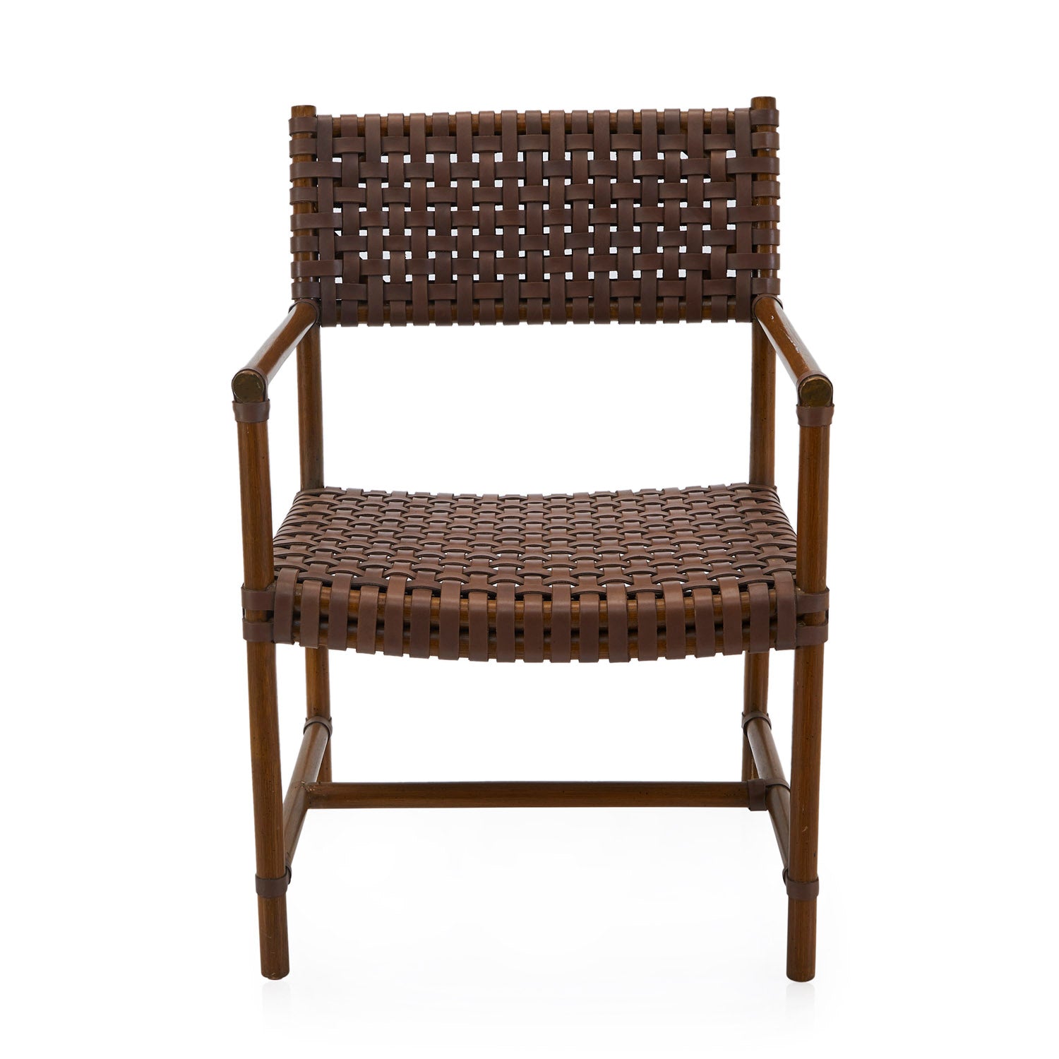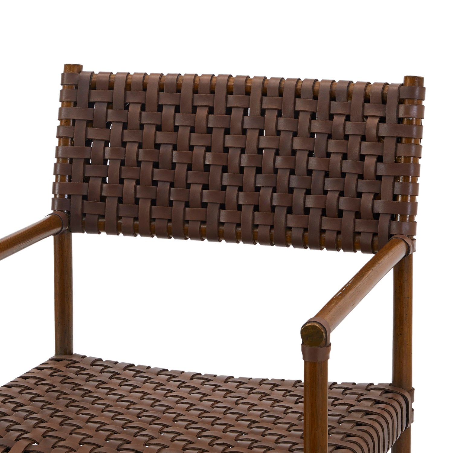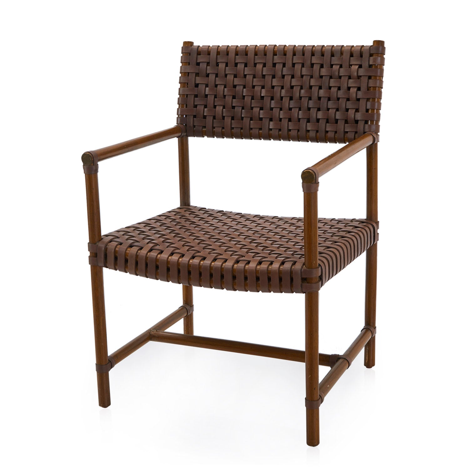 Details: Brown woven leather outdoor armchair with wood legs Dimensions: 34" H X 23" W X 20" D