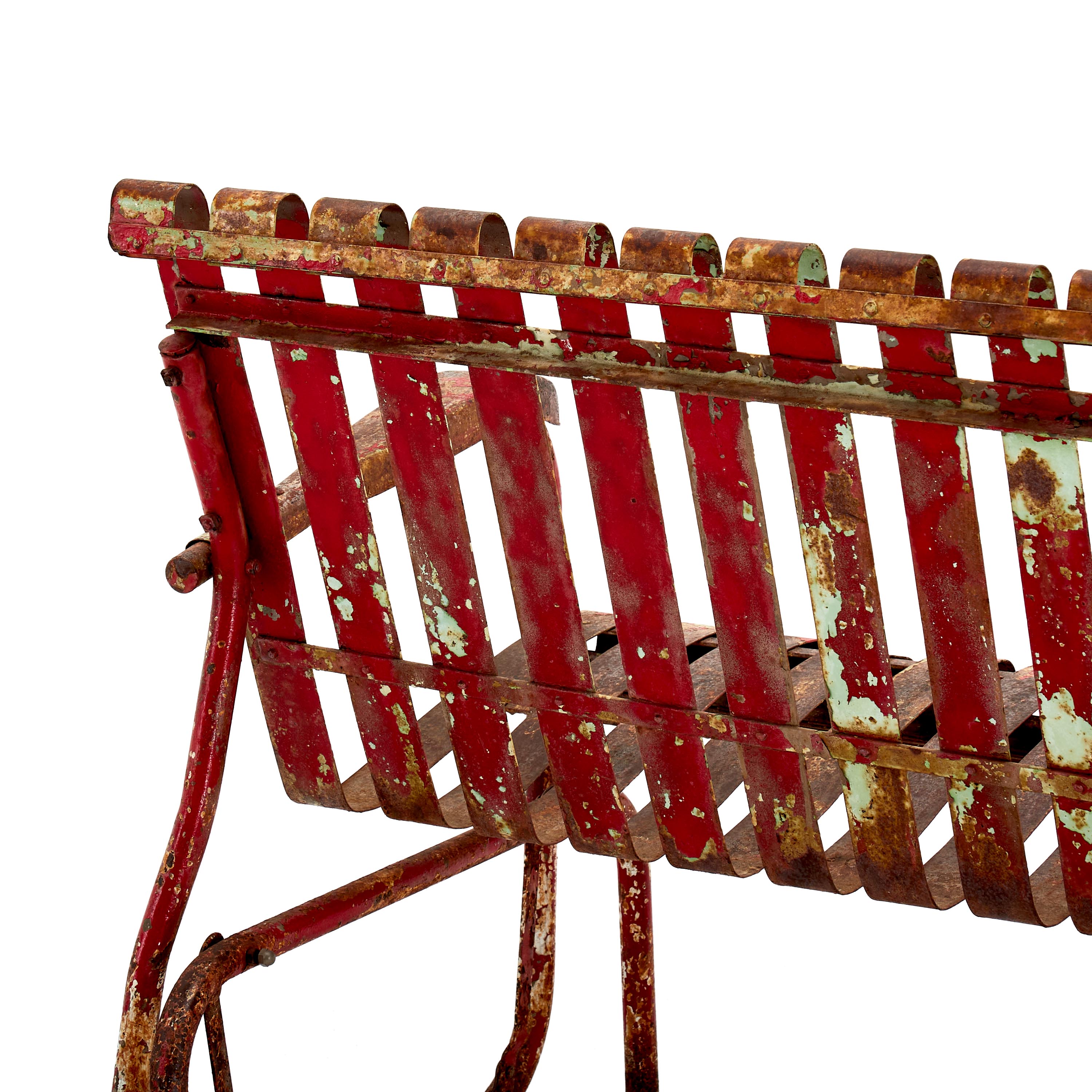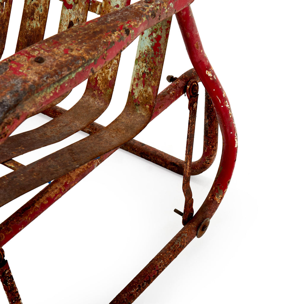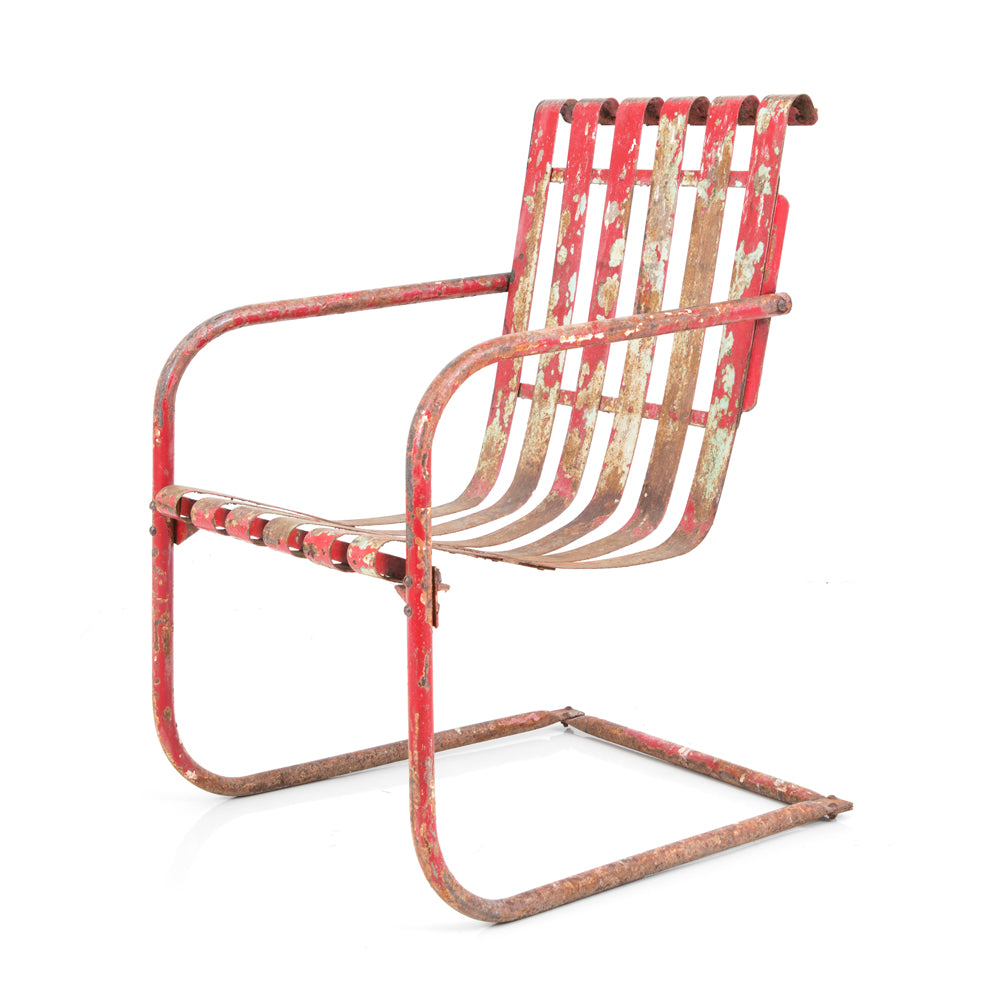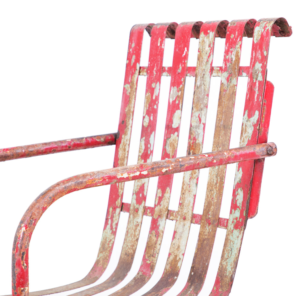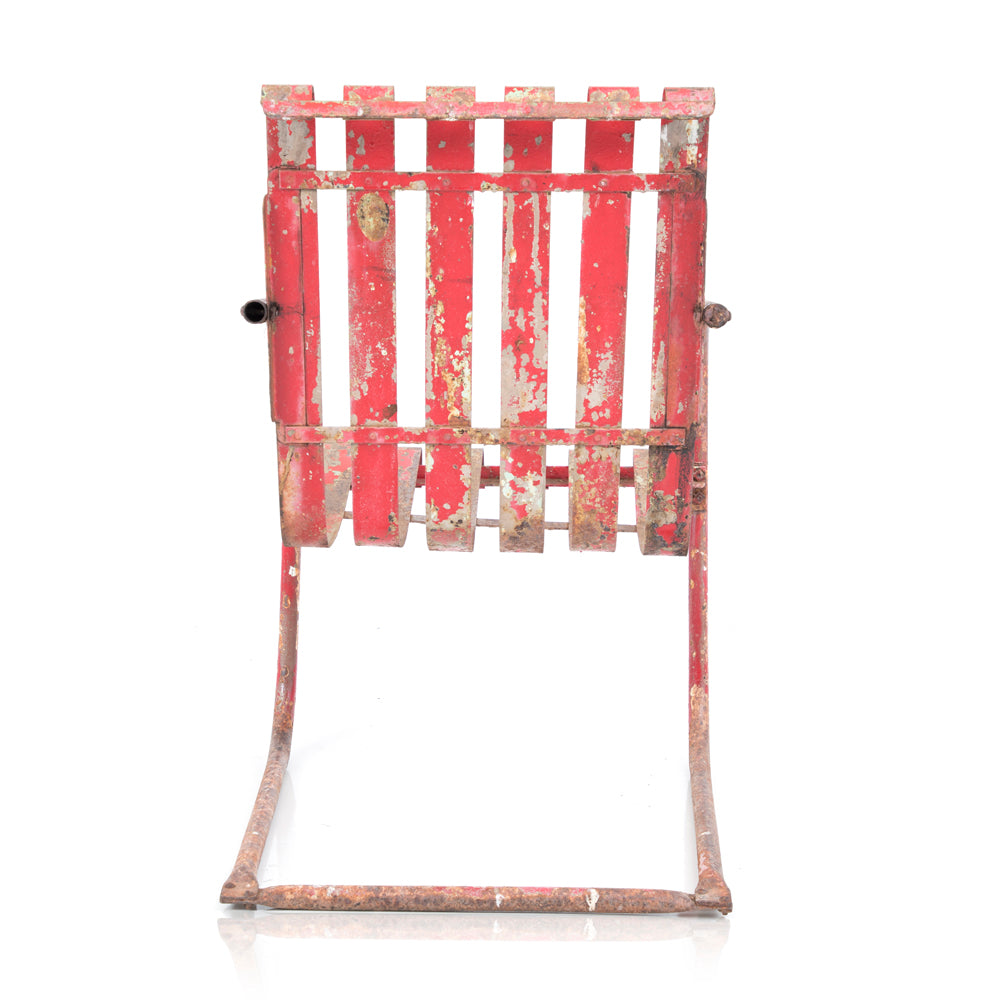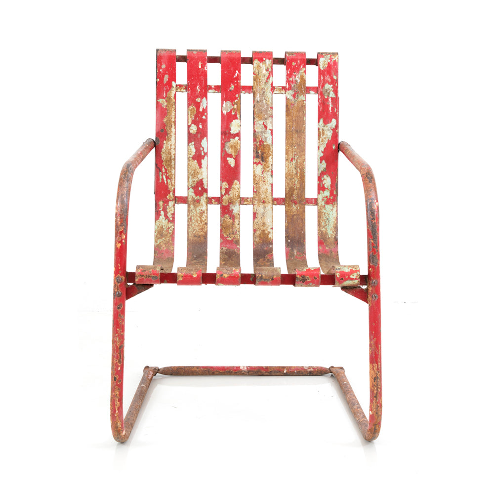 Details: Weathered red chair with rusted, peeling paint Dimensions: 34" H x 21" W x 23" D Quantity: 2