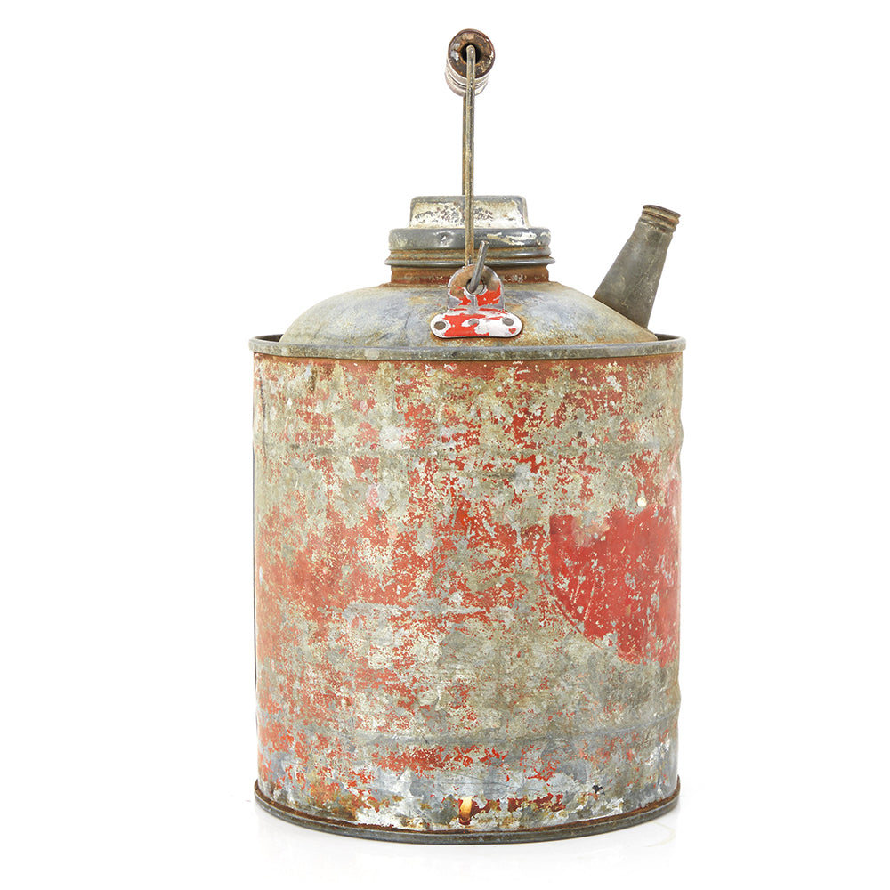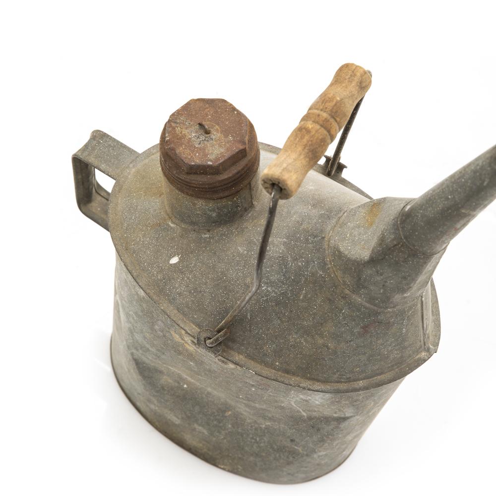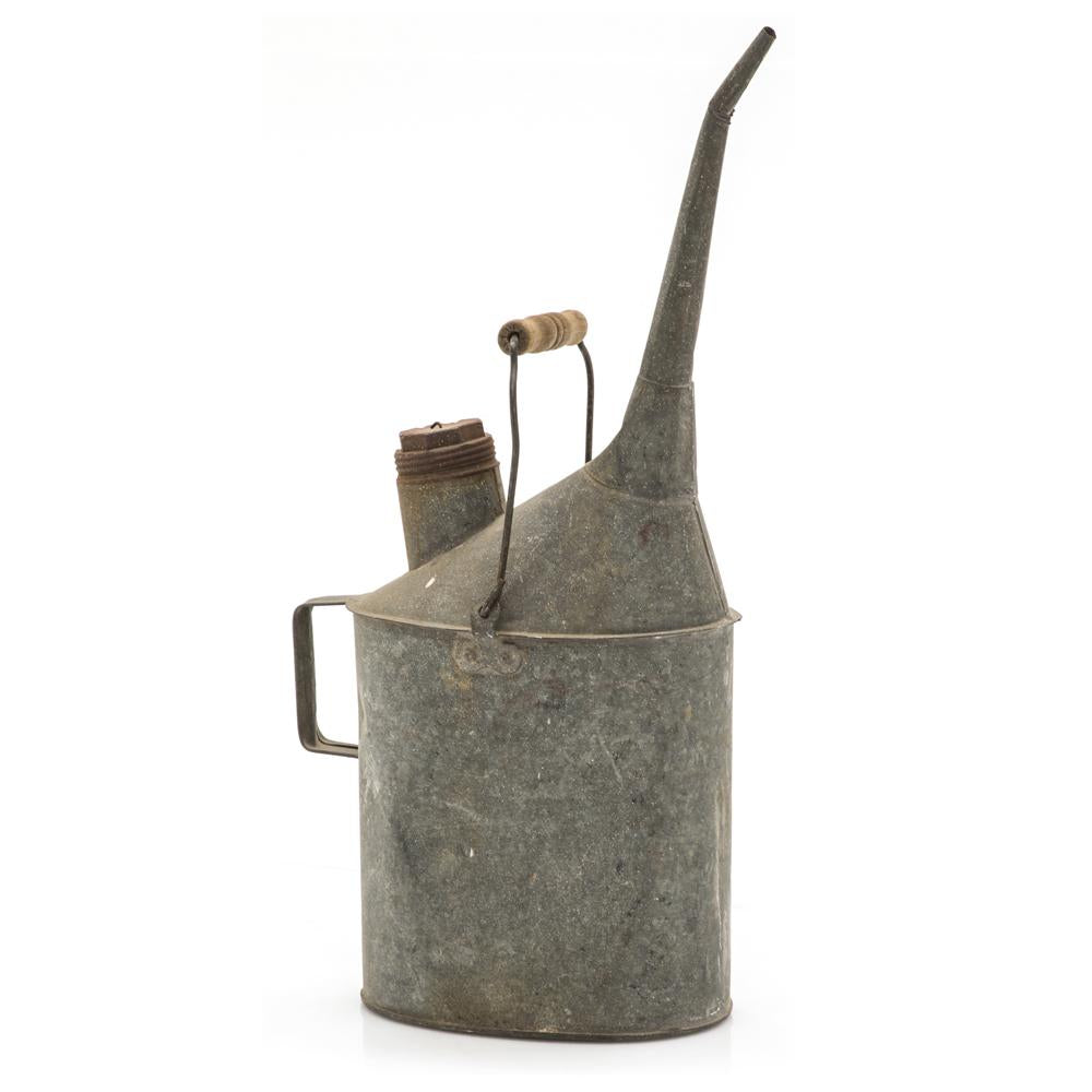 Details: Metal oil can with thin spout, vertical and horizontal handle Dimensions: 25" H X 7" W X 12" D