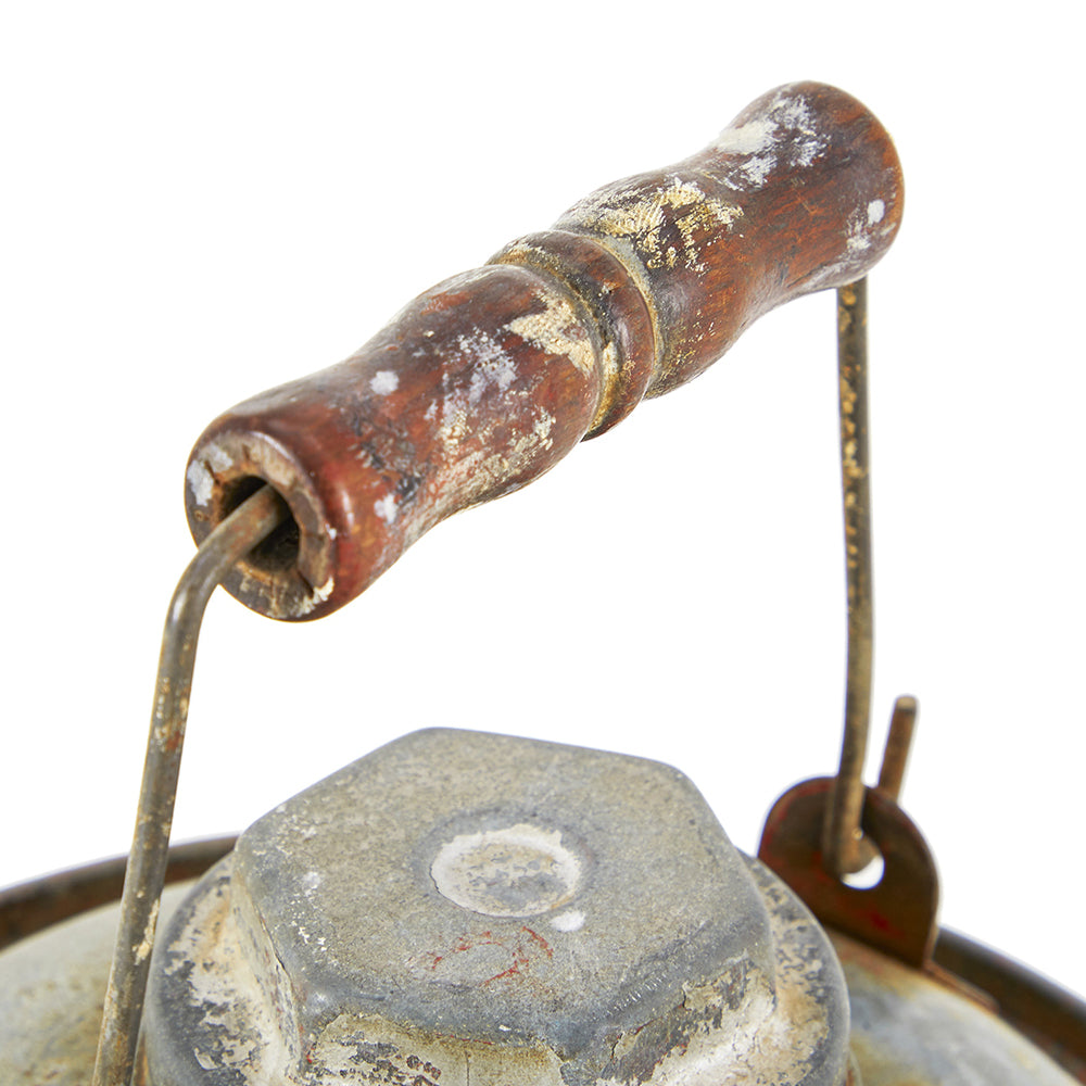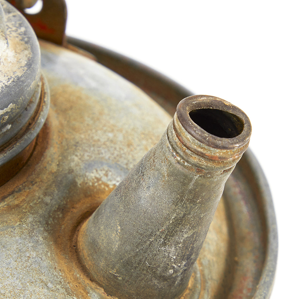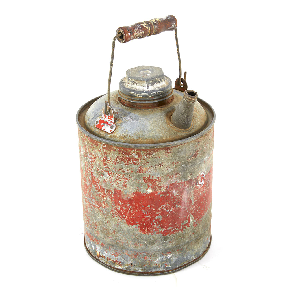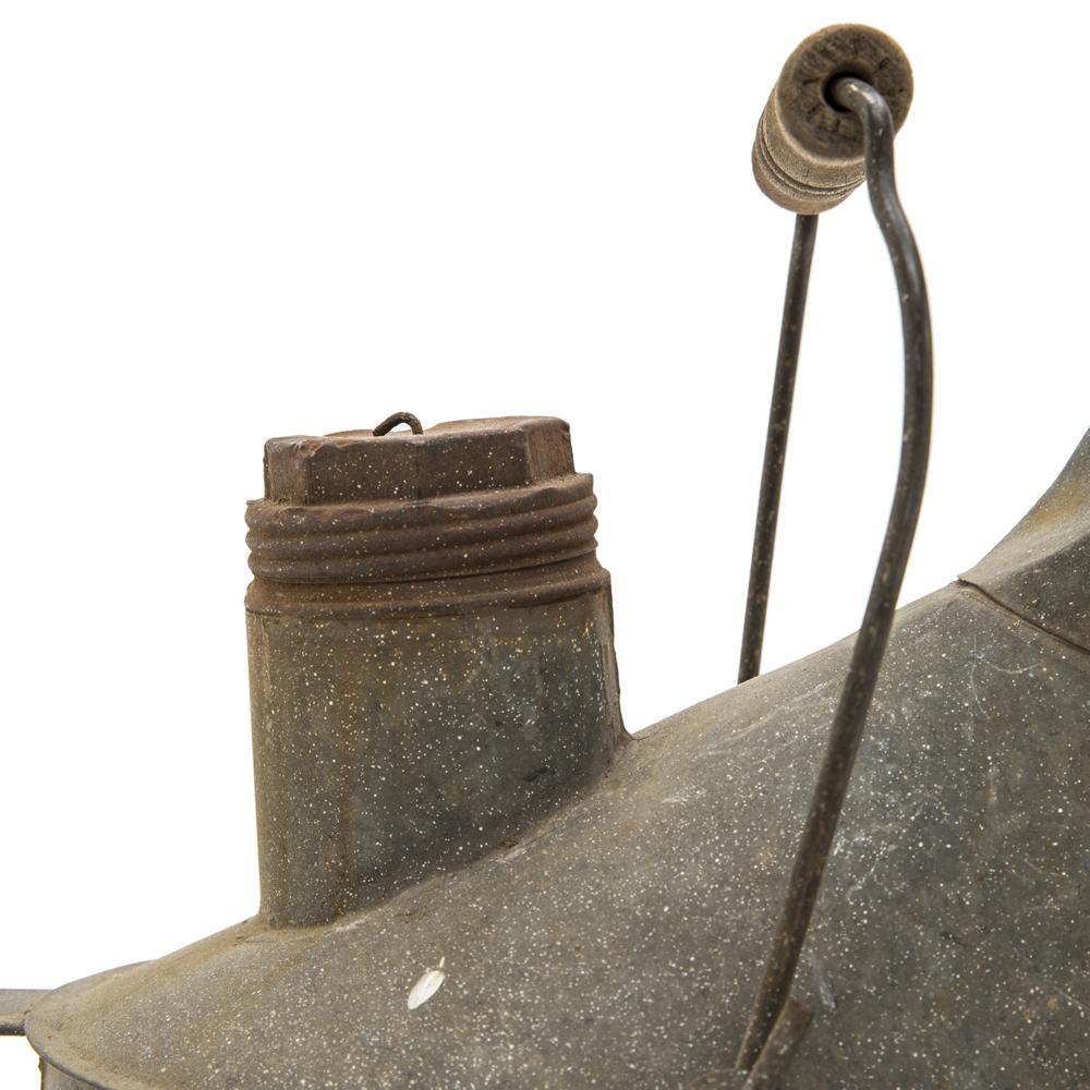Details: Metal oil can with thin spout, vertical and horizontal handle Dimensions: 25" H X 7" W X 12" D