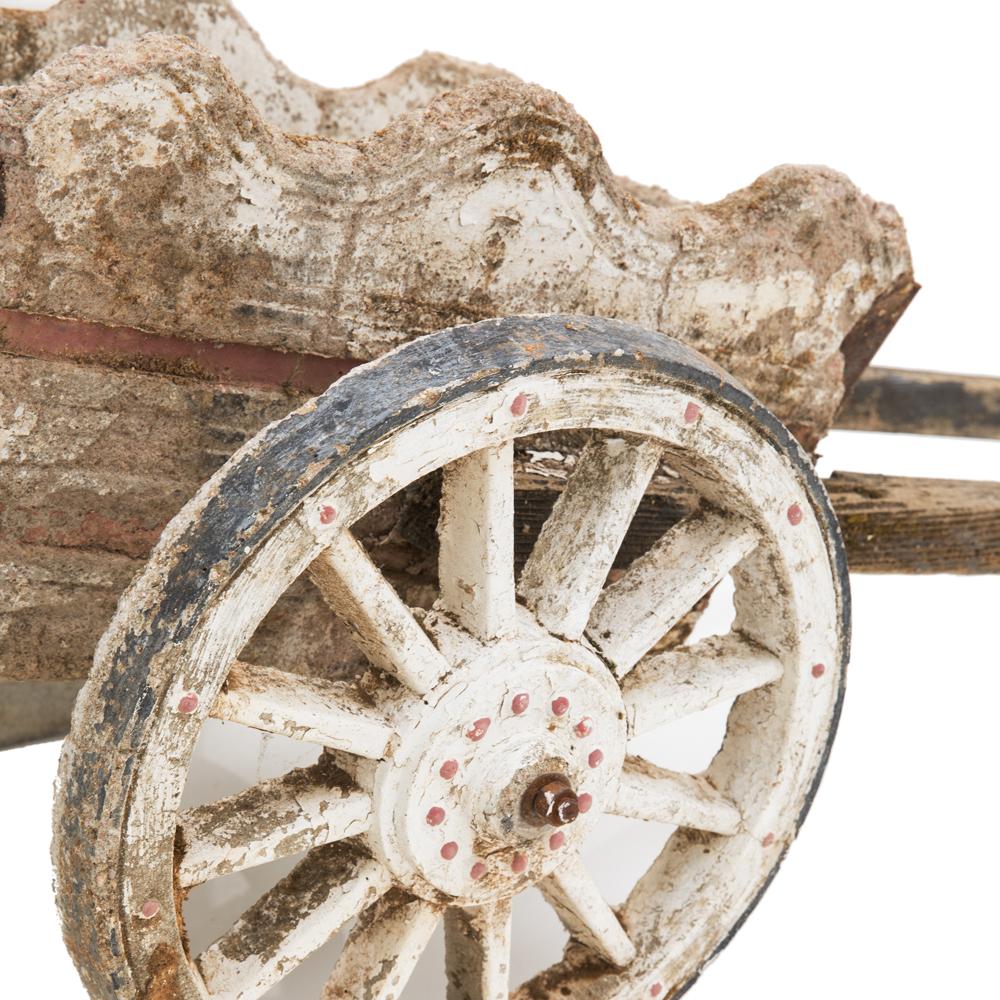 Details: Rustic wooden cart with faded paint job. Dimensions: 18" H x 46" W x 18" D