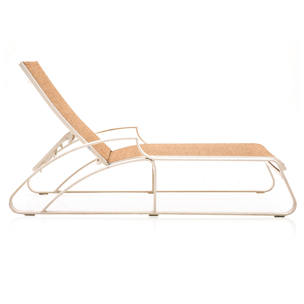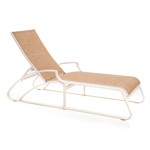 Details: Tan and white outdoor chaise. Dimensions: 42" H x 79" W x 27" D