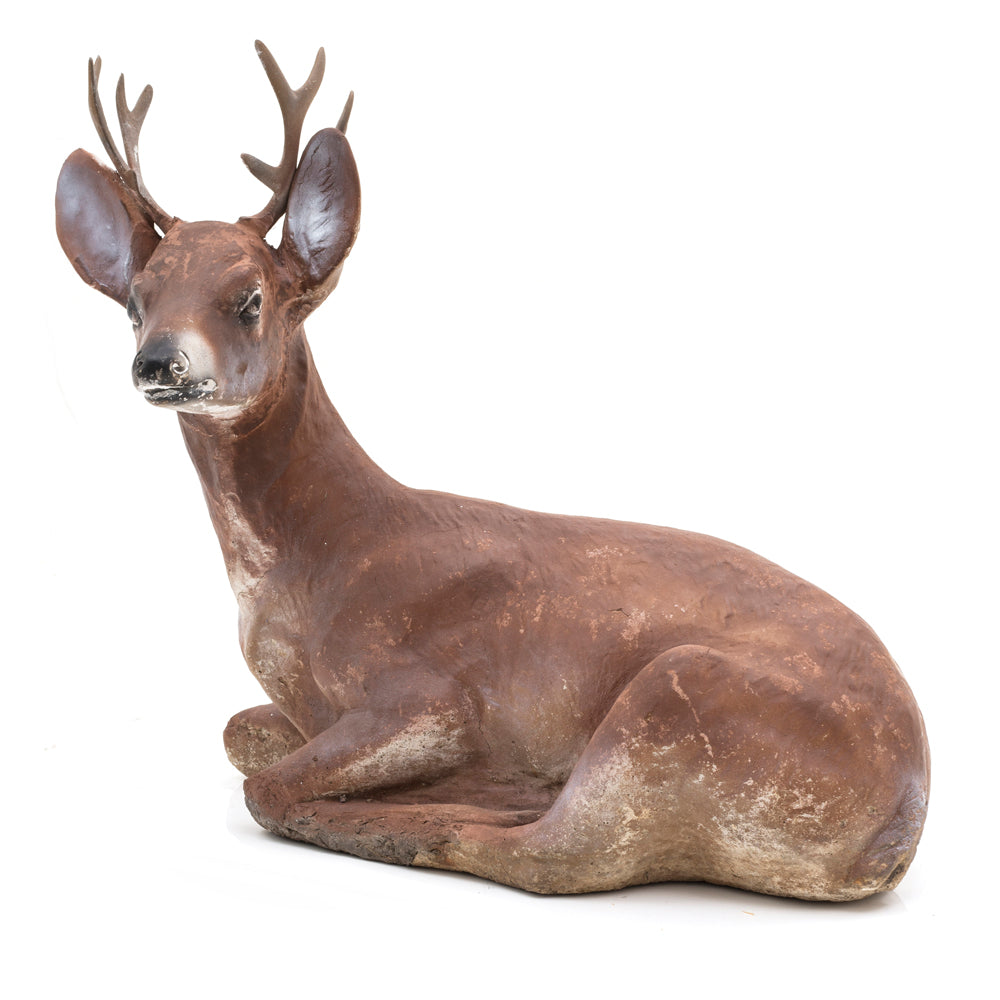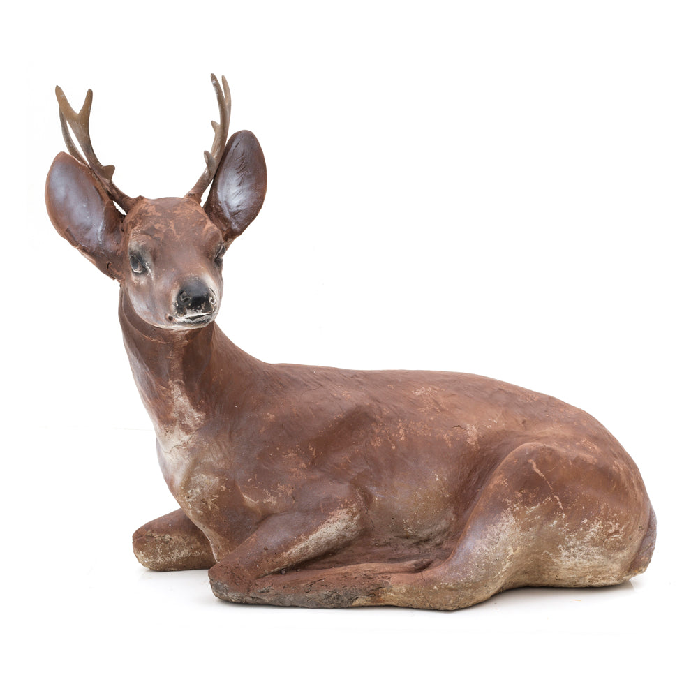 Details: Rustic cement sculpture of a fawn sitting. Dimensions: 11" H x 15" W x 8" D