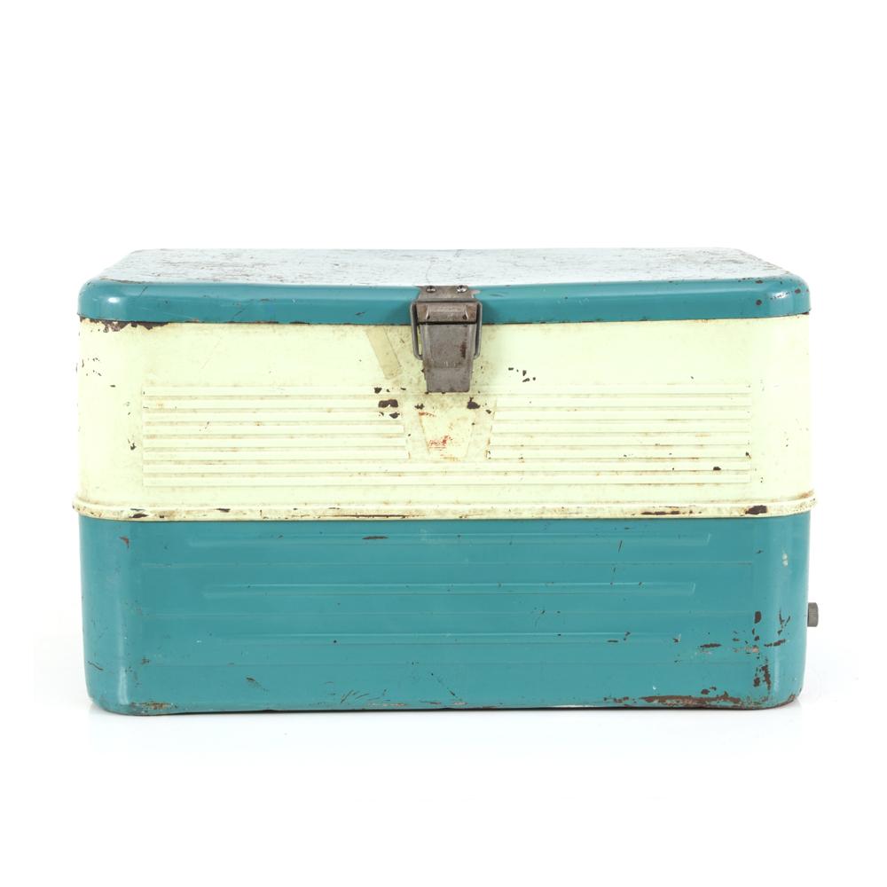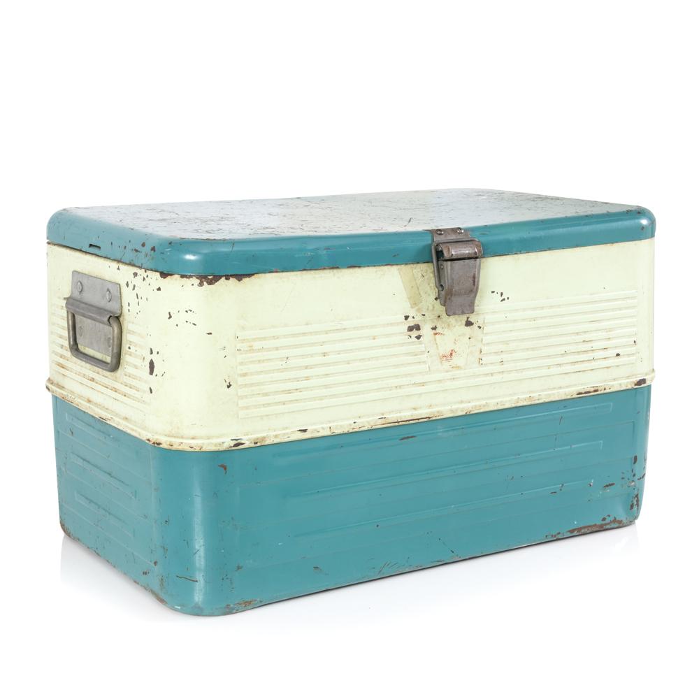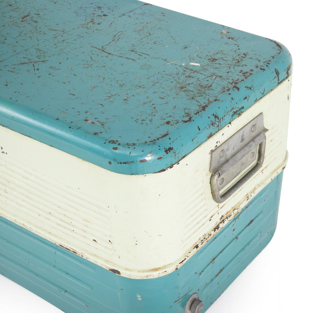 Details: Rustic Turquoise and White Metal Vintage Cooler Dimensions: 13" H x 22" W x 3.5" D Quantity: 1
