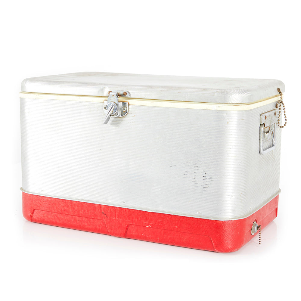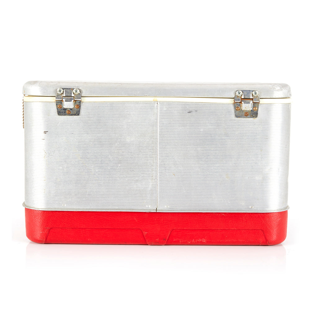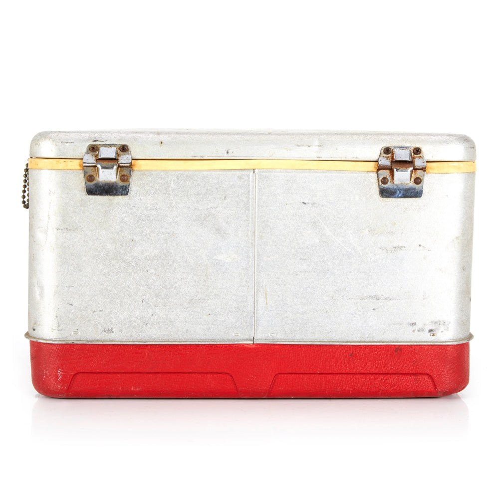 Details: Vintage silver portable cooler with red stripe on the bottom Dimensions: 5" H x 22" W x 14" D