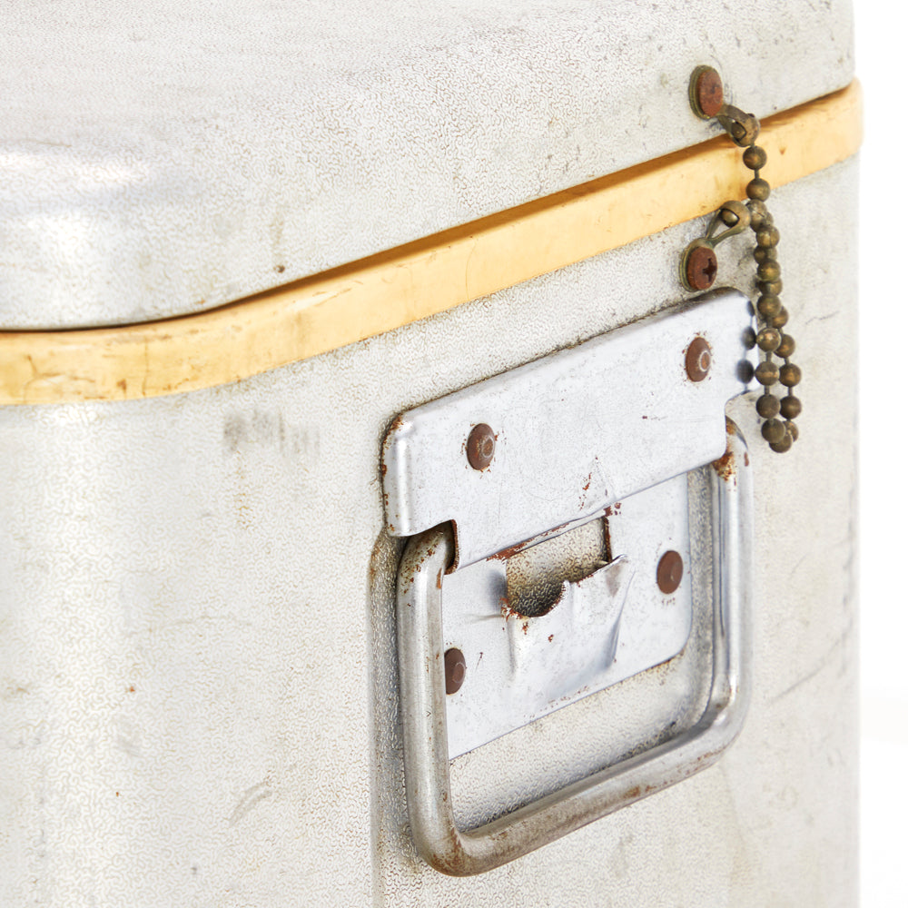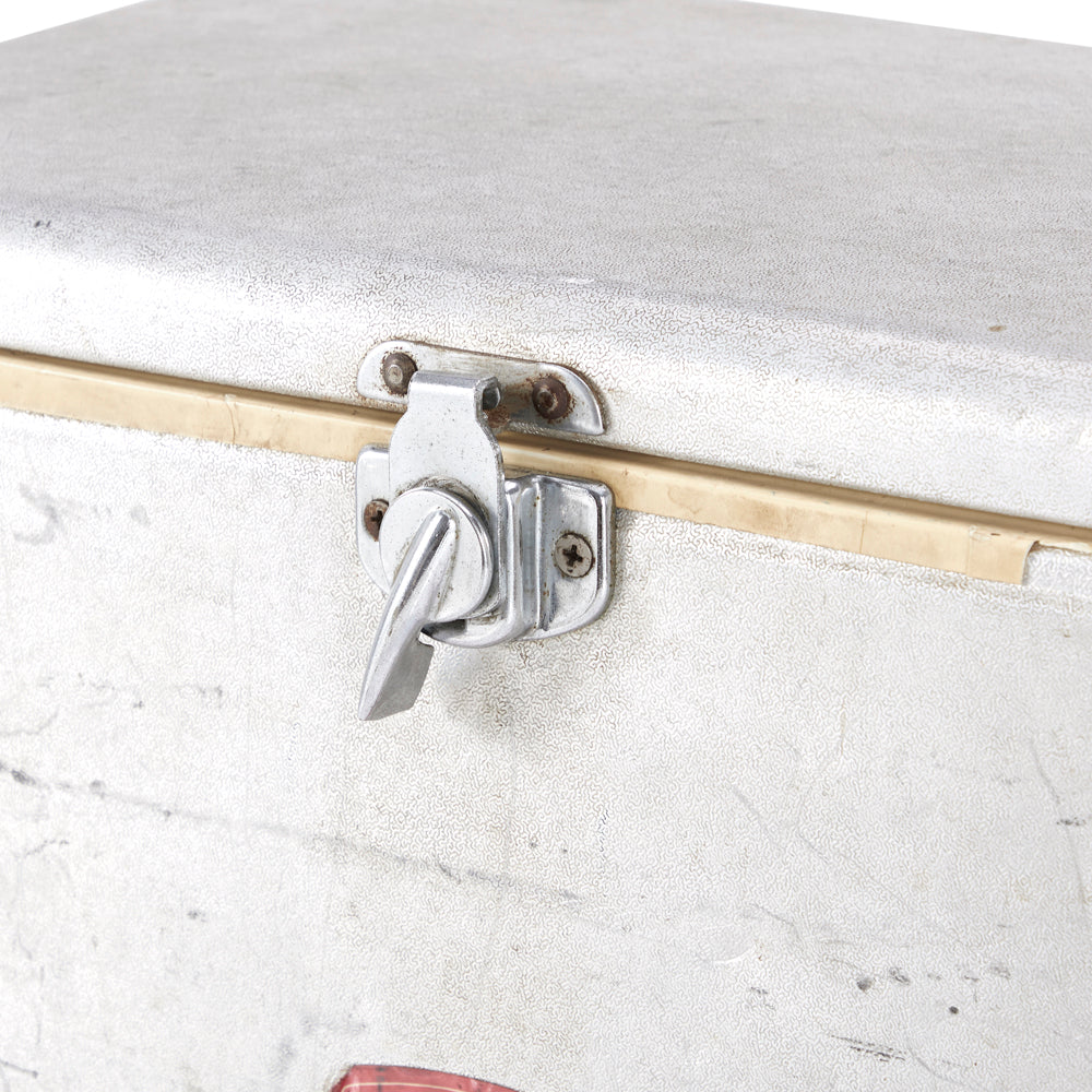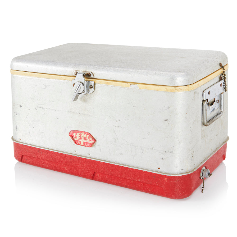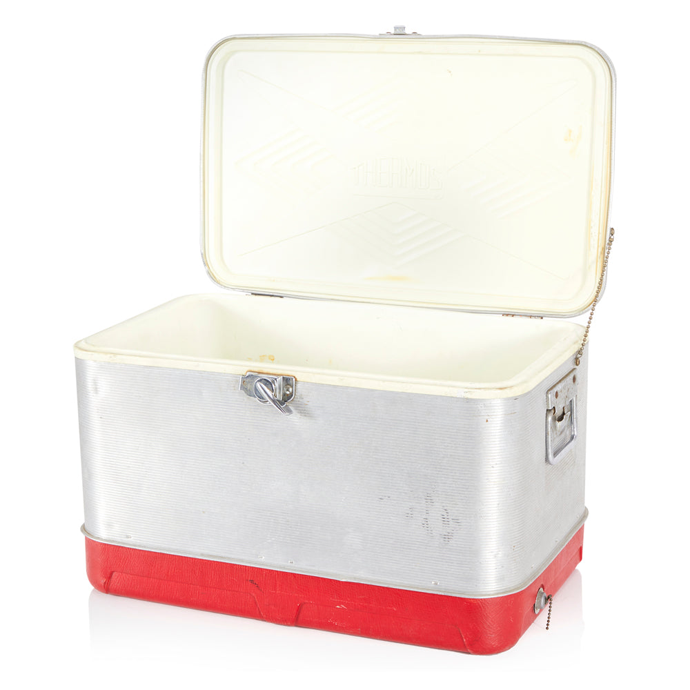 Details: Vintage silver portable cooler with red stripe on the bottom Dimensions: 5" H x 22" W x 14" D
