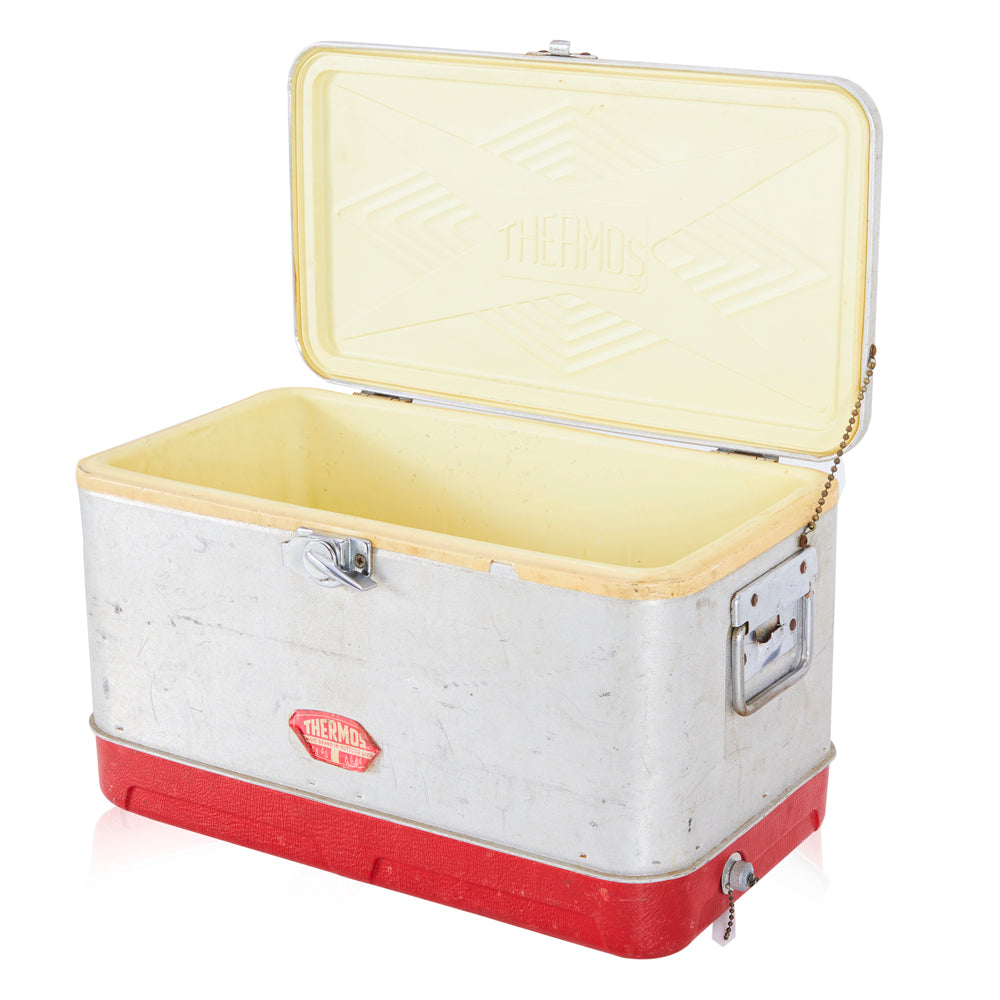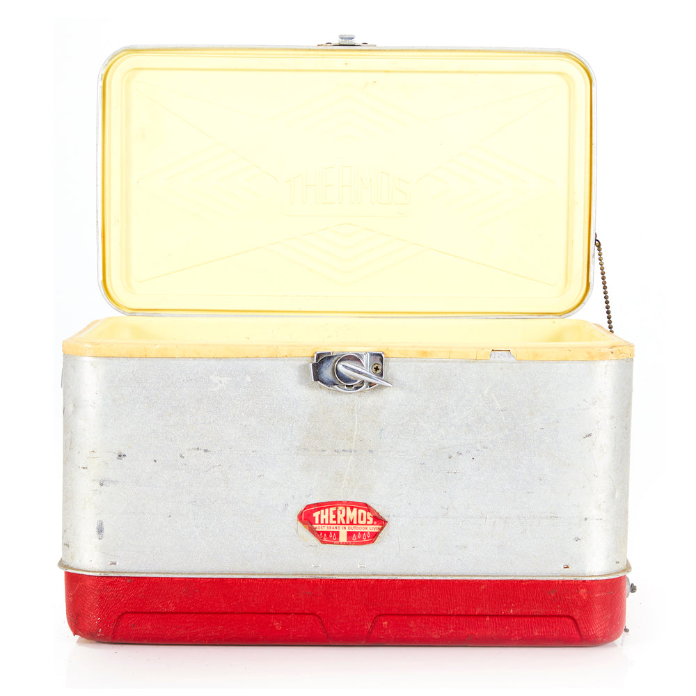 Details: Thermos Brand metal ice box with red trim on bottom and yellow inside Dimensions: 12" H x 19" W x 10" D