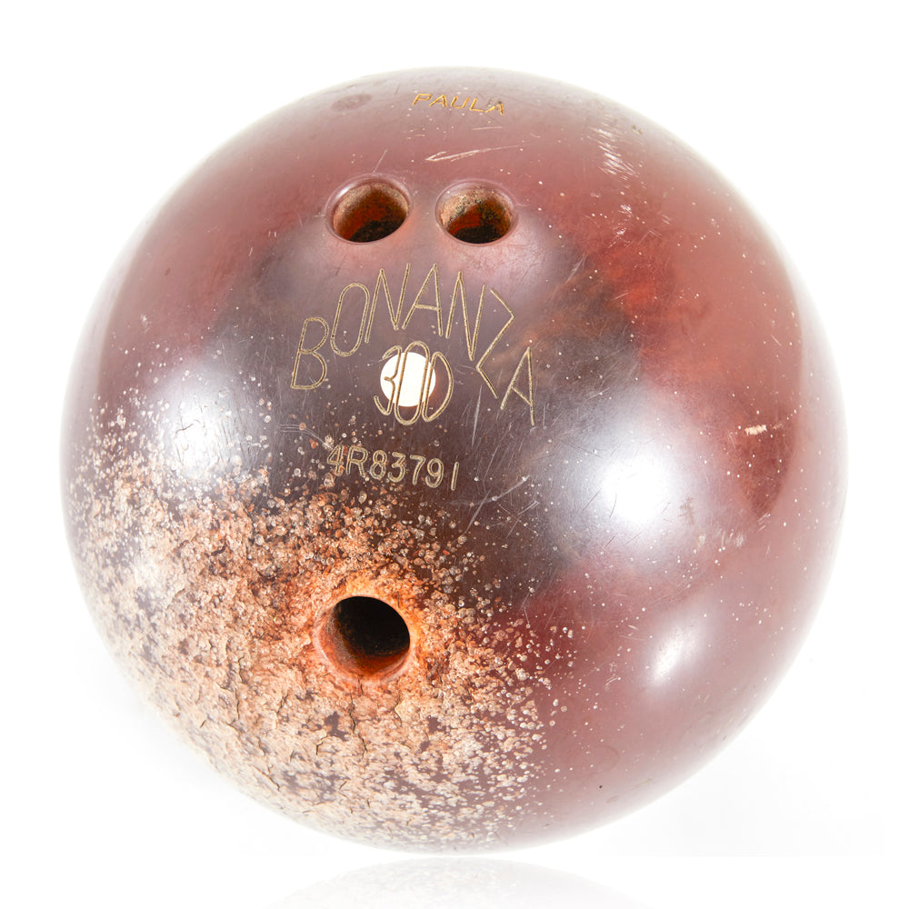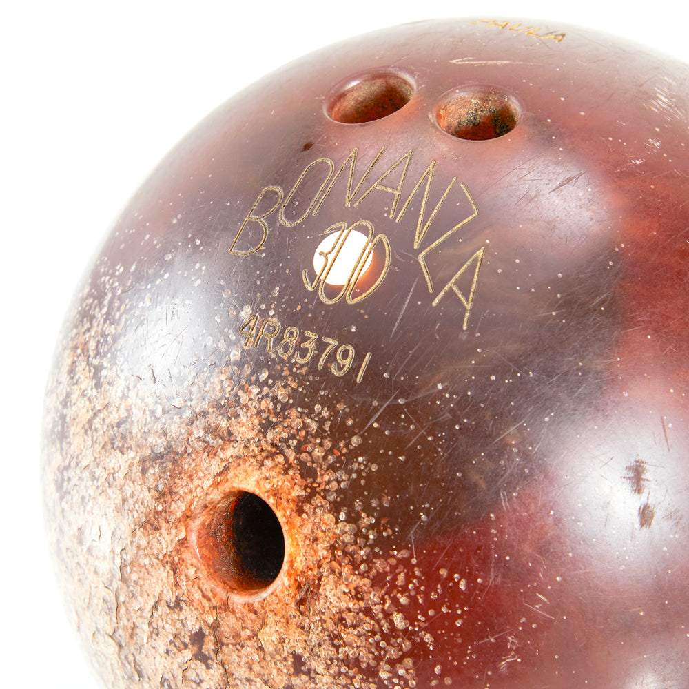 Details: Rustic red Bonanza bowling ball with significant wear Dimensions: 9" H x 8" W x 8" D Quantity: 1