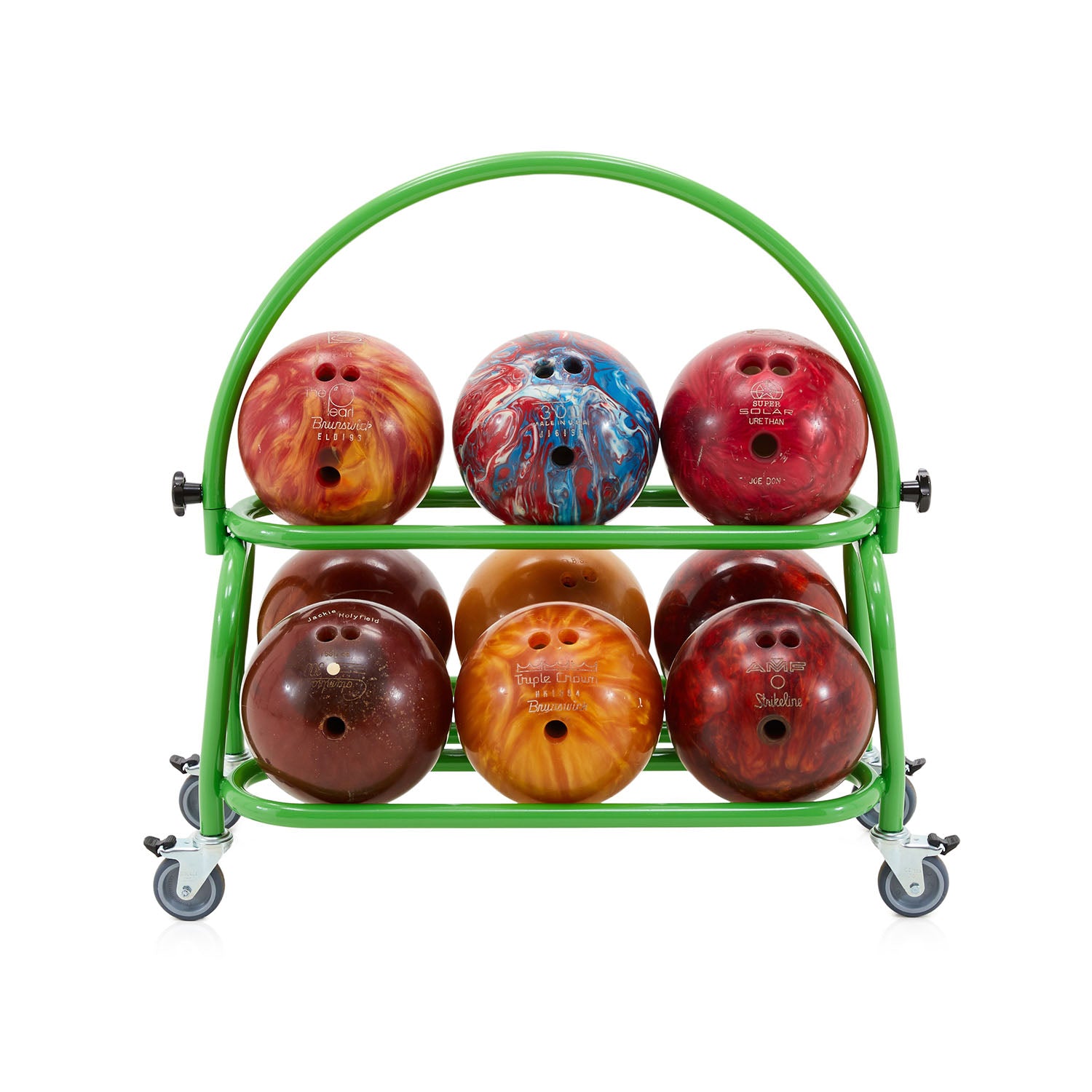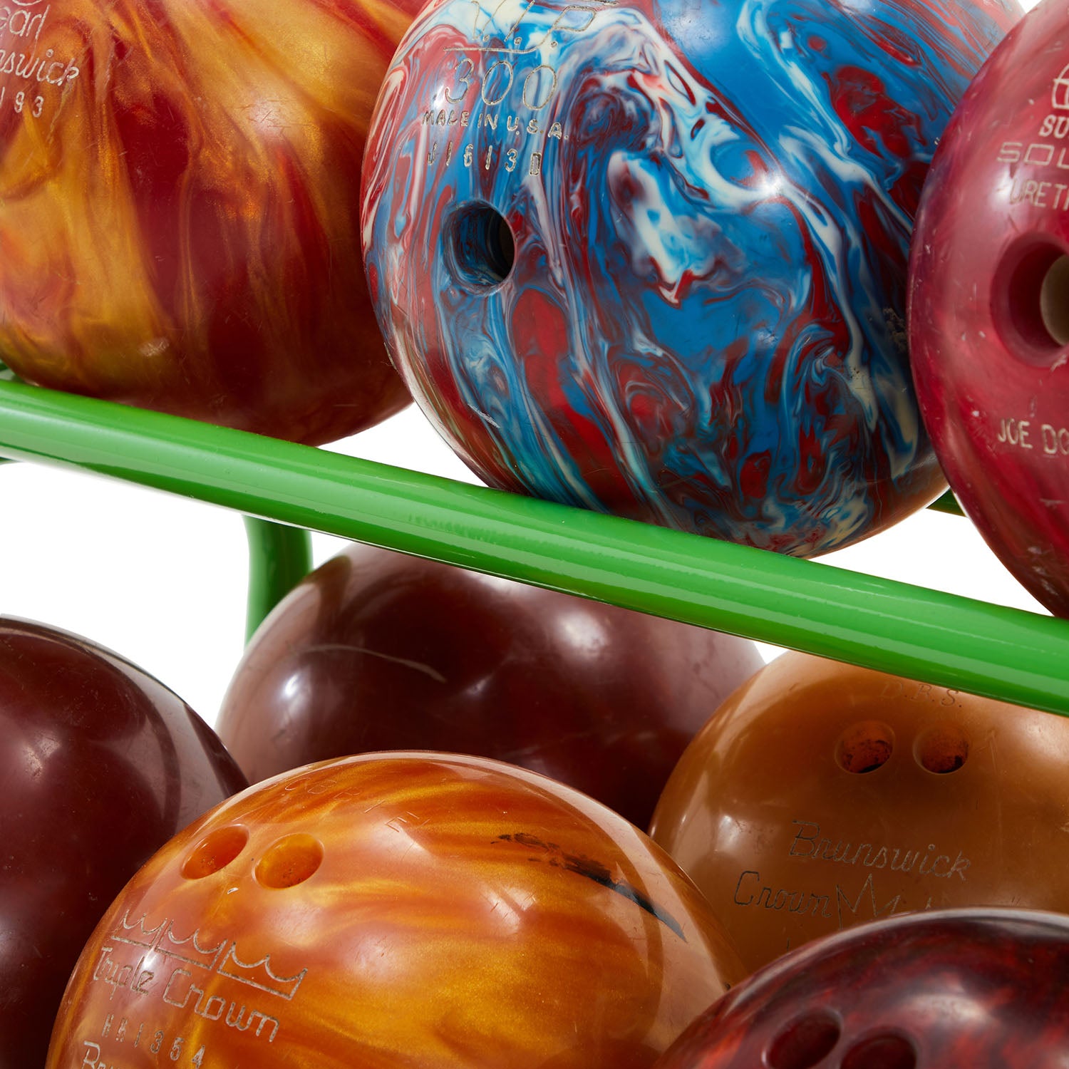 Details: Lime green metal bowling rack with multi-color bowling balls and wheels Dimensions: 32" H x 27" W x 11" D Quantity: 1