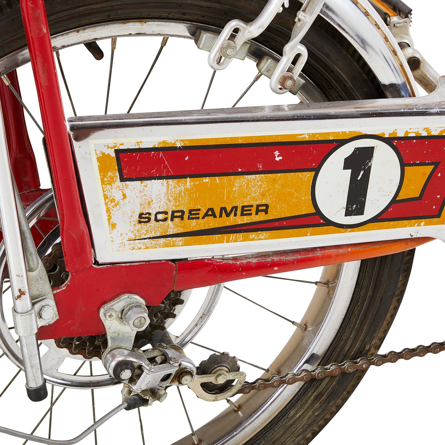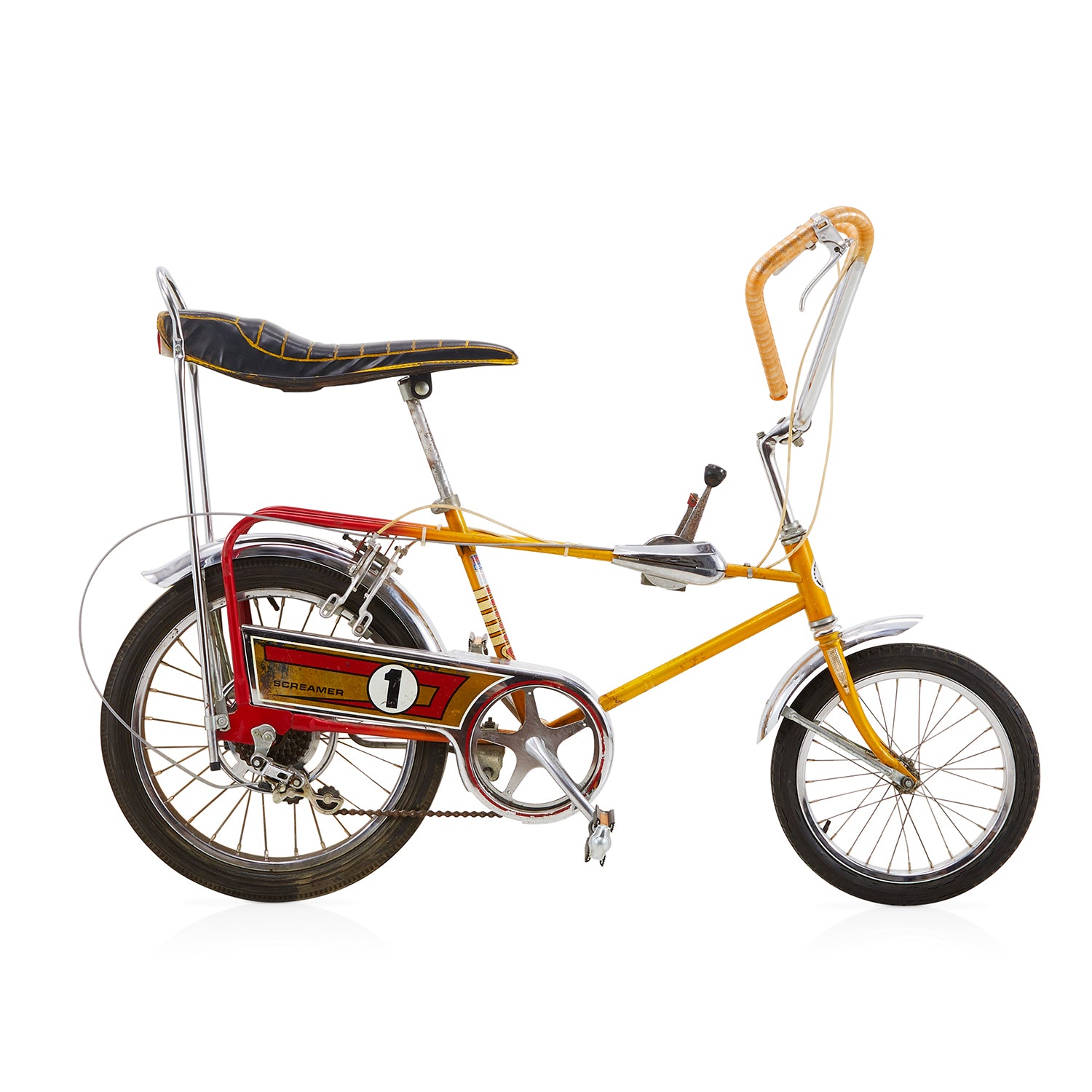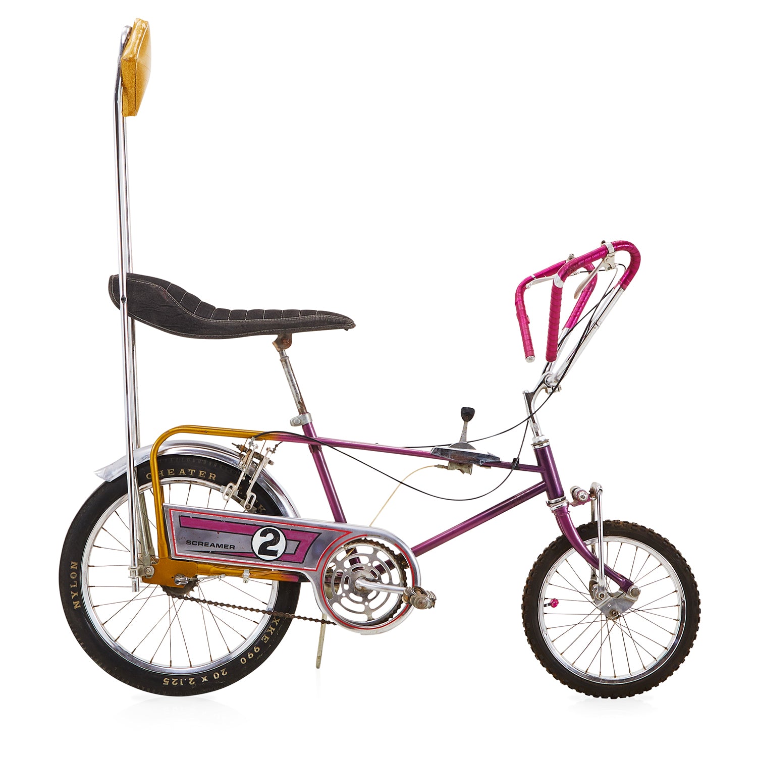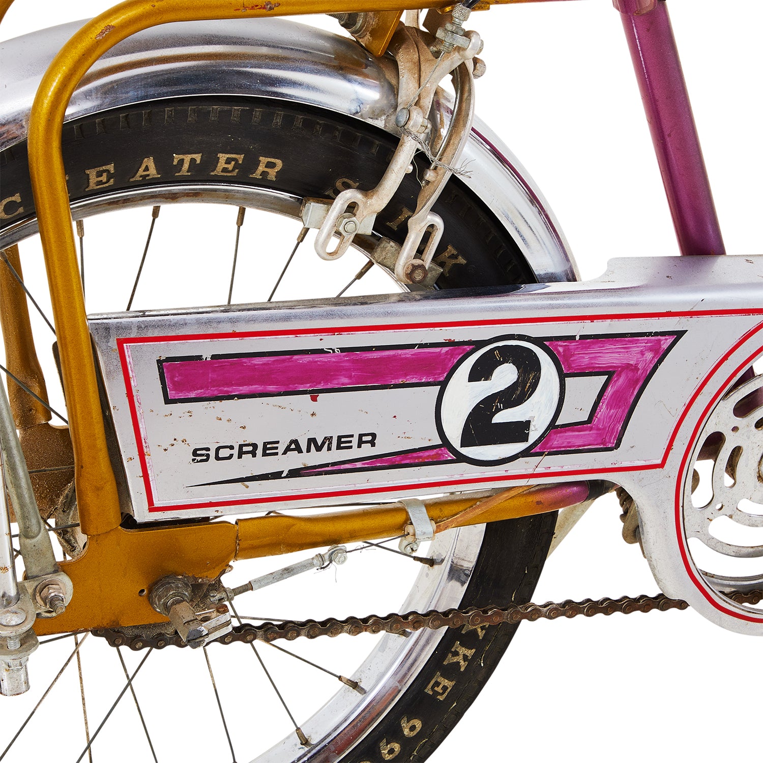 Details: Vintage "Screamer 2" bicycle with banana seat, tall seat back, ape-hanger handlebars, and oversized shift lever Dimensions: 58" H x 47" L x 22"...