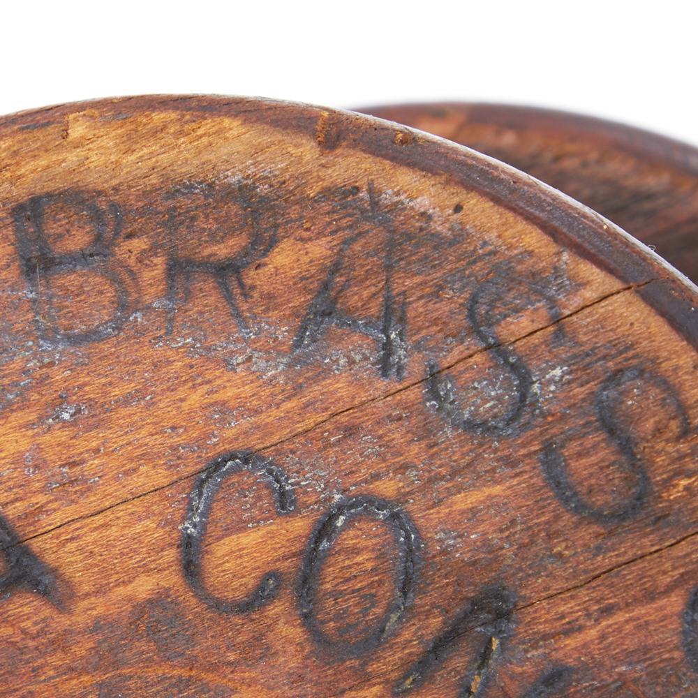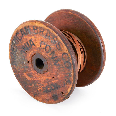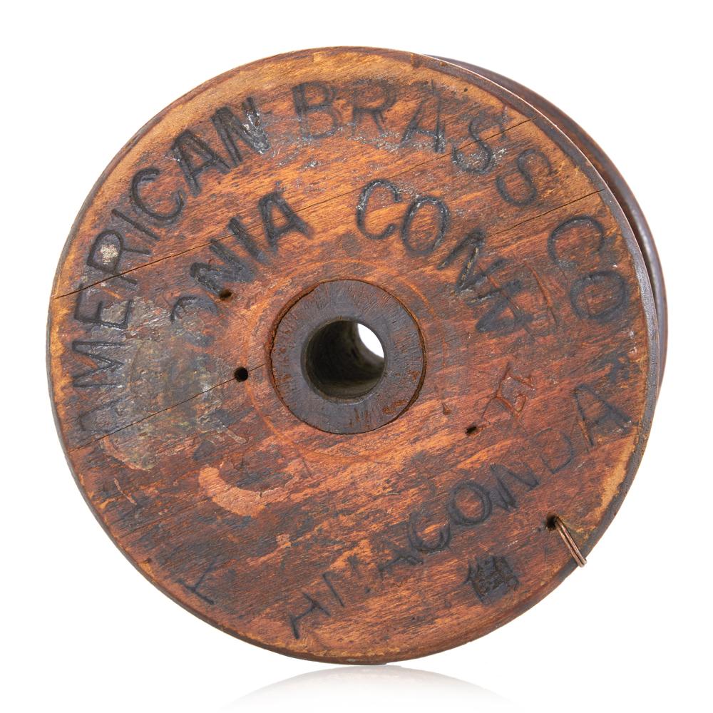 Details: Antique industrial wooden spool with "The American Brass Co." branded on the side Dimensions: 5.5" H x 6" W x 3.5" D Quantity: 1