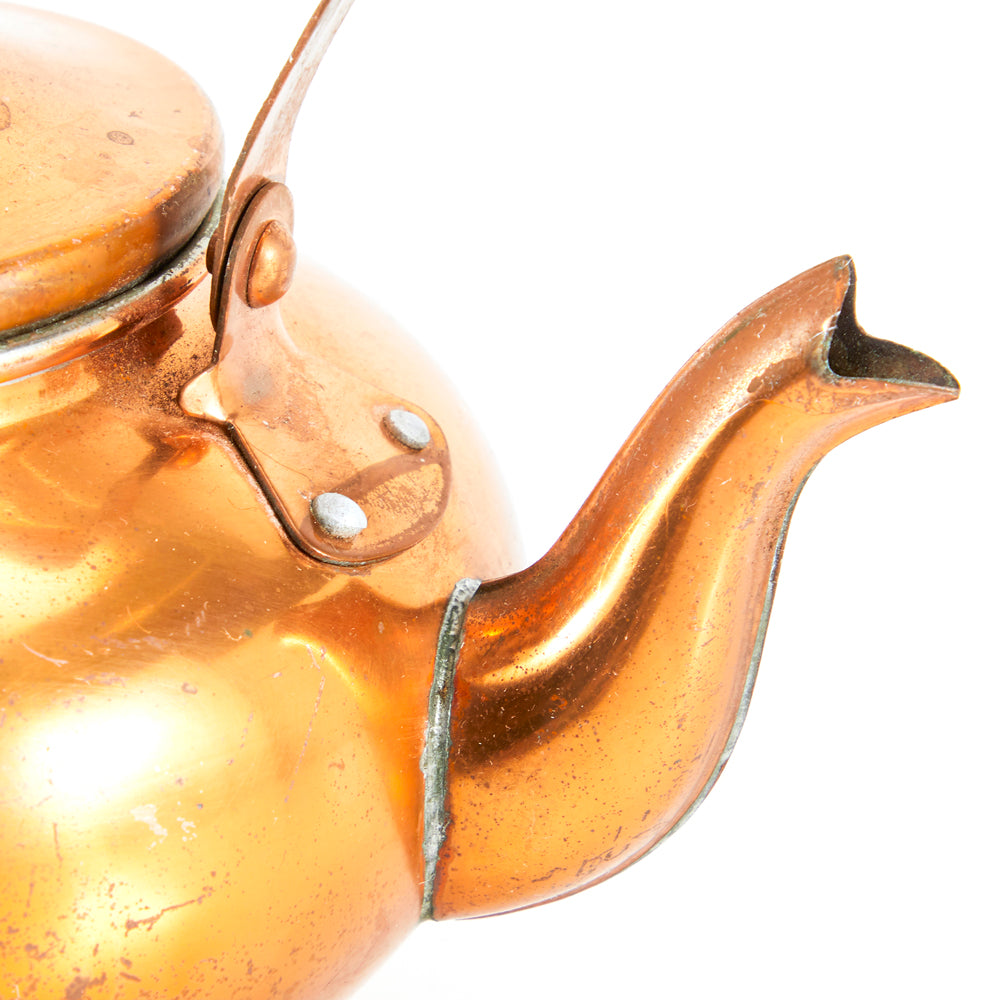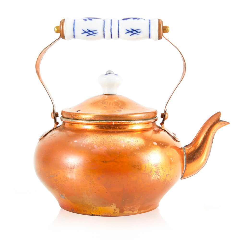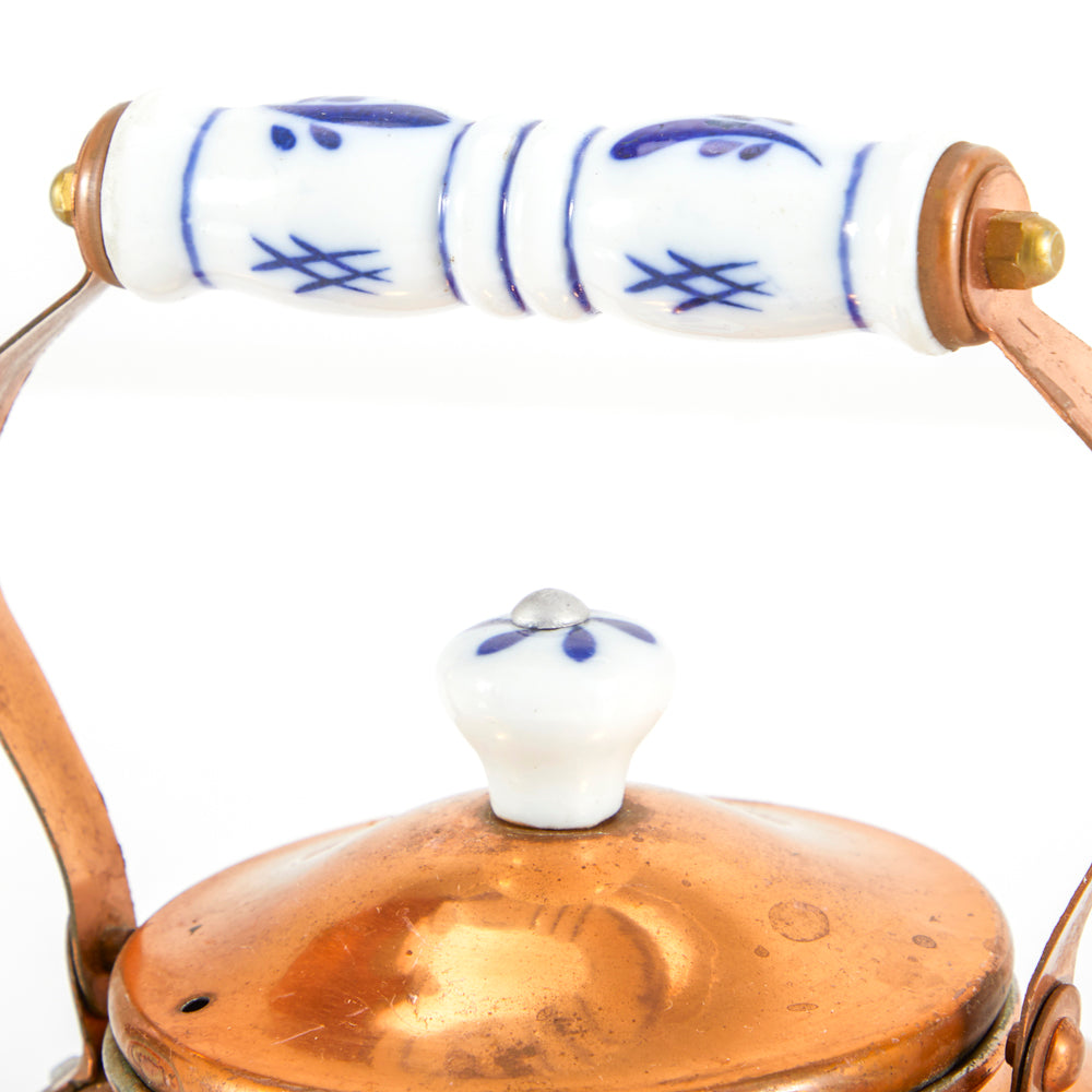 Details: Old dutch copper tea kettle with porcelain handles Dimensions: 7.5" H x 6" W x 7.5" D Quantity: 1