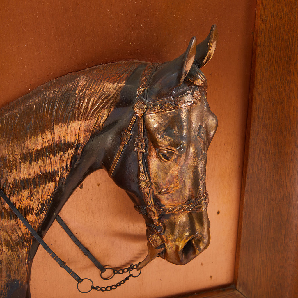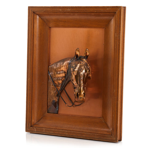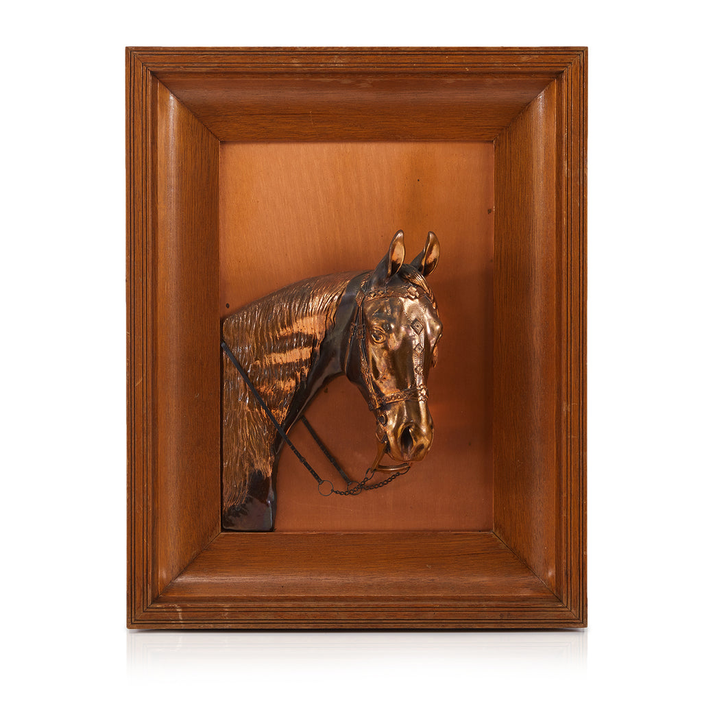 Details: Copper horse bust wall sculpture with wood frame Dimensions: 16" H x 15" W x 2"D Quantity: 1