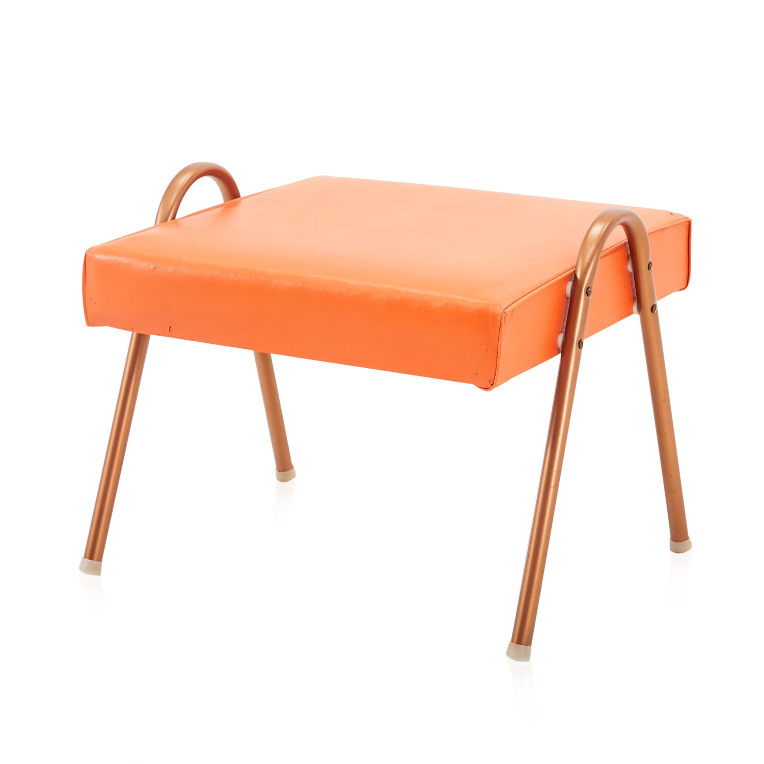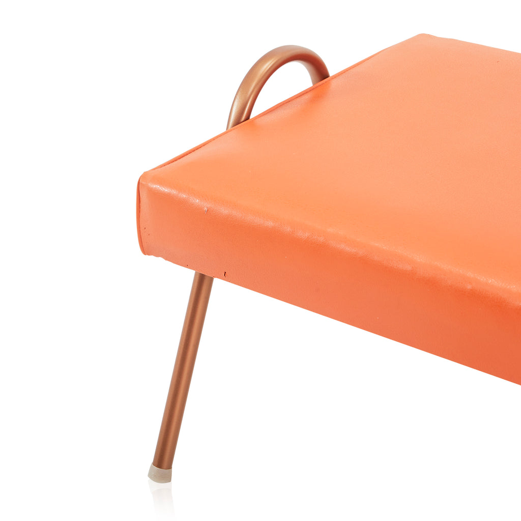 Details: Orange leather ottoman with bent aluminum copper color base Dimensions: 13" H x 16" W x 16" D Quantity: 1