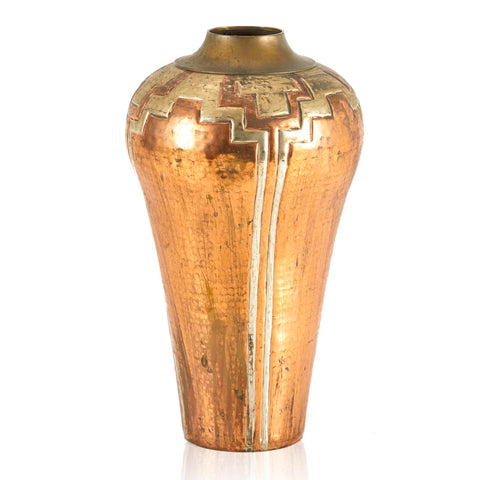 Details: Urn vase with metallic geometric pattern in gold, copper and bronze color Dimensions: 19" H x 9" W x 9" D