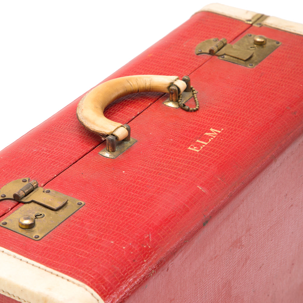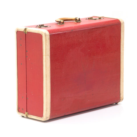 Details: Red Vinyl Suitcase with cream colored handle Dimensions: 19" H x 21" W x 9" D Quantity: 1