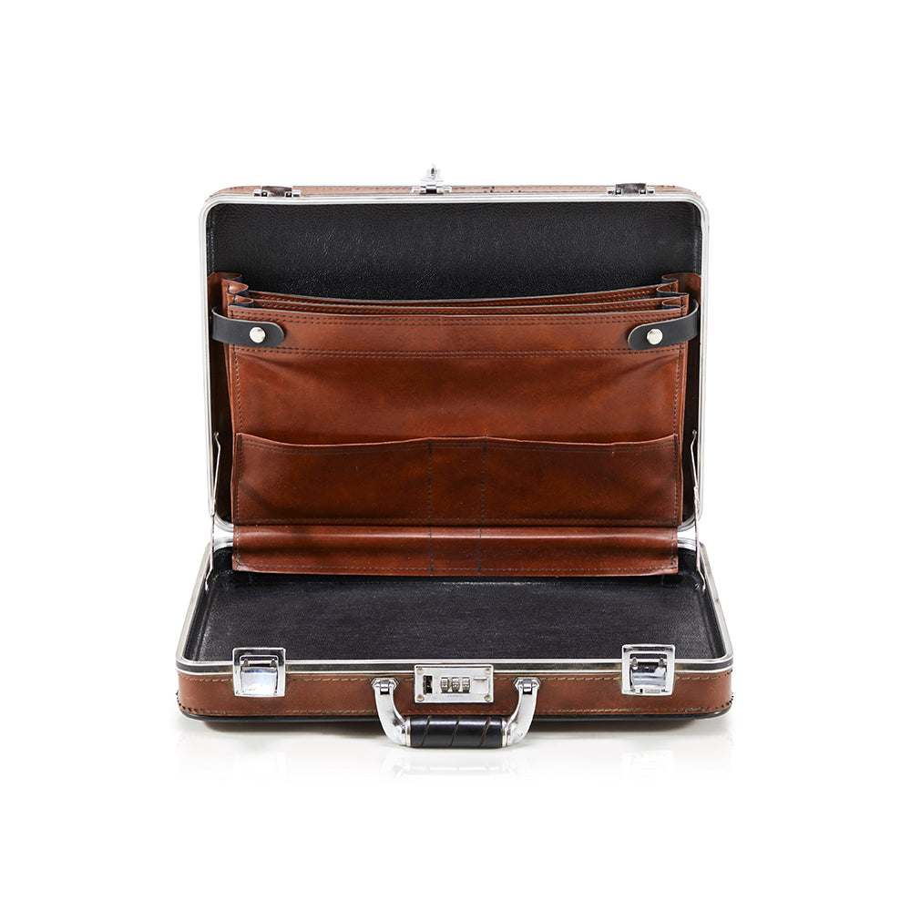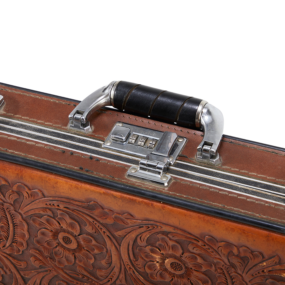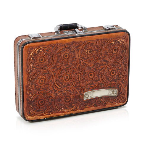 Details: Brown mid-century leather suitcase with floral engravings and combination lock Dimensions: 16" H x 19" W x 4" D Quantity: 1