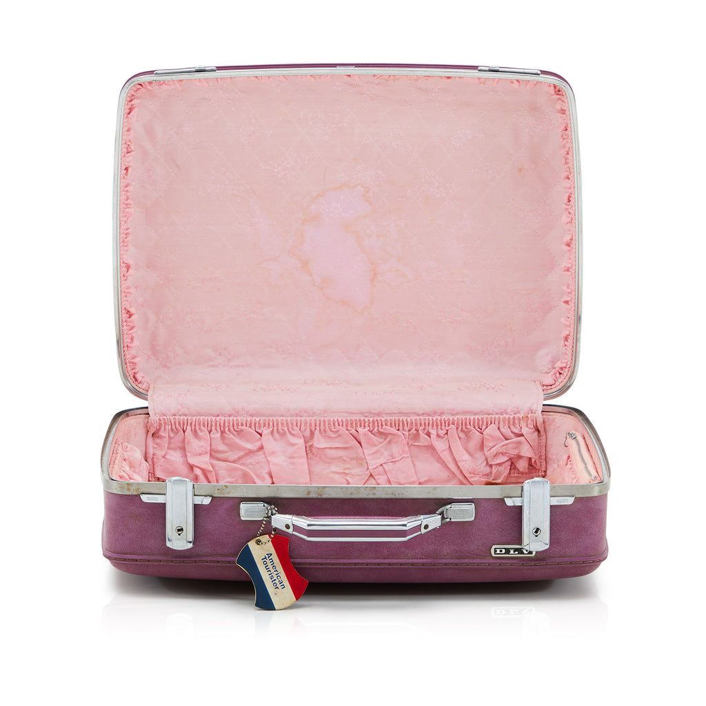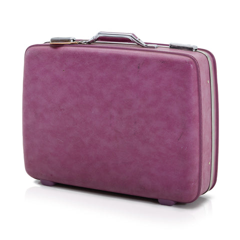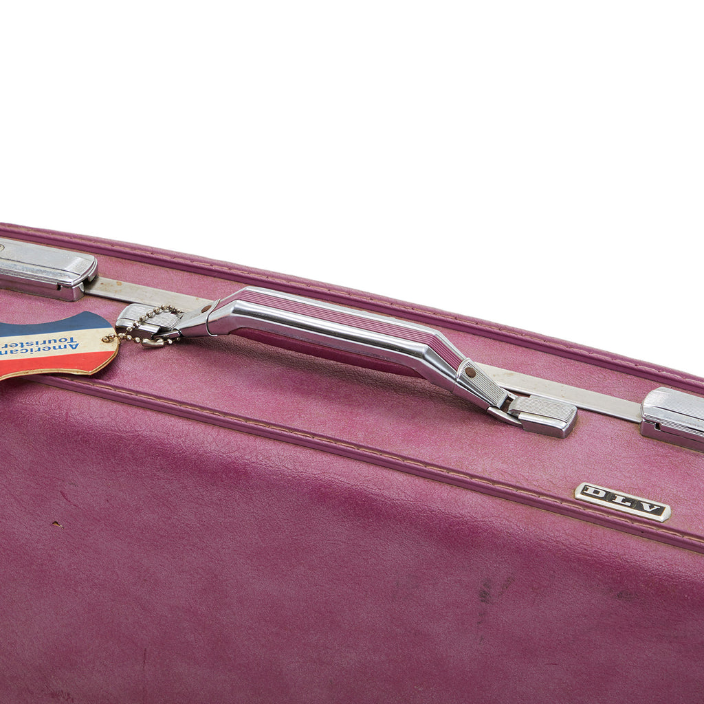Details: Vintage American Tourister small purple vinyl suitcase with pink interior Dimensions: 16" H x 20" W x 6" D Quantity: 1