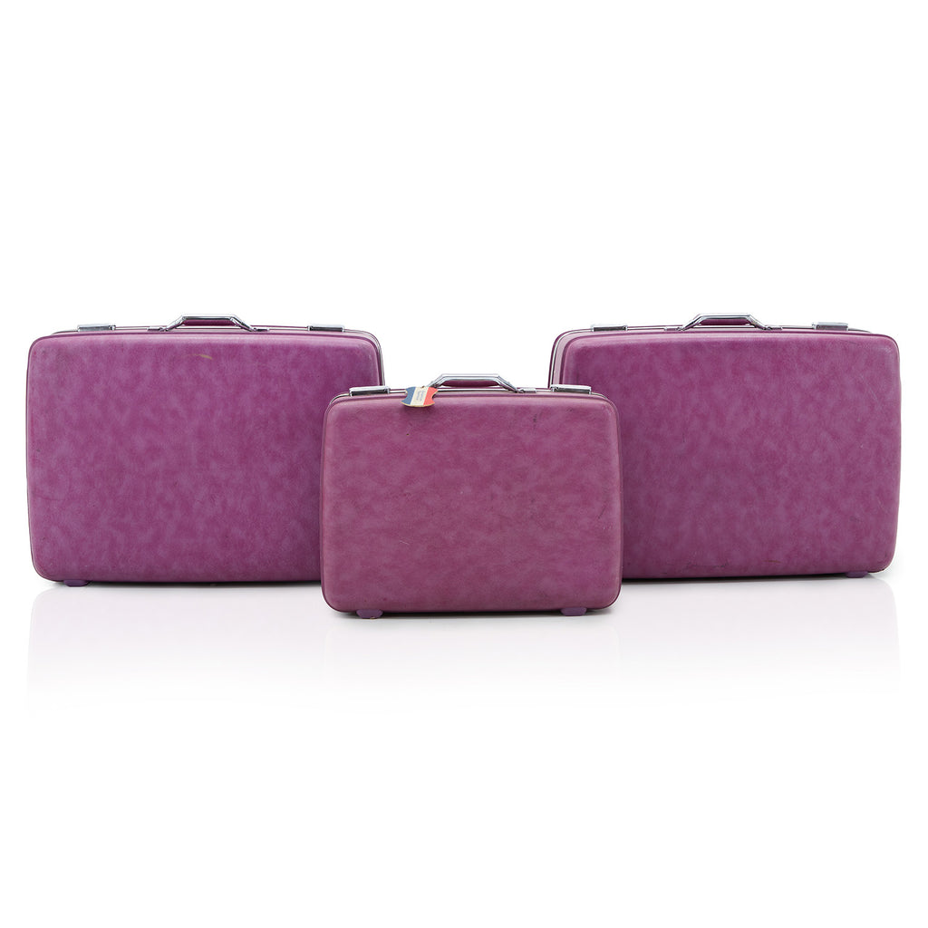 Details: Vintage pair of dappled purple vinyl suitcases from American Tourister with pink fabric interior Dimensions: 19" H x 26" W x 8" D Quantity: 2