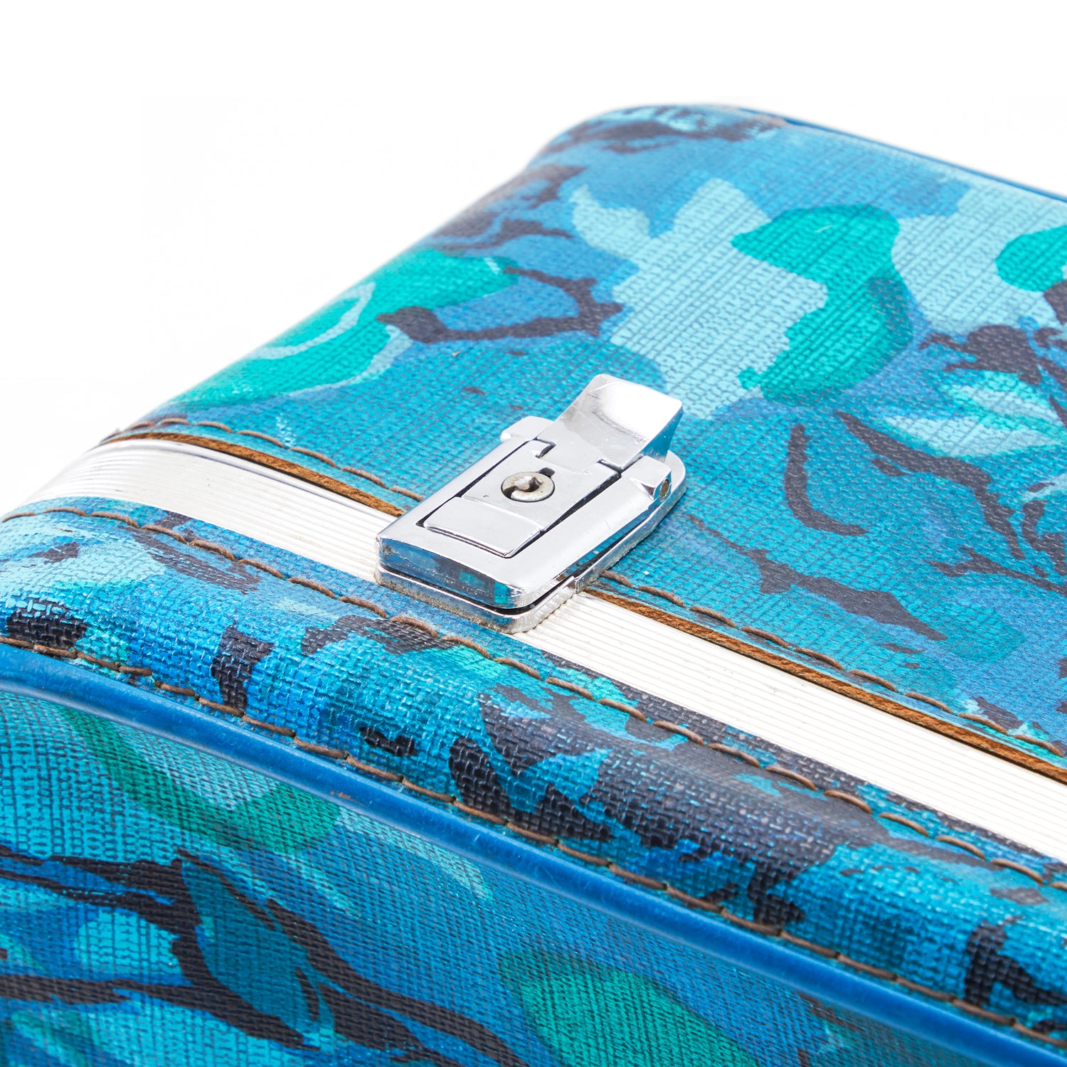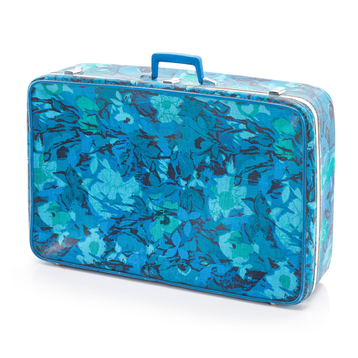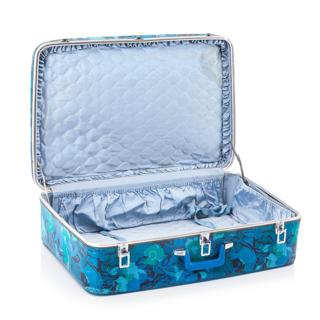 Details: Vintage 1960s blue floral suitcase Dimensions: 18.5" H x 25" W x 8" D Quantity: 1