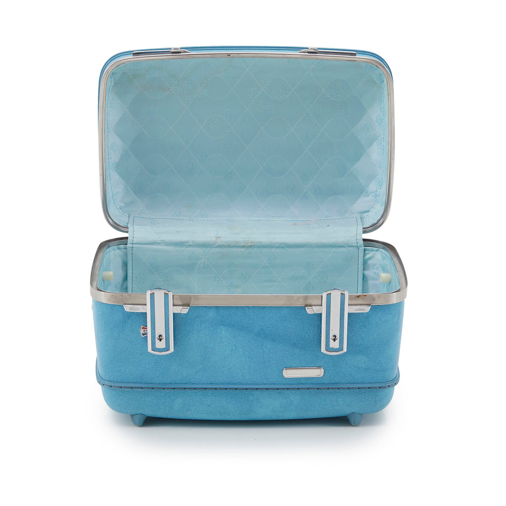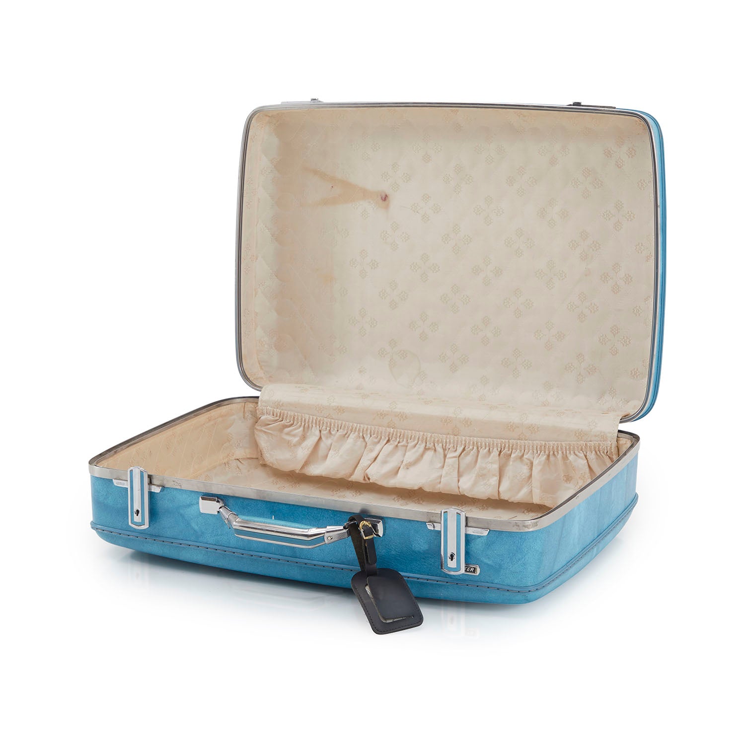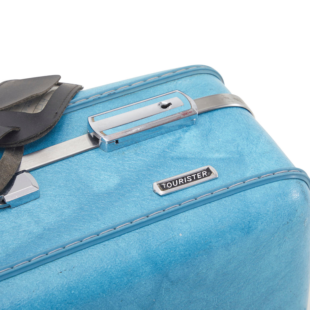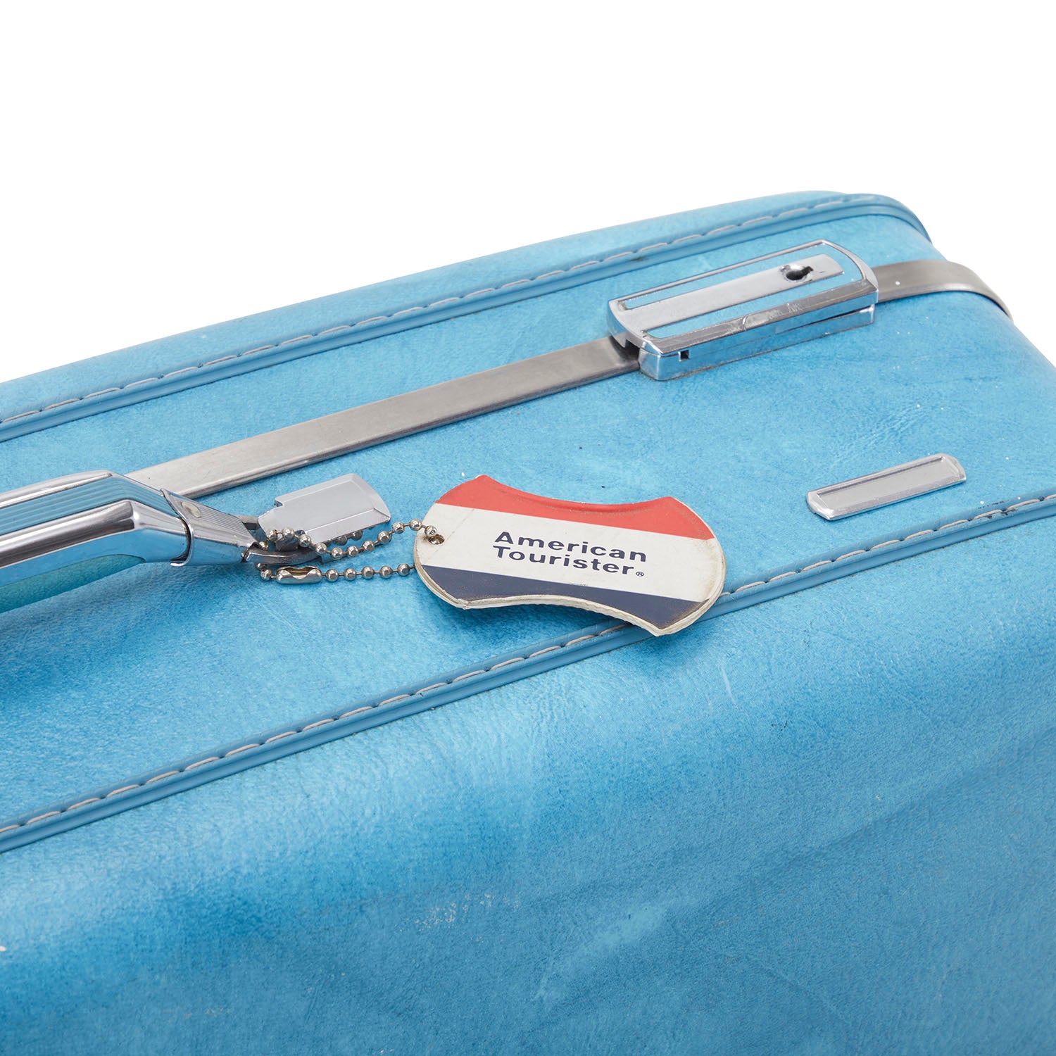 Details: Vintage American Tourister medium blue vinyl suitcase with white interior Dimensions: 18" H x 23" W x 7" D Quantity: 1
