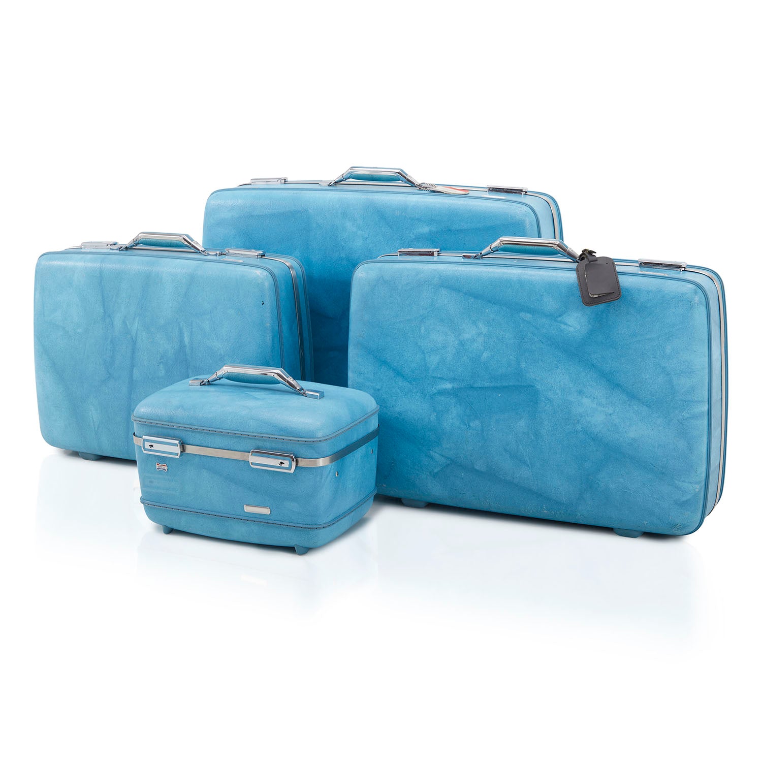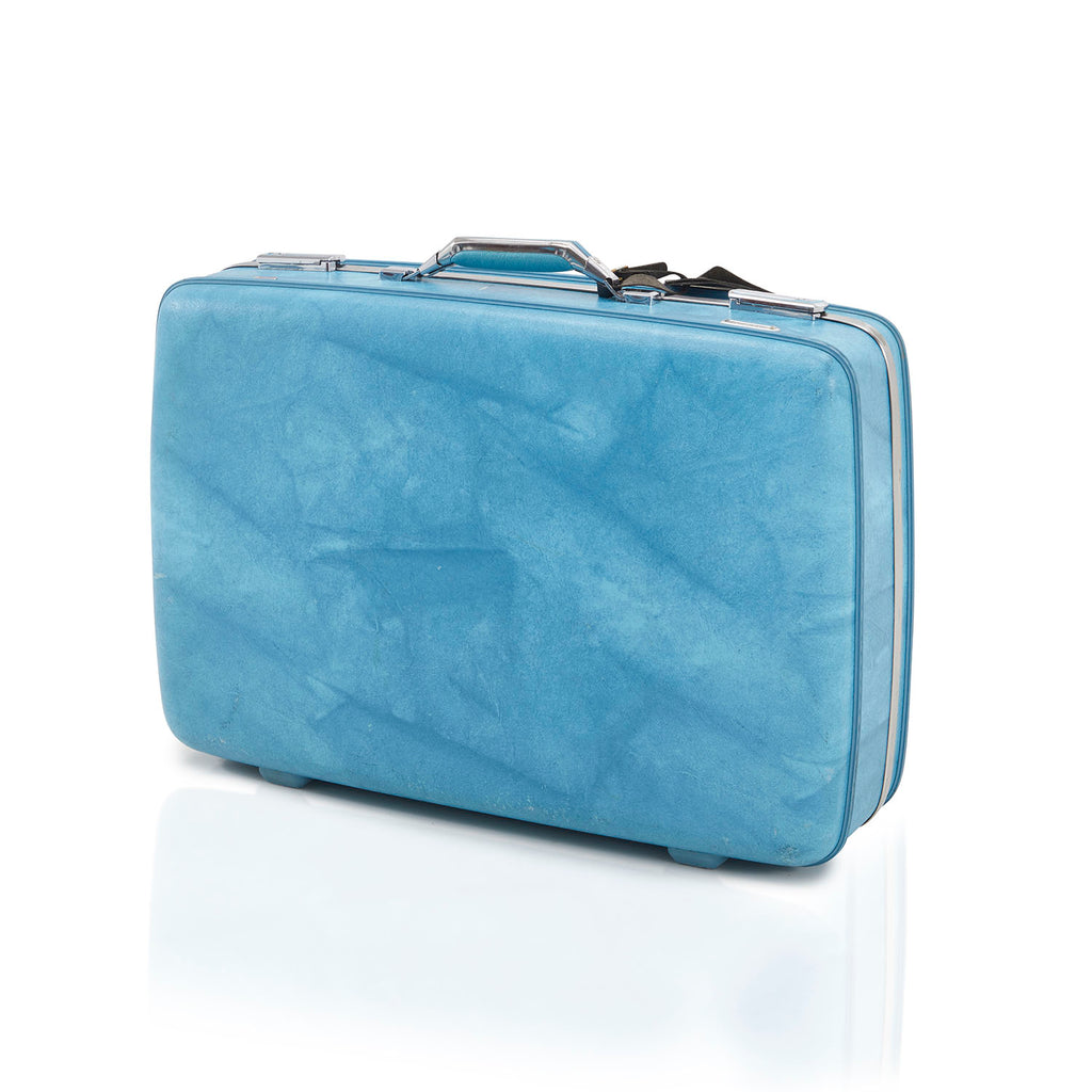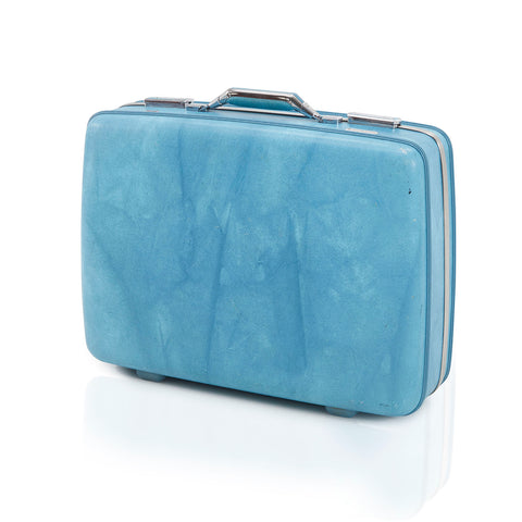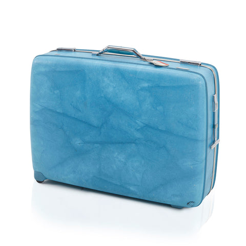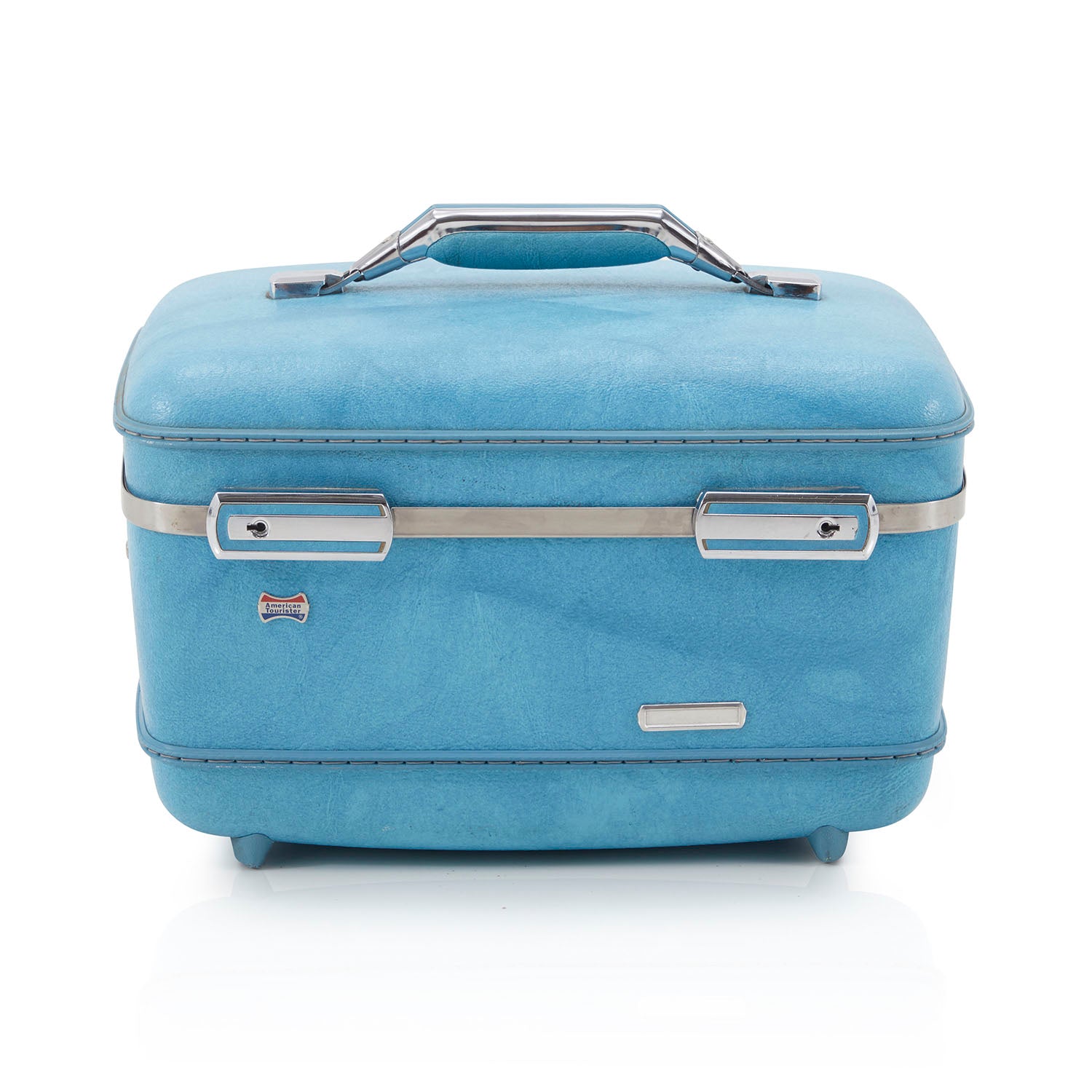 Details: Vintage American Tourister medium blue vinyl suitcase with white interior Dimensions: 18" H x 23" W x 7" D Quantity: 1