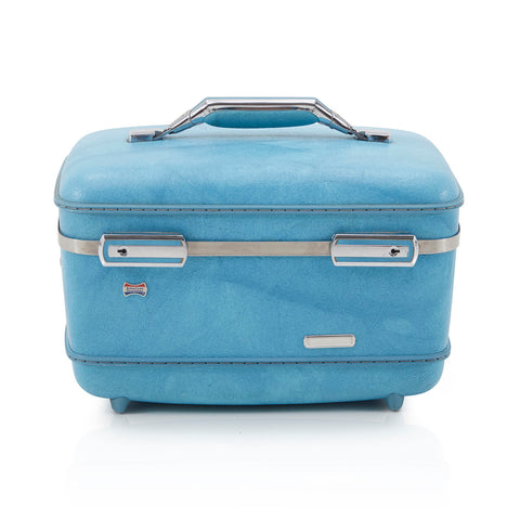 Details: Vintage American Tourister medium blue vinyl suitcase with white interior Dimensions: 18" H x 20" W x 7" D Quantity: 1