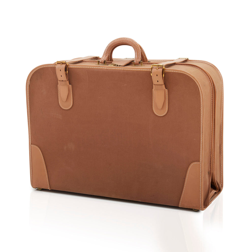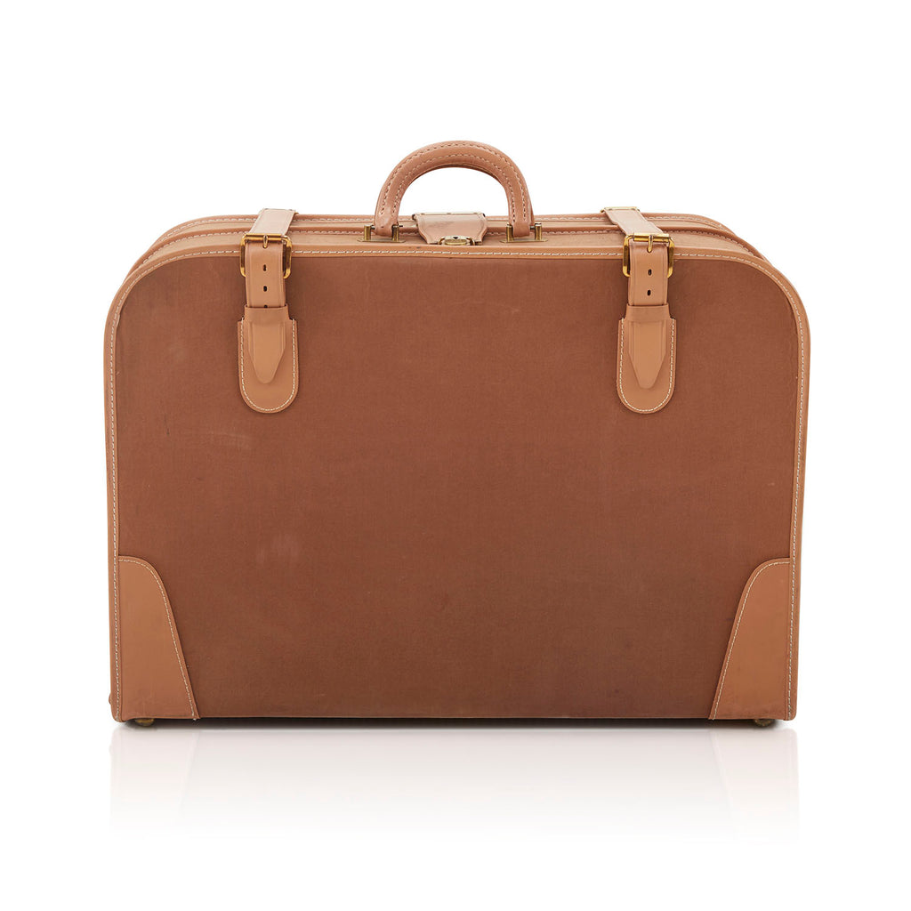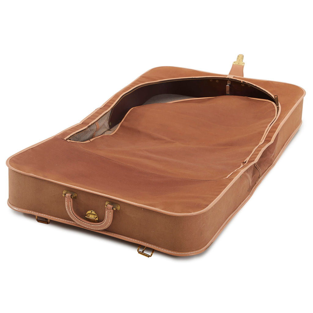Details: Canvas travel garment bag with leather straps and handles Dimensions: 15" H x 24" W x 10" D