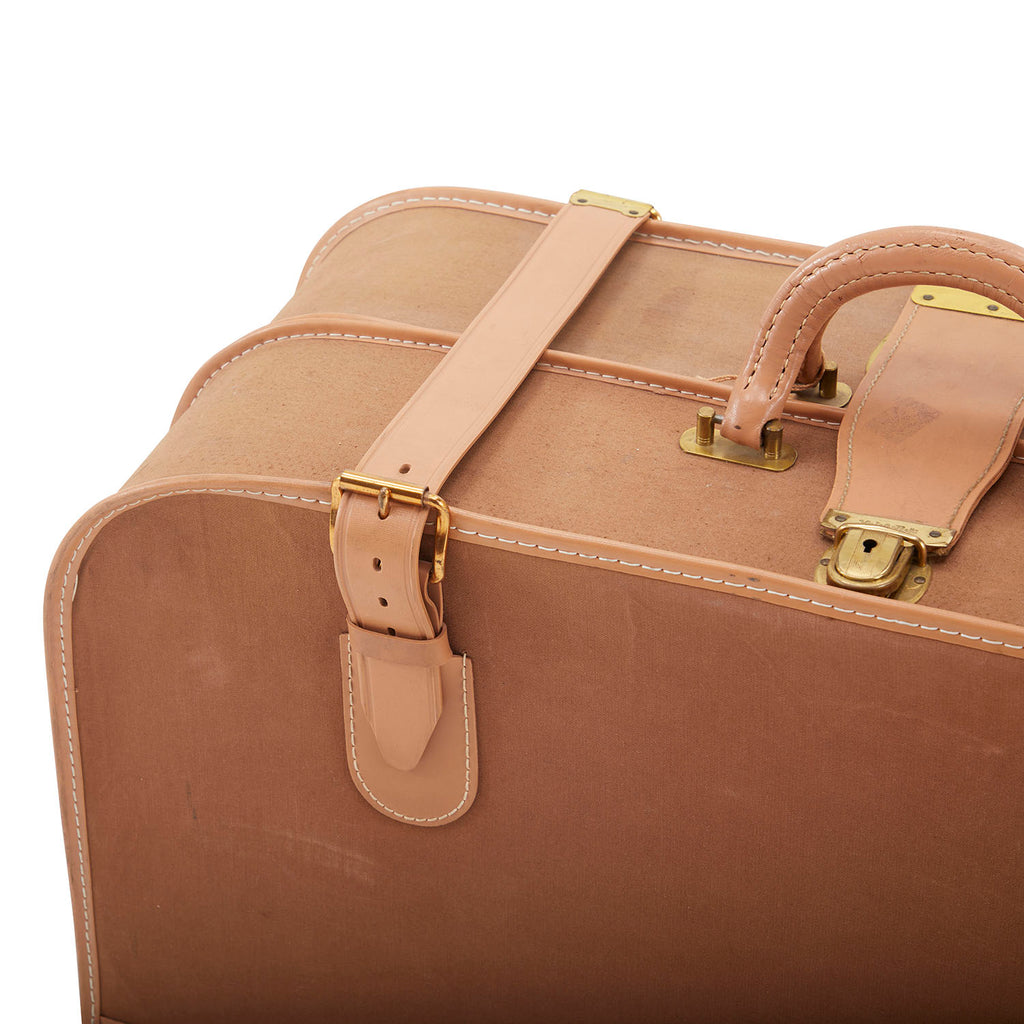 Details: Small vintage orange leather suitcase with matching larger piece Dimensions: 18.5" H x 26.5" W x 10.5" D Quantity: 1