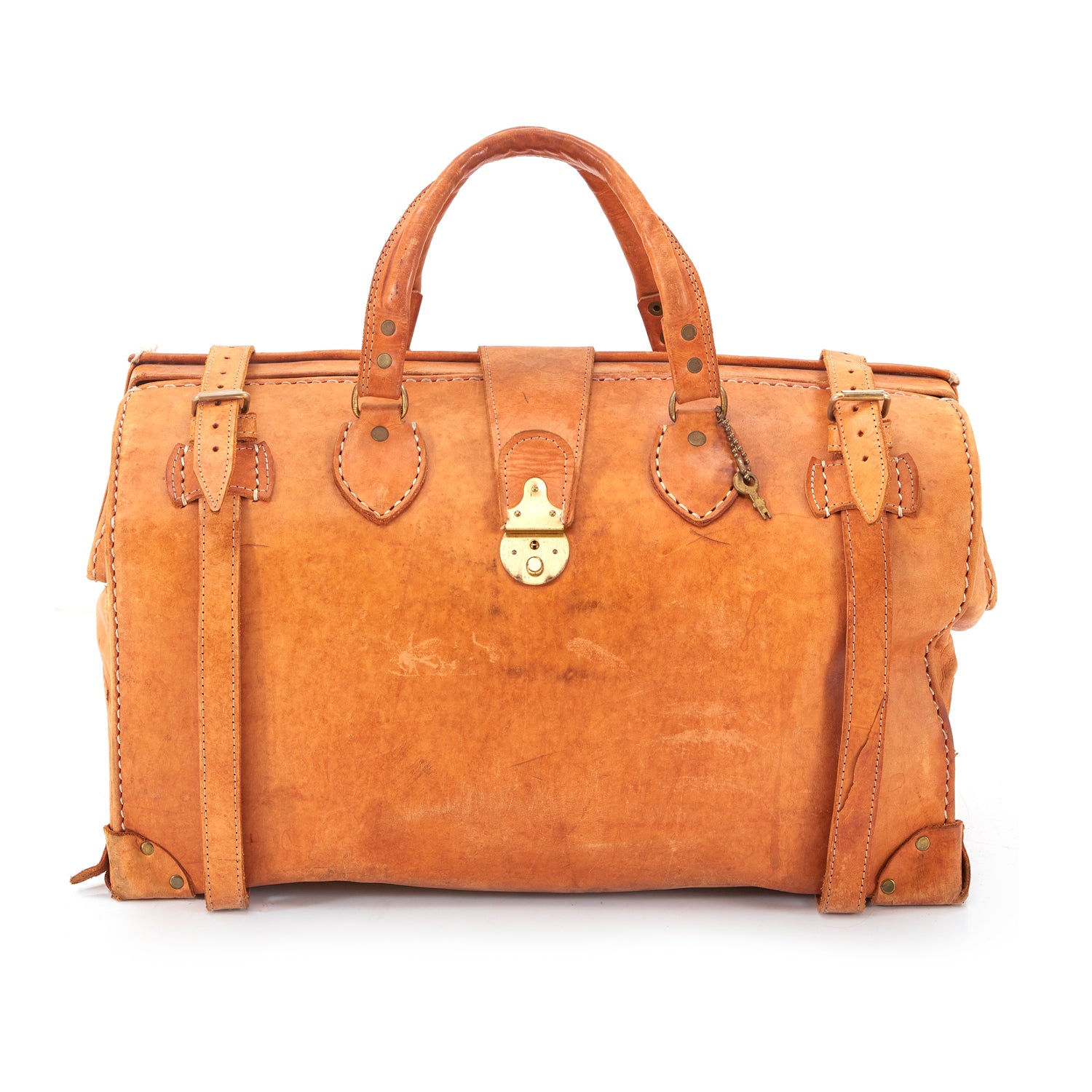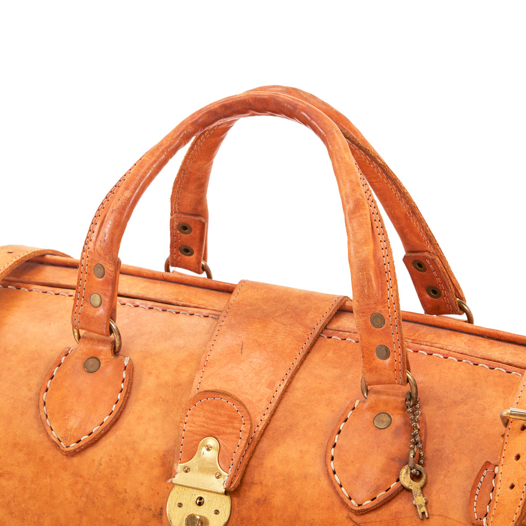 Details: Light worn vintage leather duffle bag with leather straps and metal buckle Dimensions: 11" H x 19.5" W x 13" D Quantity: 1