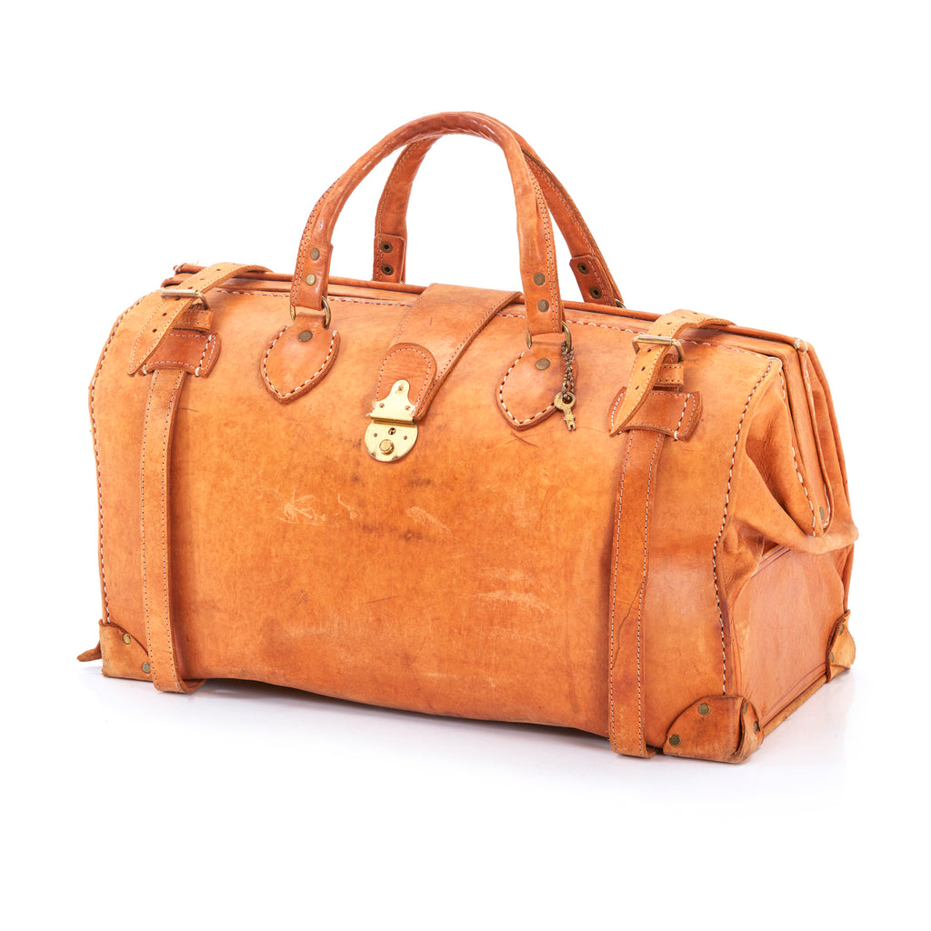 Details: Leather garment travel bag with light brown straps Dimensions: 21" H x 22" W x 9.5" D Quantity: 1