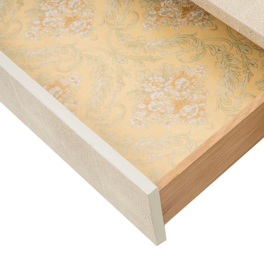 Details: Bedside table with white leather exterior and three drawers Dimensions: 28.5" H x 18" W x 18" D Quantity: 2